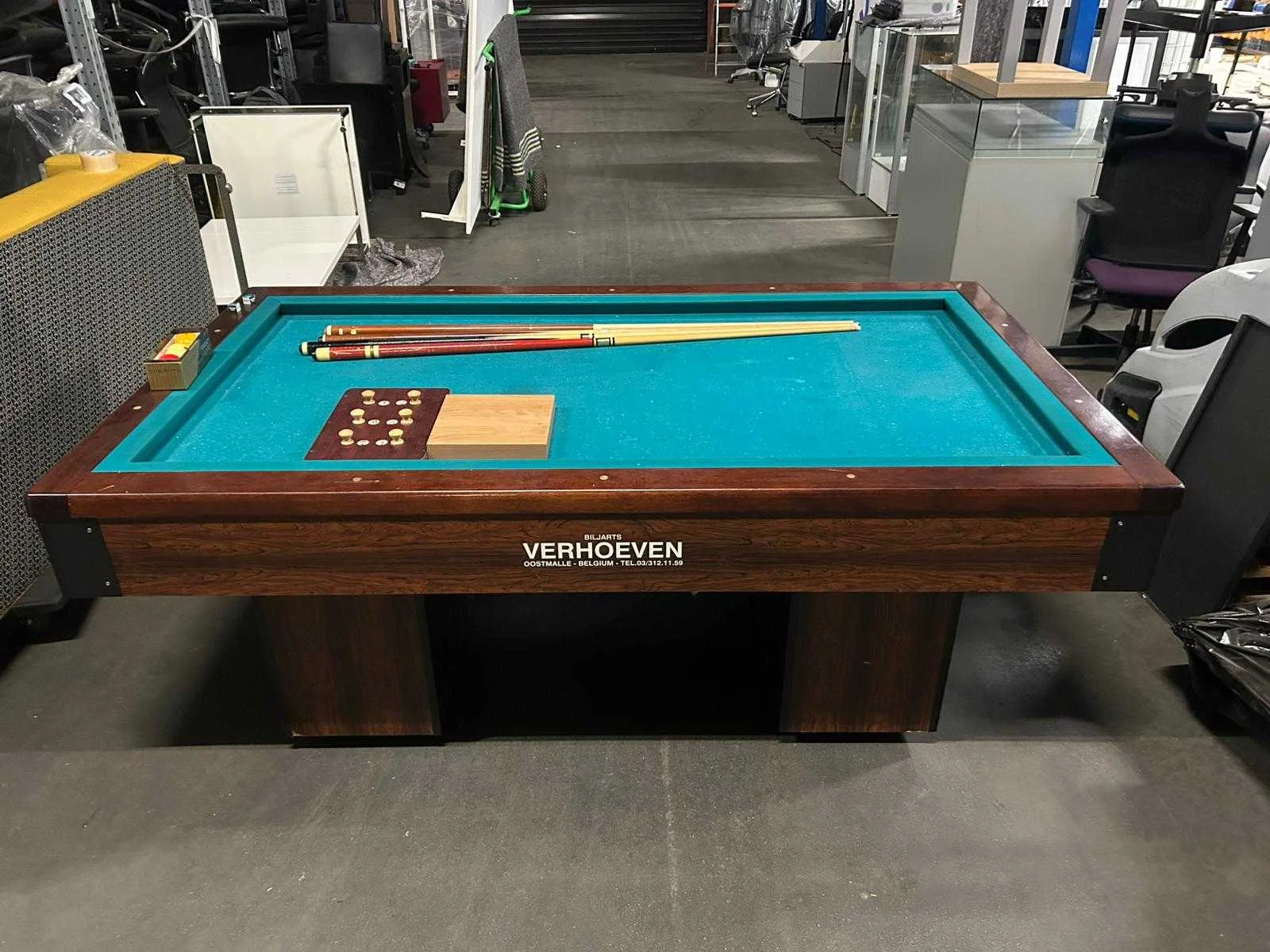 Algemene informatie Merk: Verhoeven Herkomst: Oostmalle, België Categorie: Sport & ontspanning / Horeca-inrichting Technische specificaties Speelveld: ca. 200 × 100 cm (standaard carambolemaat) Materiaal blad: Leisteen, bekleed met vilt (blauwgroen) Materiaal kast en poten: Houtfineer met donkere mahonie-look Poten: 2 massieve sokkelpoten Verwarming: Aanwezig Accessoires inbegrepen: 2 keus 1 set caramboleballen (rood, geel, wit met stip) Scorebord / telstenen Nee Merk: VERHOEVEN Kleur: Blauw / Donker hout Gewicht: 95 Lengte: 207 Breedte: 116 Hoogte: 78 Materiaal: Hout