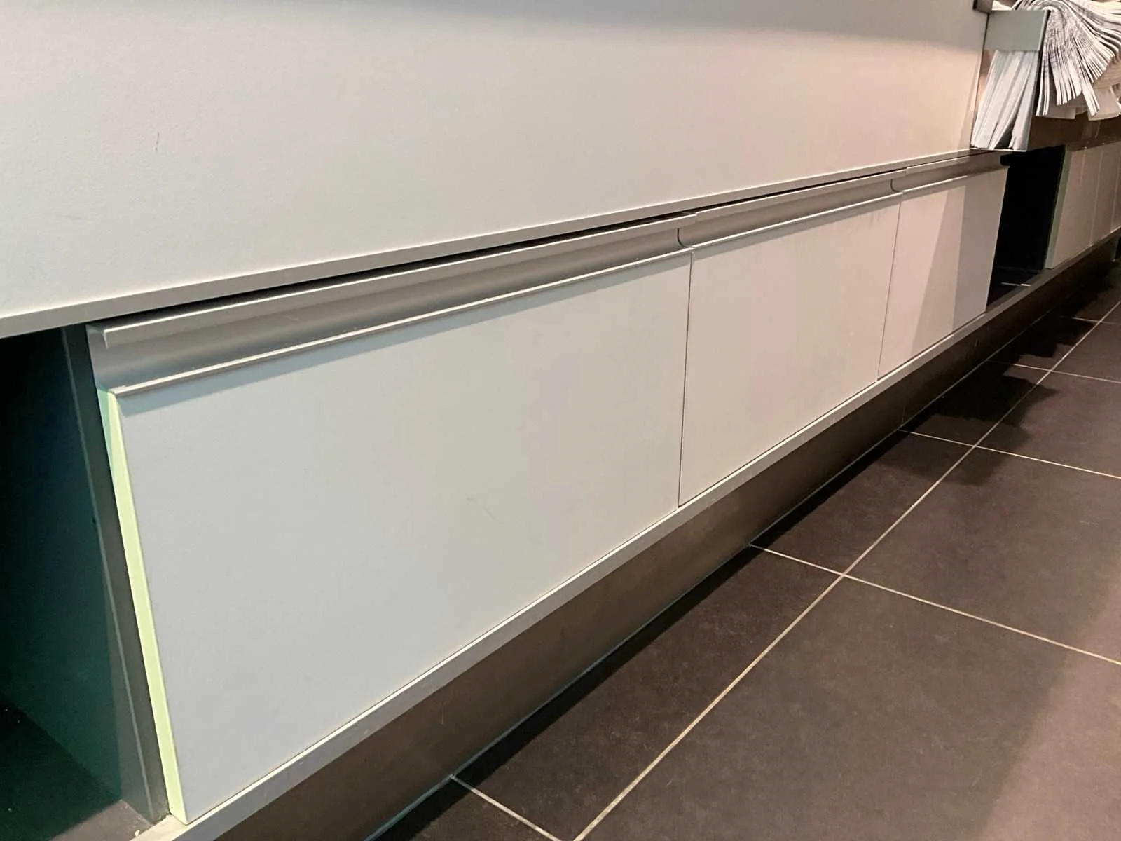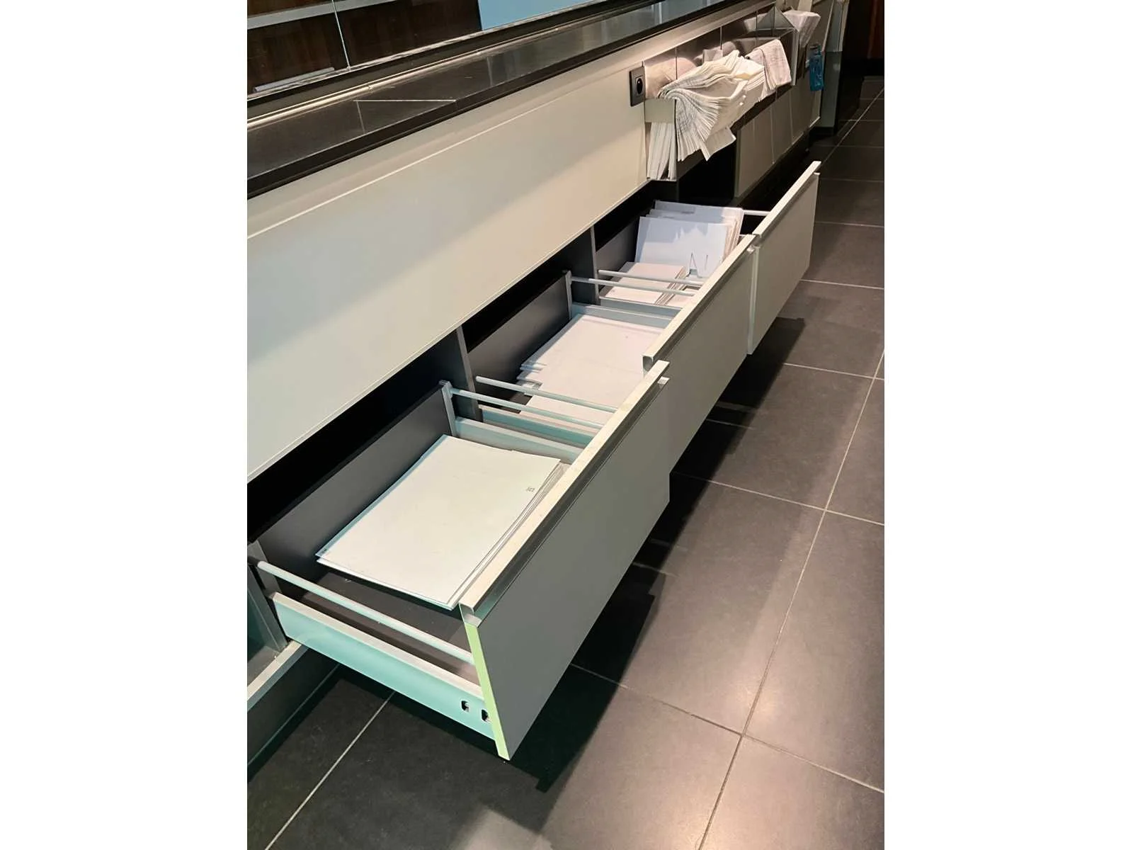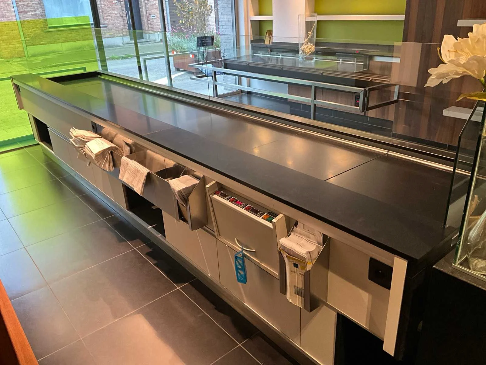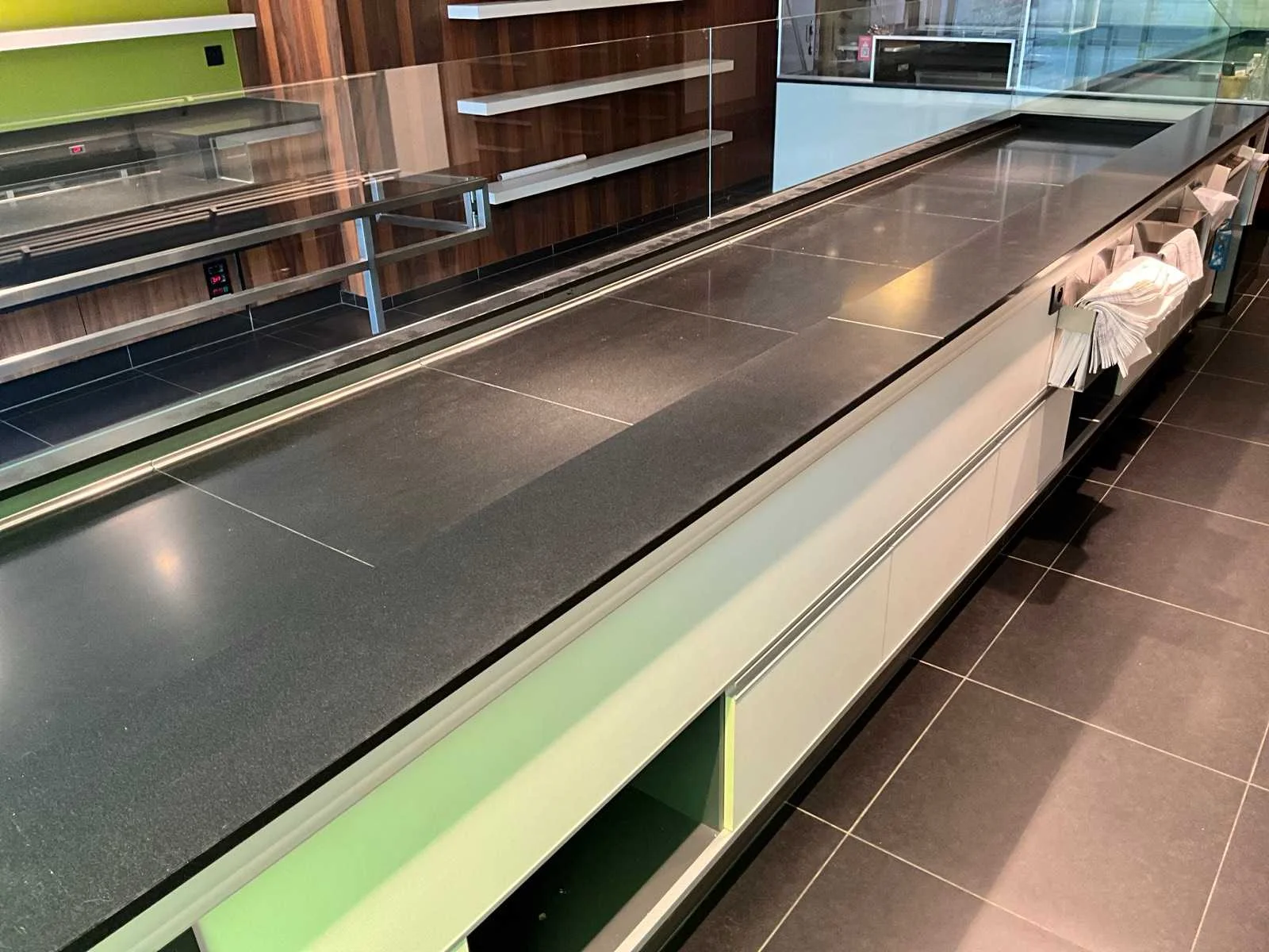 Gekoelde toonbank met werkblad uit natuursteen, 3 zones, opbergruimte onderaan digitale uitlezing: ja inclusief: externe koelmotor toonbank is 1 geheel! No Merk: Frigomil Afmeting l: 1120mm Afmeting b: 5200mm Afmeting h: 900mm Aantal laden: 3 Totale afmeting L: 5300mm Totale afmeting Breedte: 1200mm Totale afmeting Hoogte: 1350mm