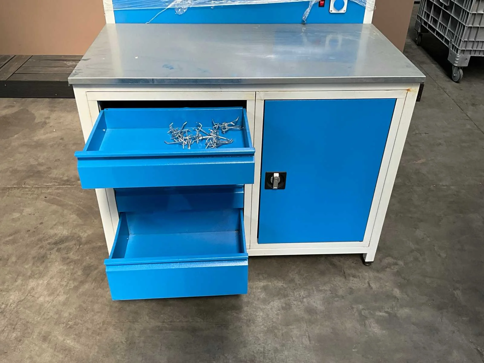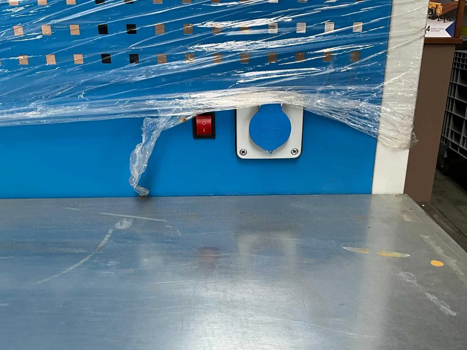 Nieuwe werkbank in metaal. Kleur grijs/blauw. Voorzien van schakelaar met lamp alsook een stopcontact. Nee Breedte: 1200mm Lengte: 670mm Hoogte: 2070mm Materiaal: Metaal