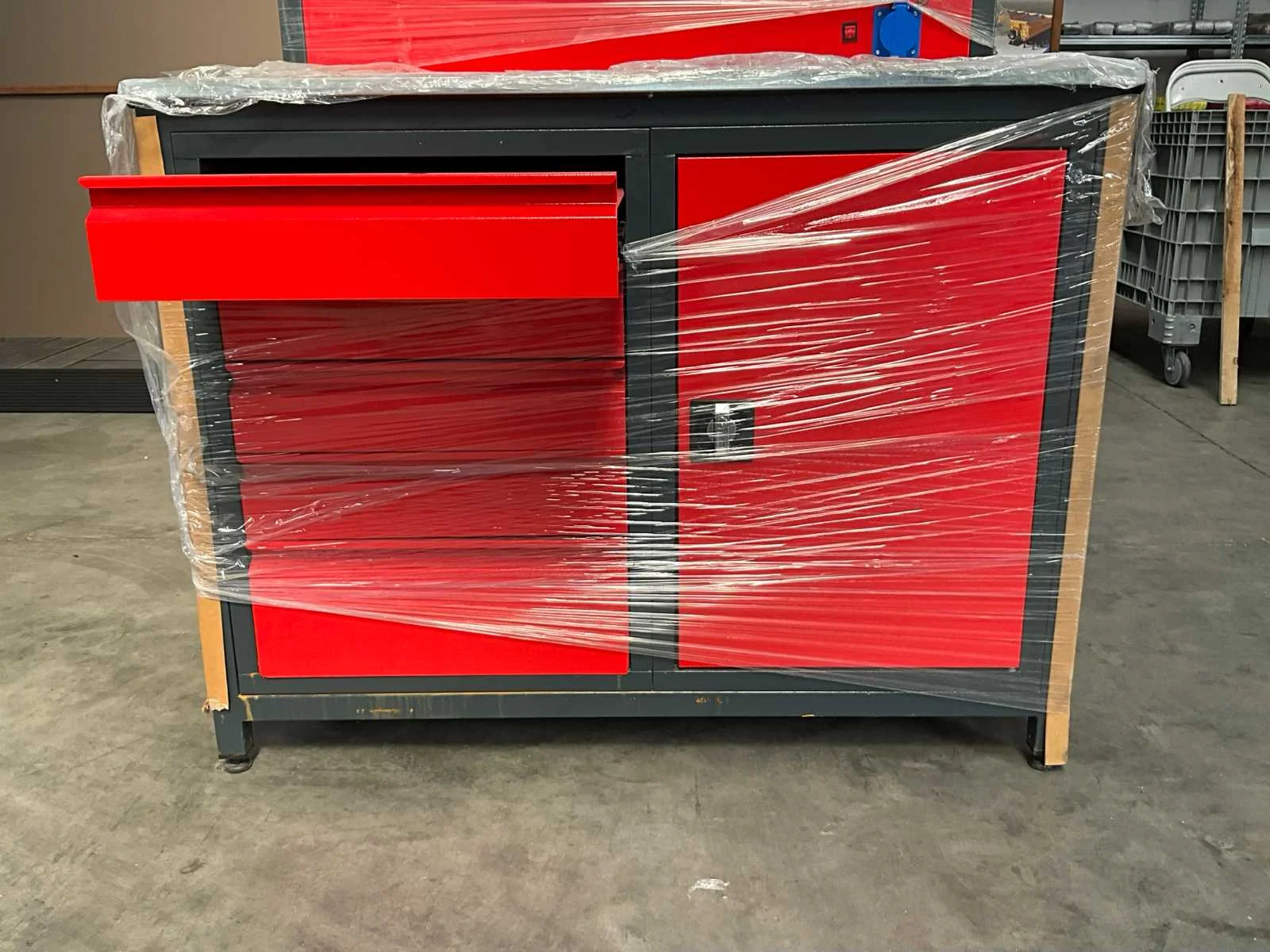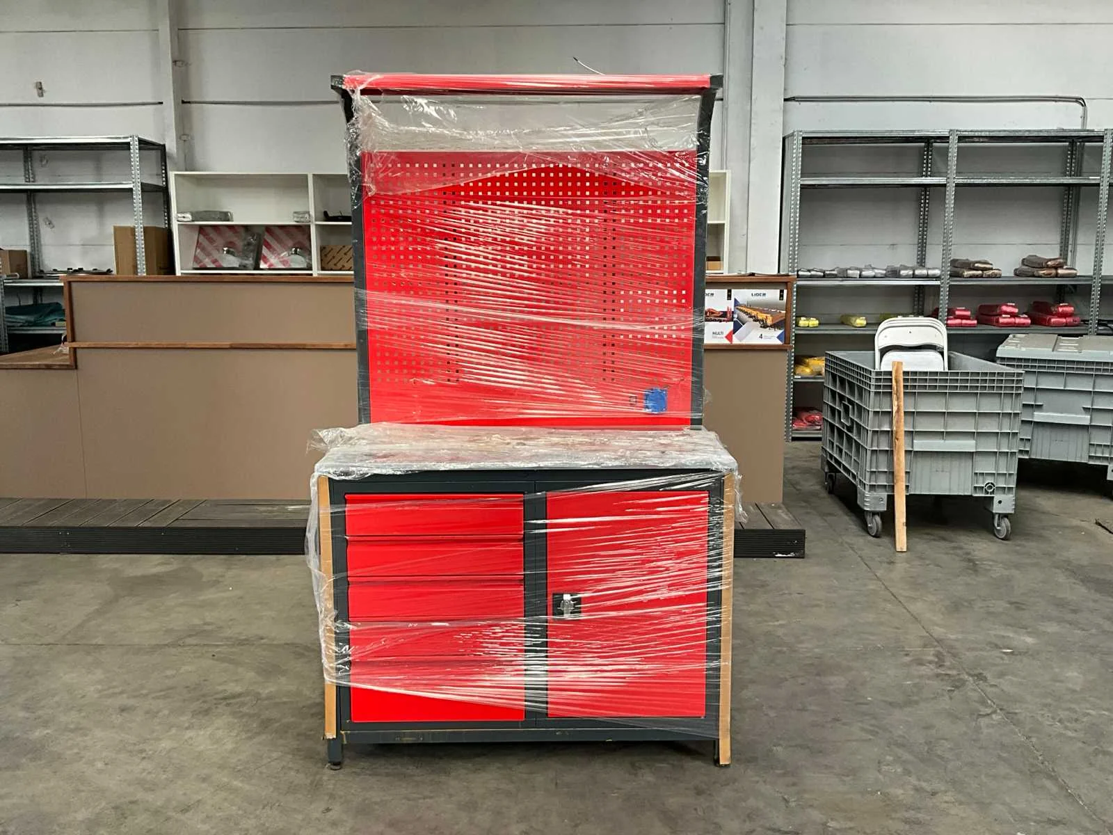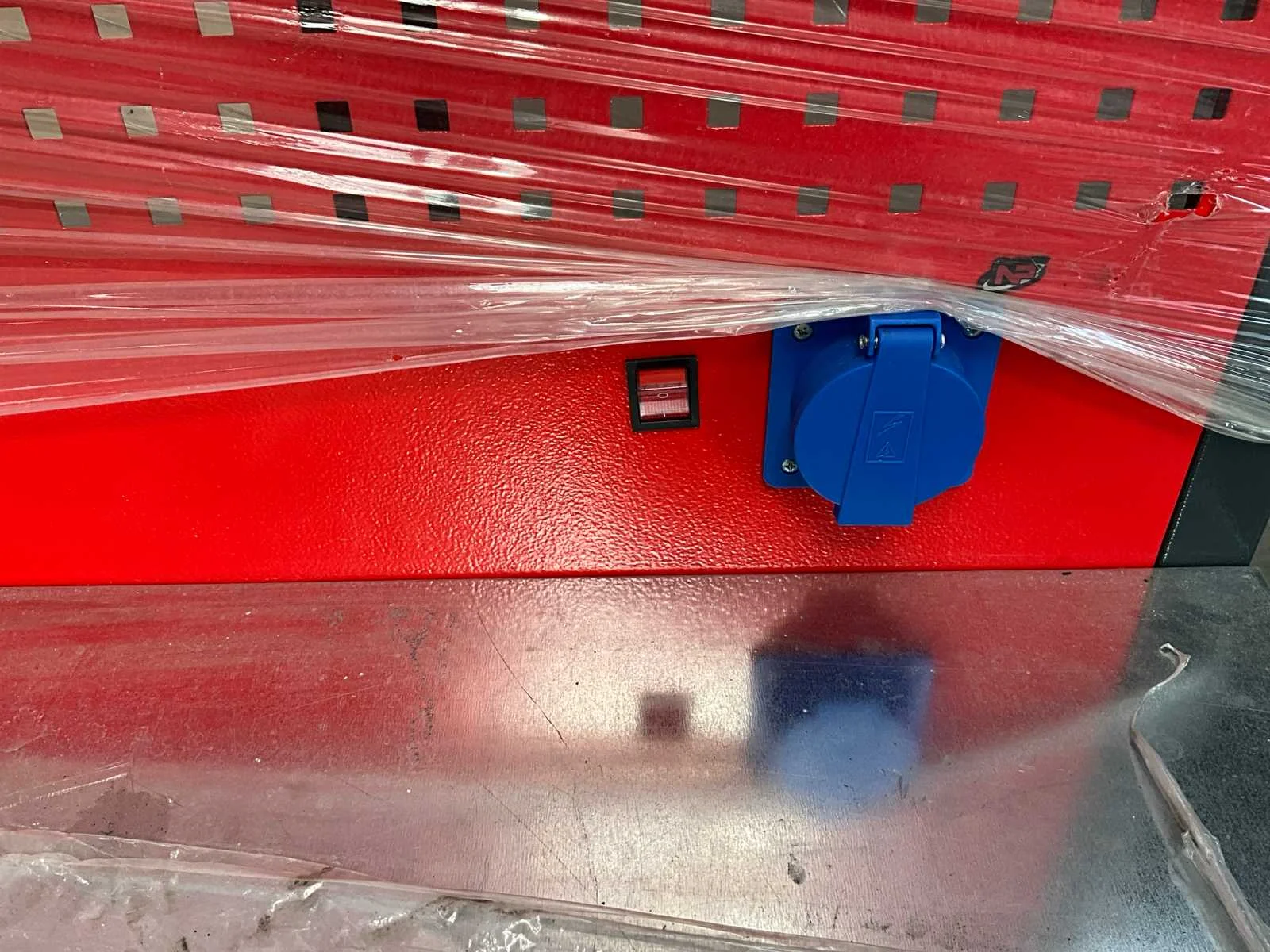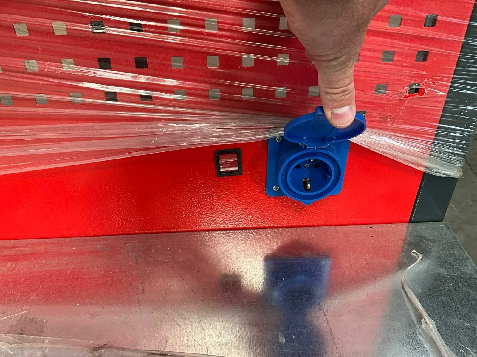 Nieuwe werkbank in metaal. Kleur zwart/rood. Voorzien van schakelaar met lamp alsook een stopcontact. Nee Breedte: 1200mm Lengte: 670mm Hoogte: 2070mm Materiaal: Metaal