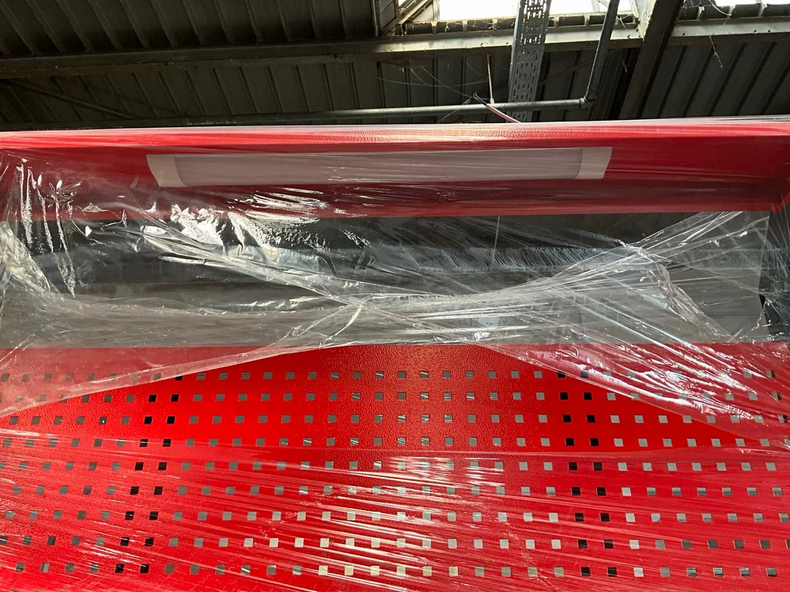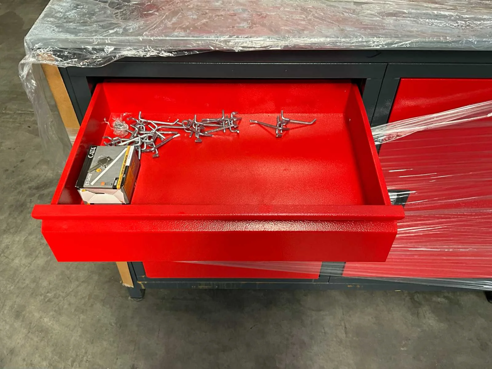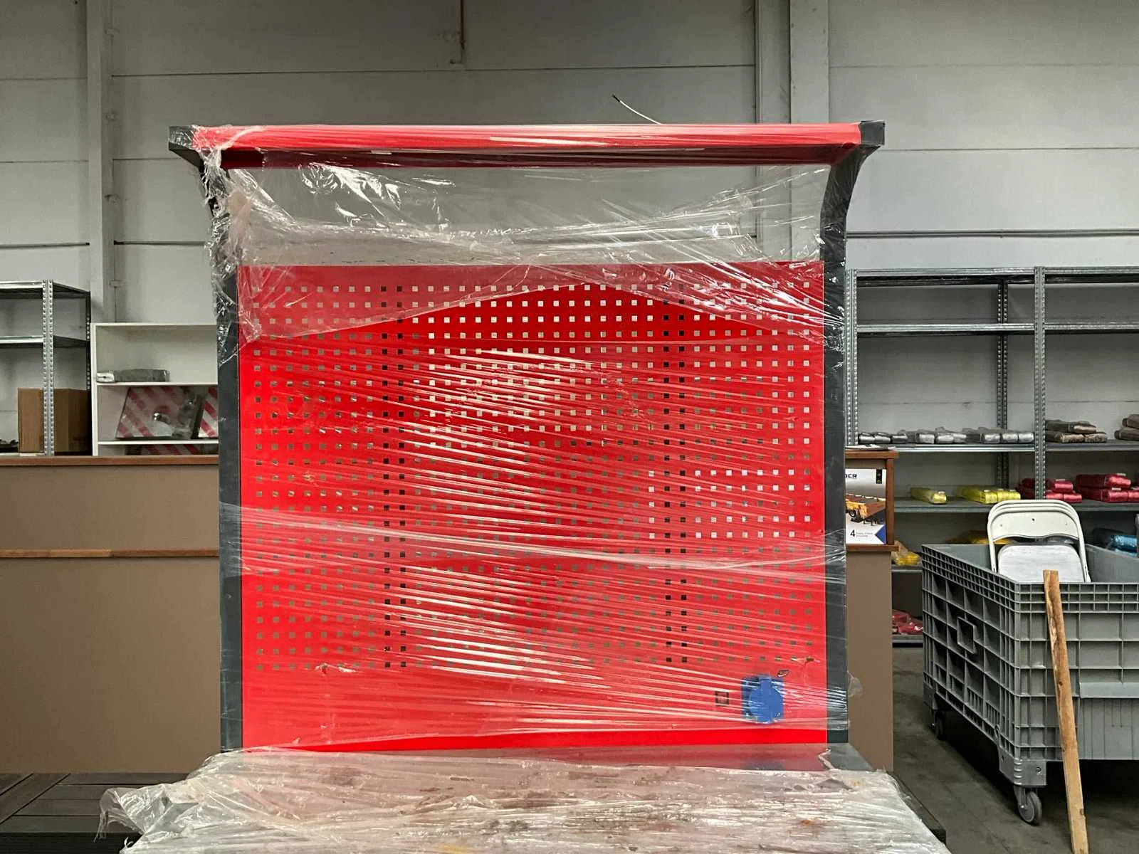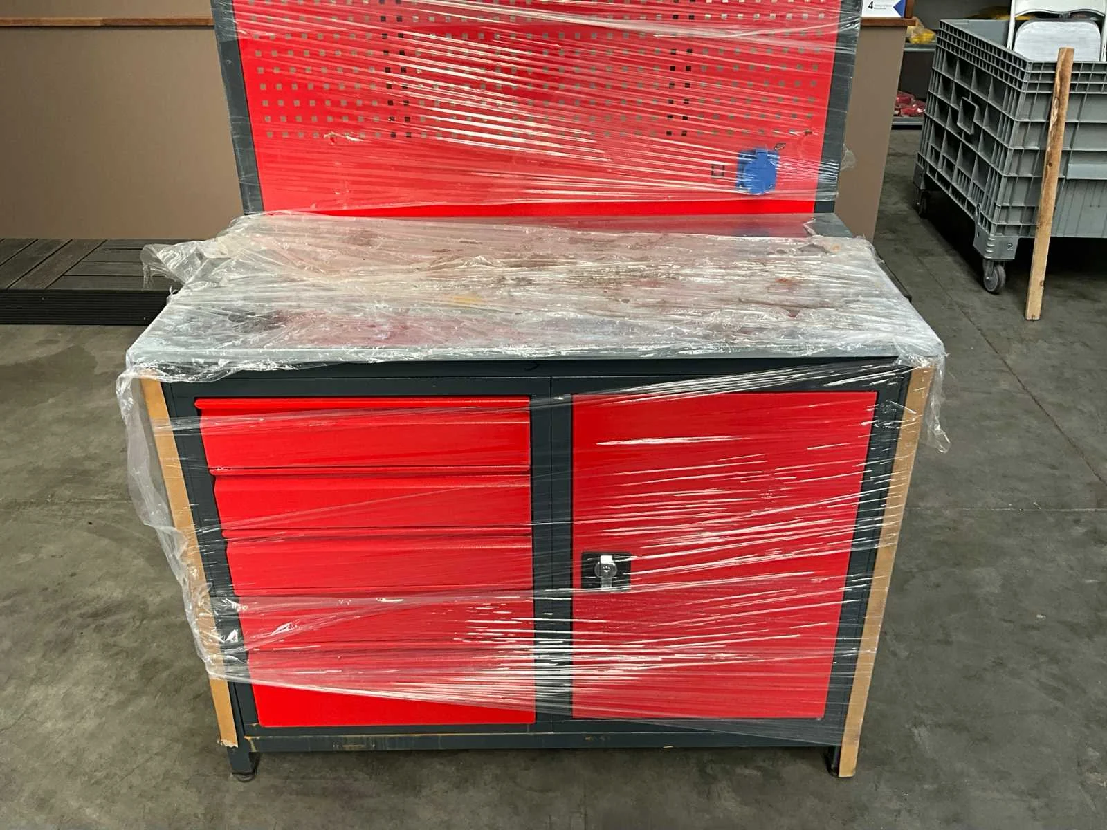Nieuwe werkbank in metaal. Kleur zwart/rood. Voorzien van schakelaar met lamp alsook een stopcontact. Nee Breedte: 1200mm Lengte: 670mm Hoogte: 2070mm Materiaal: Metaal