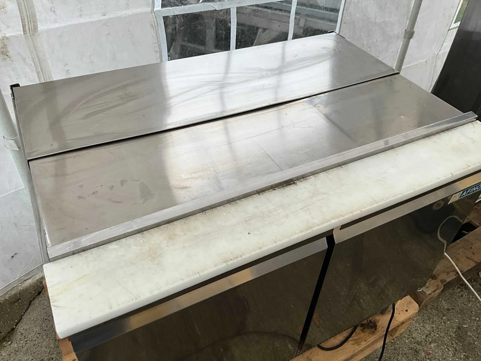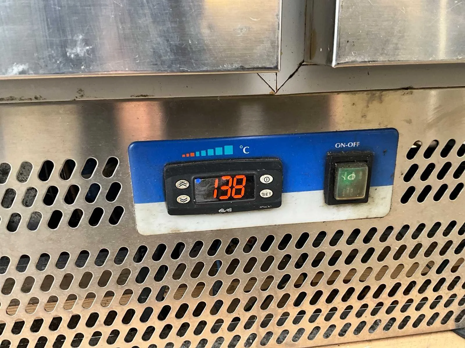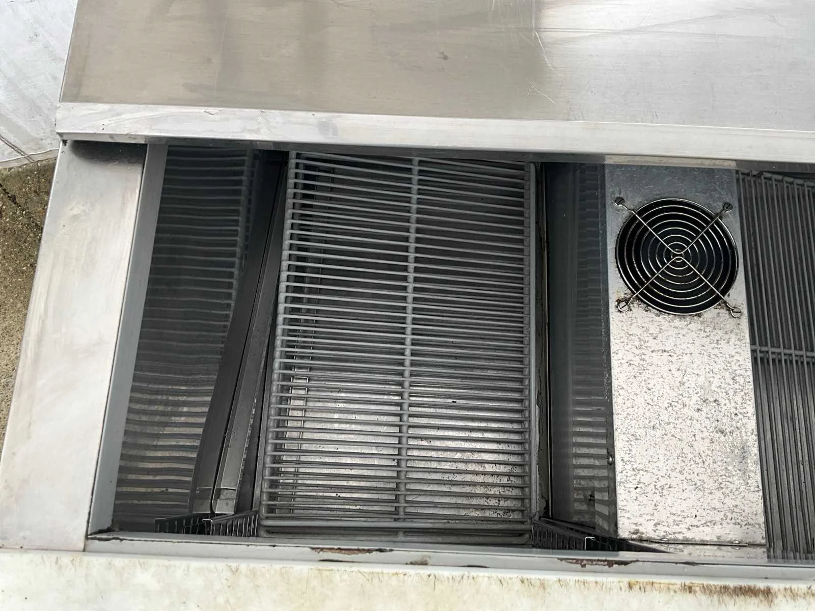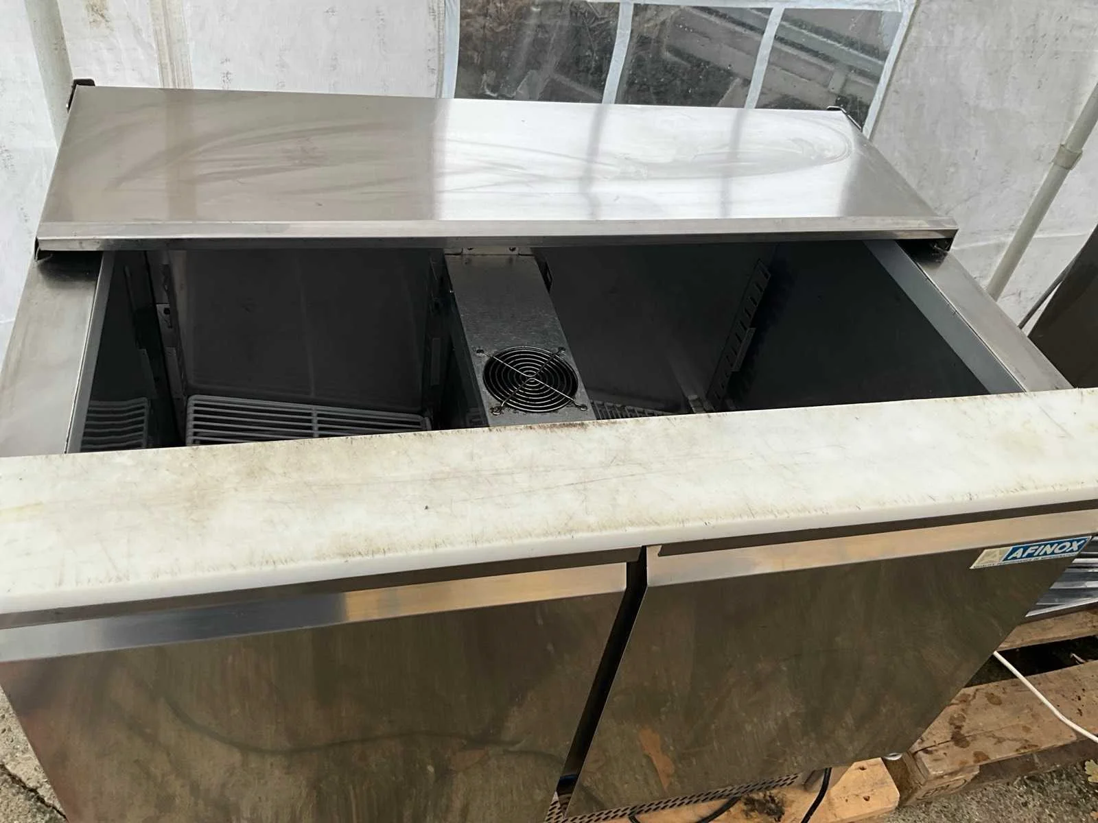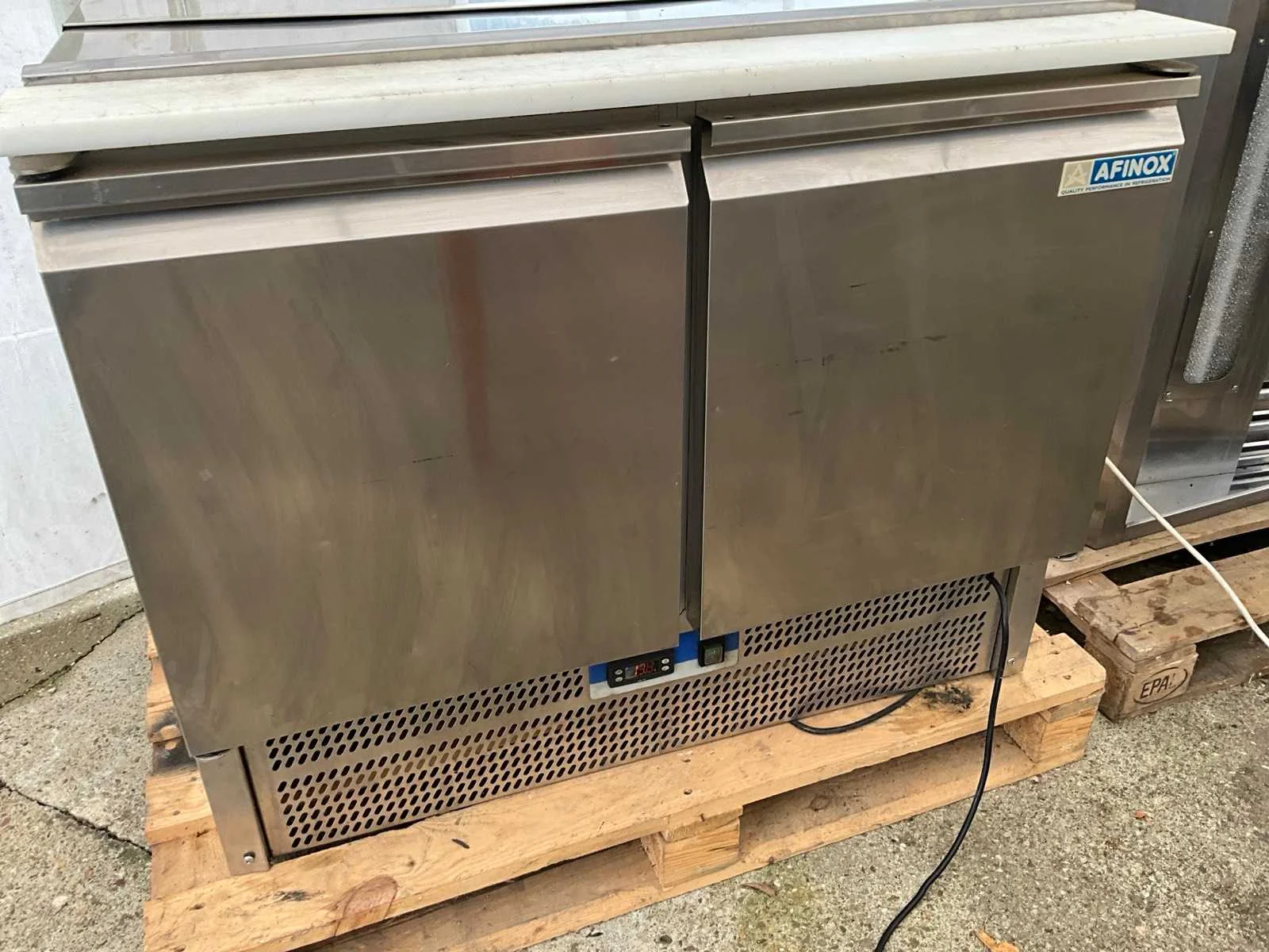 Professionele gekoelde werktafel / saladette van het merk Afinox (Italië) - Voorzien van twee RVS-deuren, een koelcompartiment onderaan en een bovenblad met uitsparing voor GN-bakken (gastronorm) - Aan de voorzijde is een kunststof werkblad gemonteerd, ideaal voor het bereiden van broodjes, salades of pizza’s - De koeling is elektronisch regelbaar via een digitaal bedieningspaneel en werkt op 230V - wat gebruikssporen maar werkende staat Nee Totale afmeting L: 1000mm Totale afmeting Breedte: 700mm Totale afmeting Hoogte: 810mm