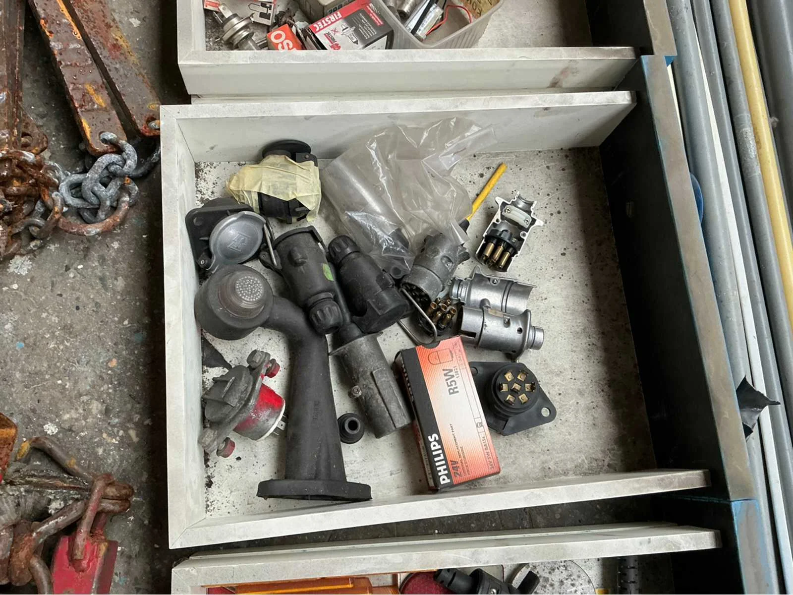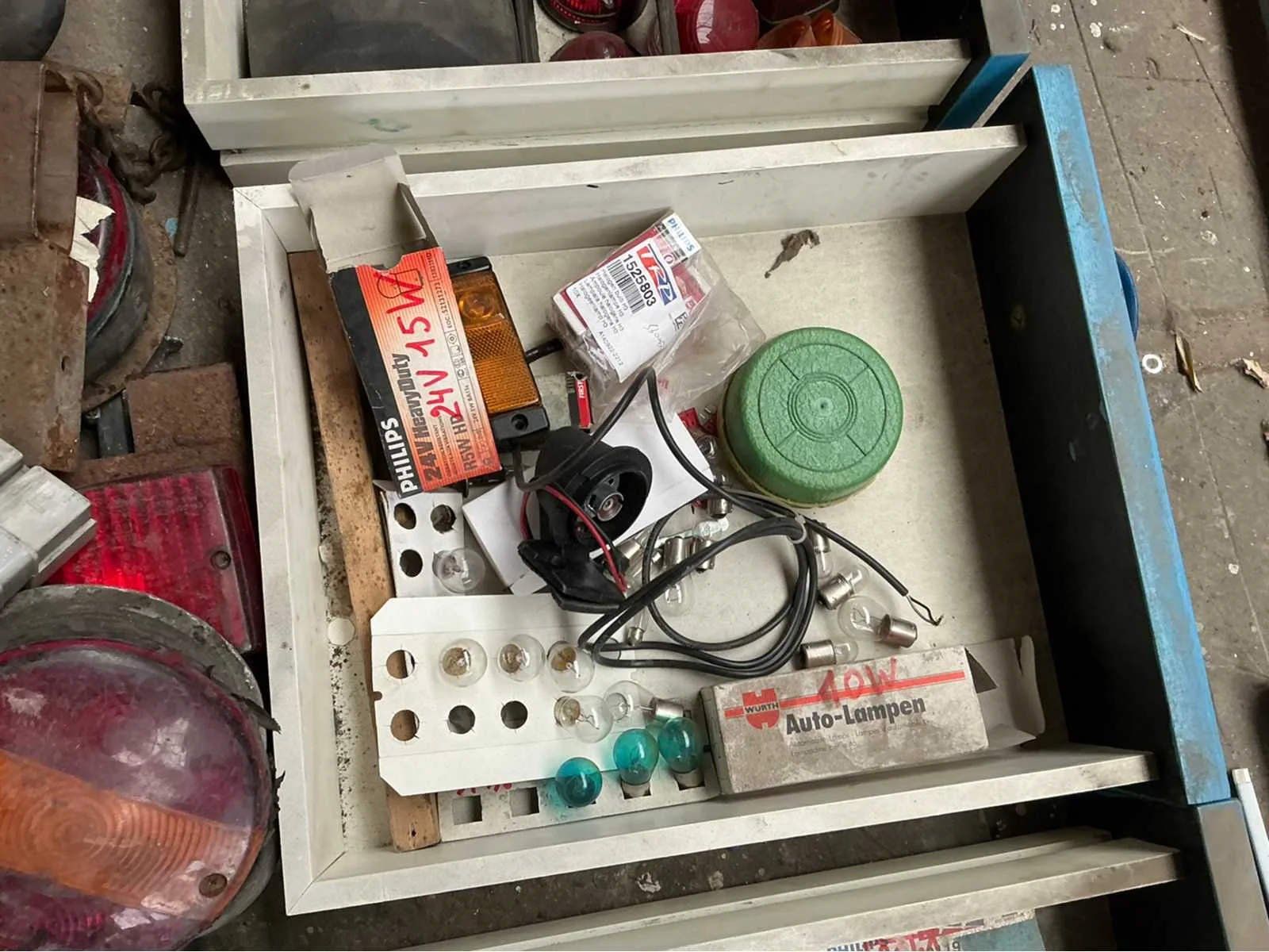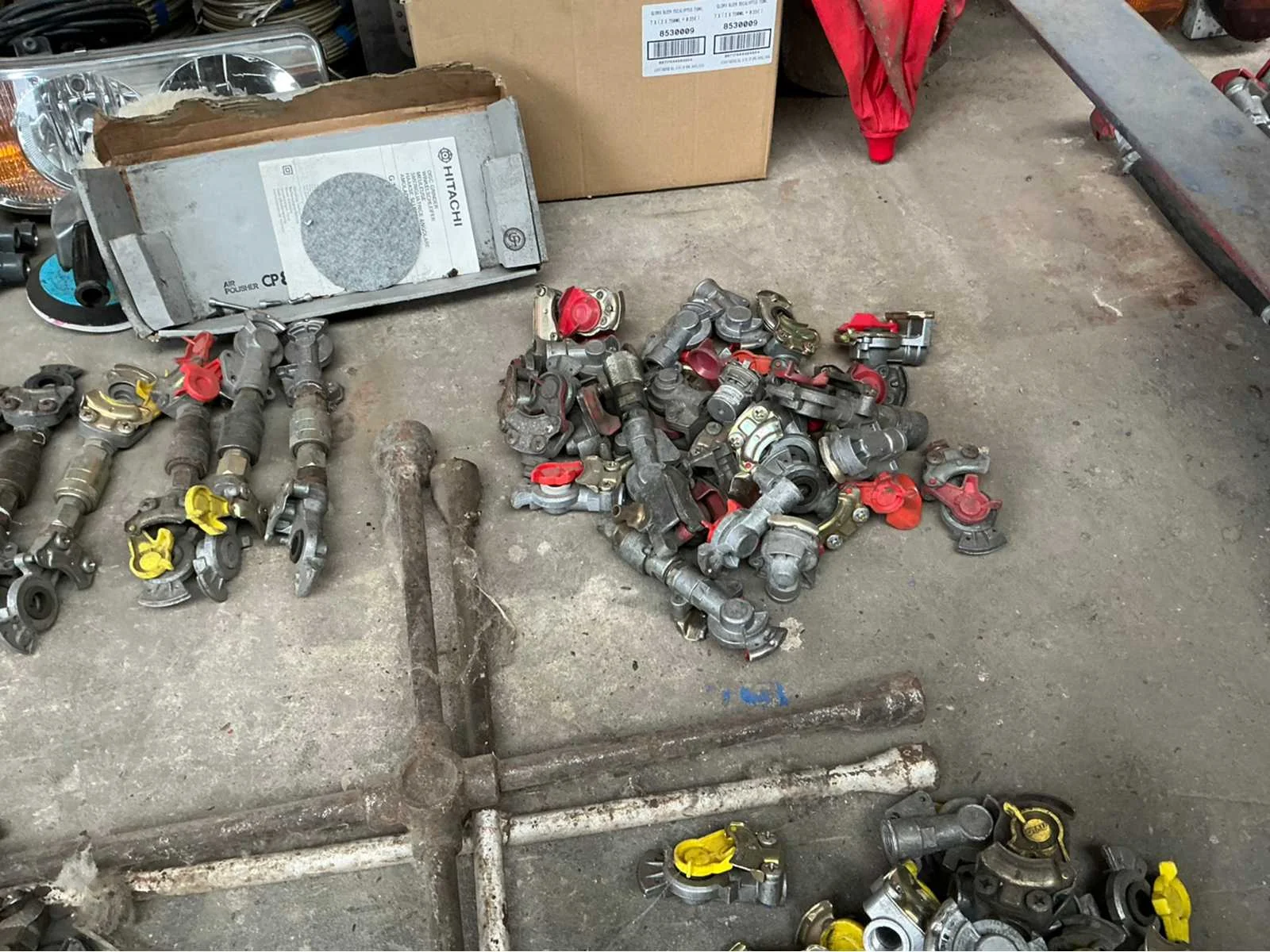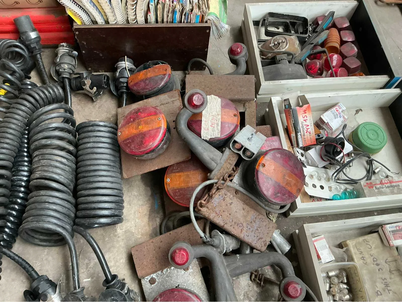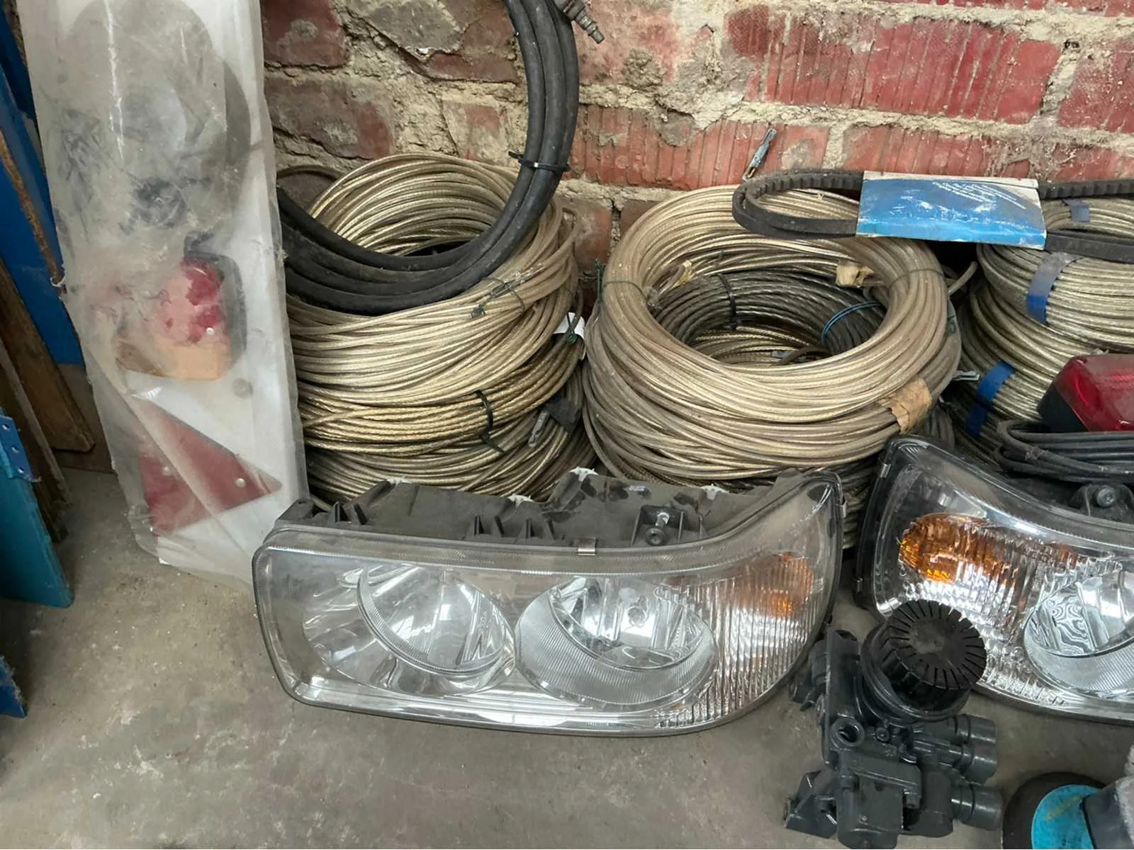 Groot lot vrachtwagen onderdelen waaronder lichten, filters, kabels en slangen, spanners, containervergrendelingen, luchtkoppelingen, ventielen, kentekenplaathouders,… Nee
