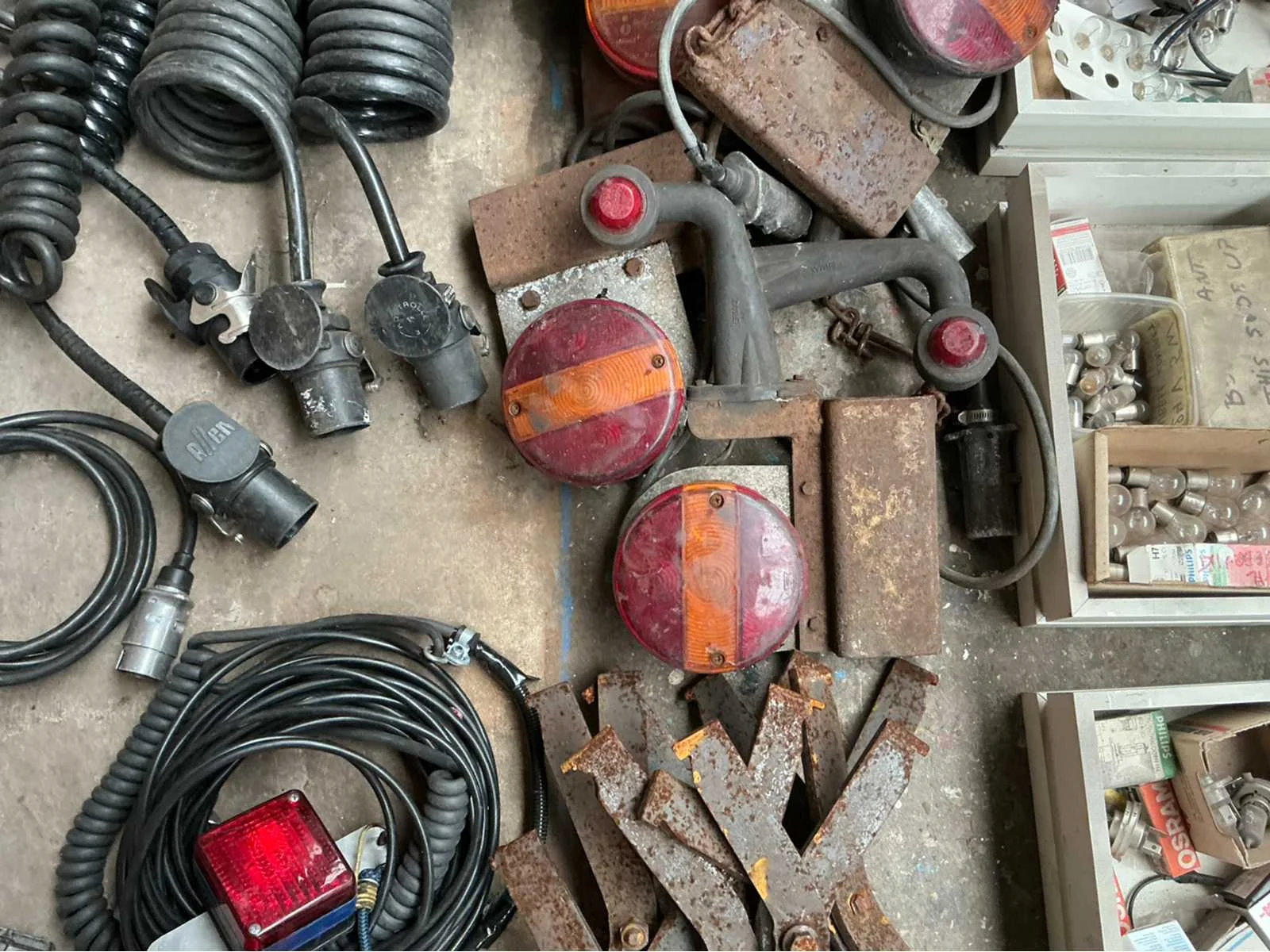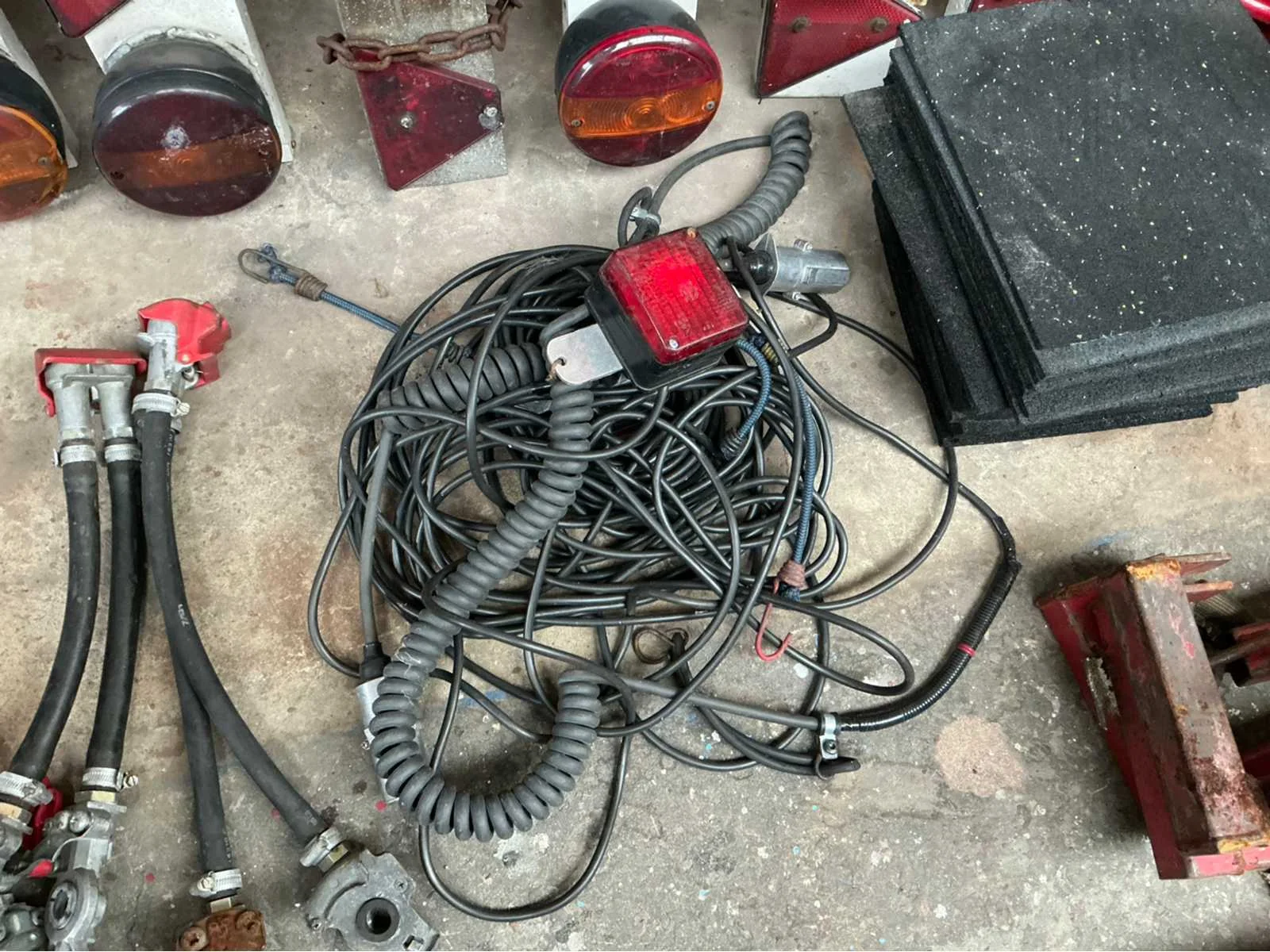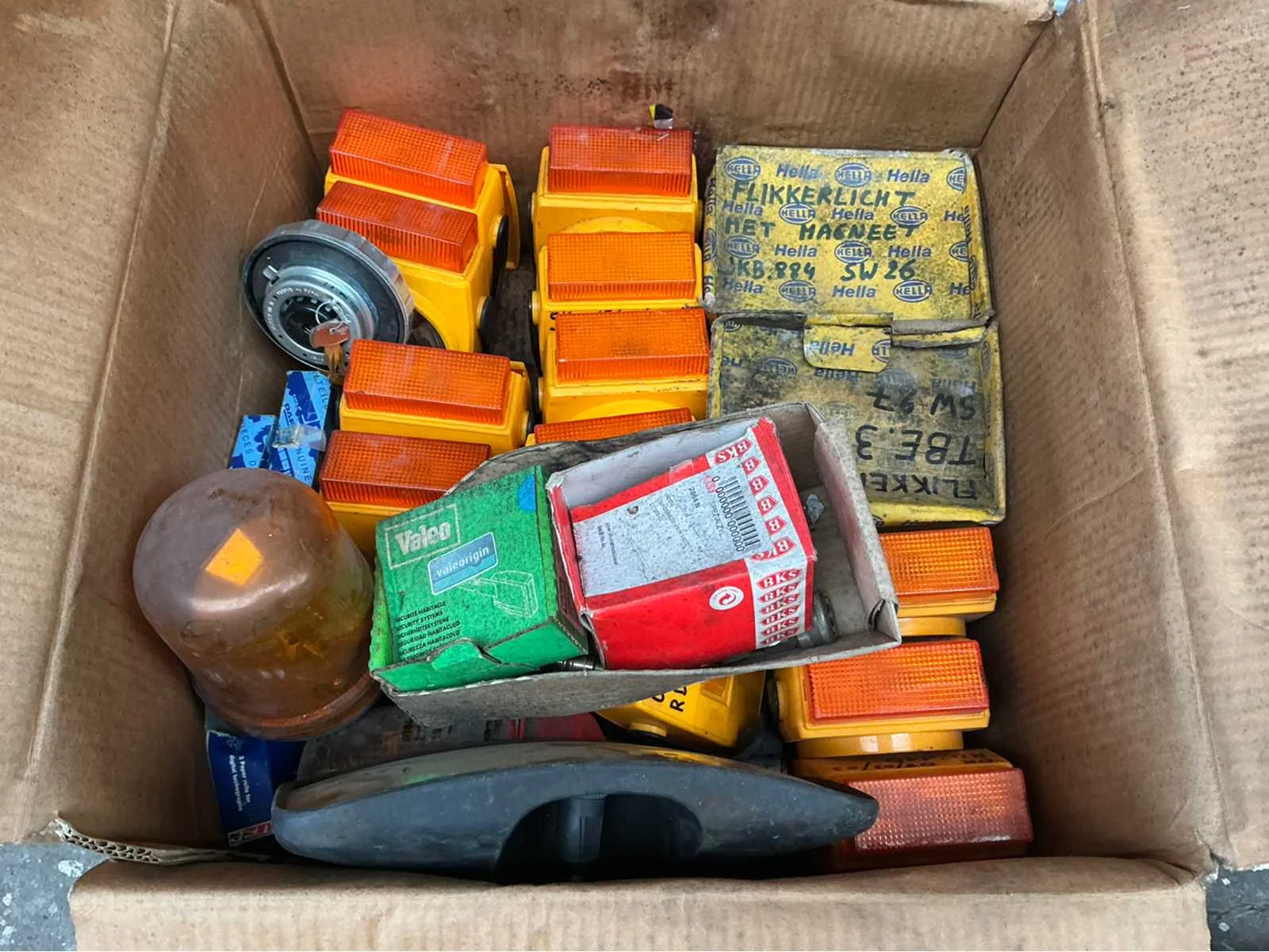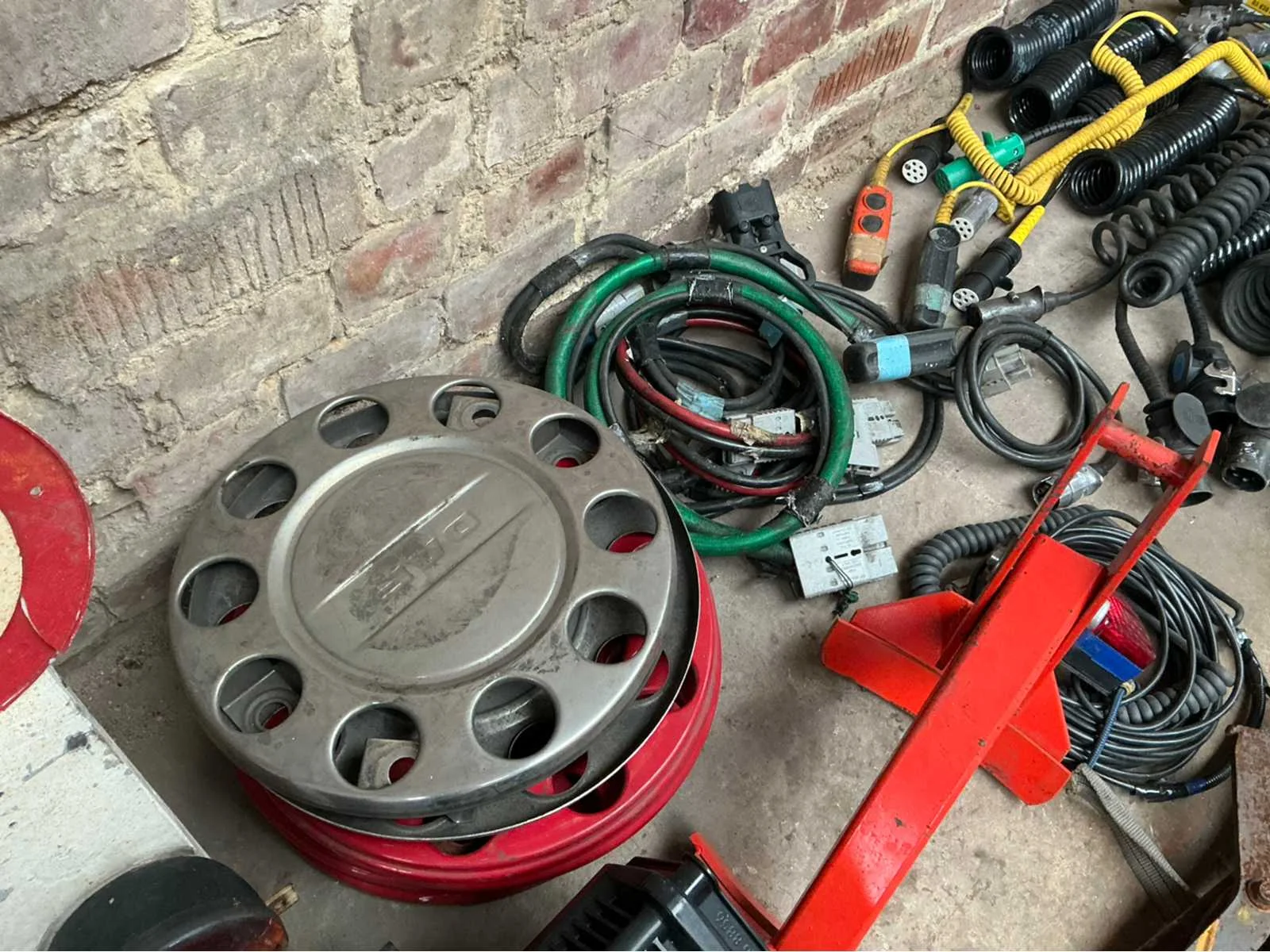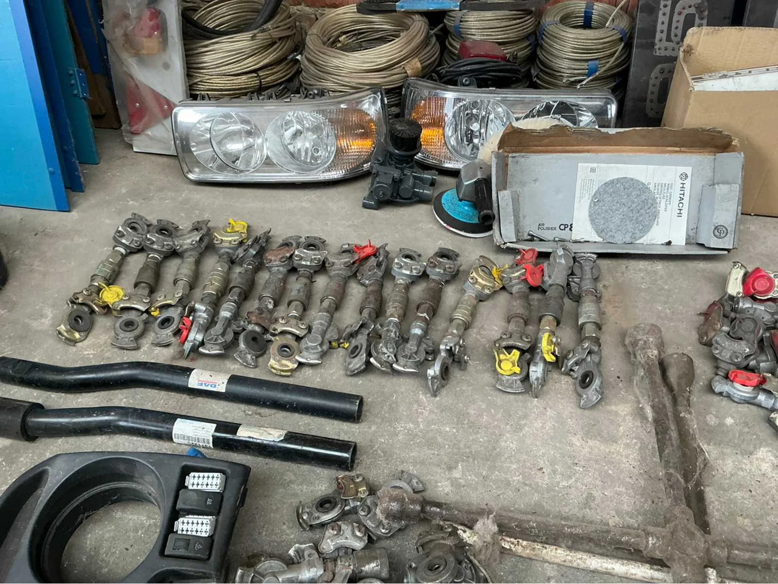 Groot lot vrachtwagen onderdelen waaronder lichten, filters, kabels en slangen, spanners, containervergrendelingen, luchtkoppelingen, ventielen, kentekenplaathouders,… Nee