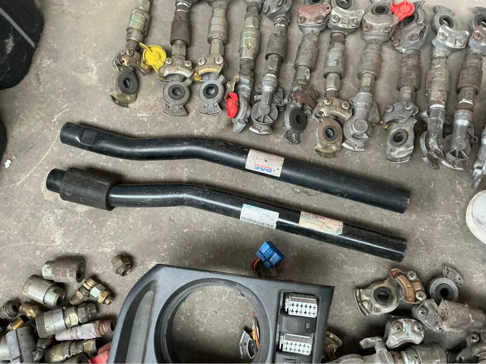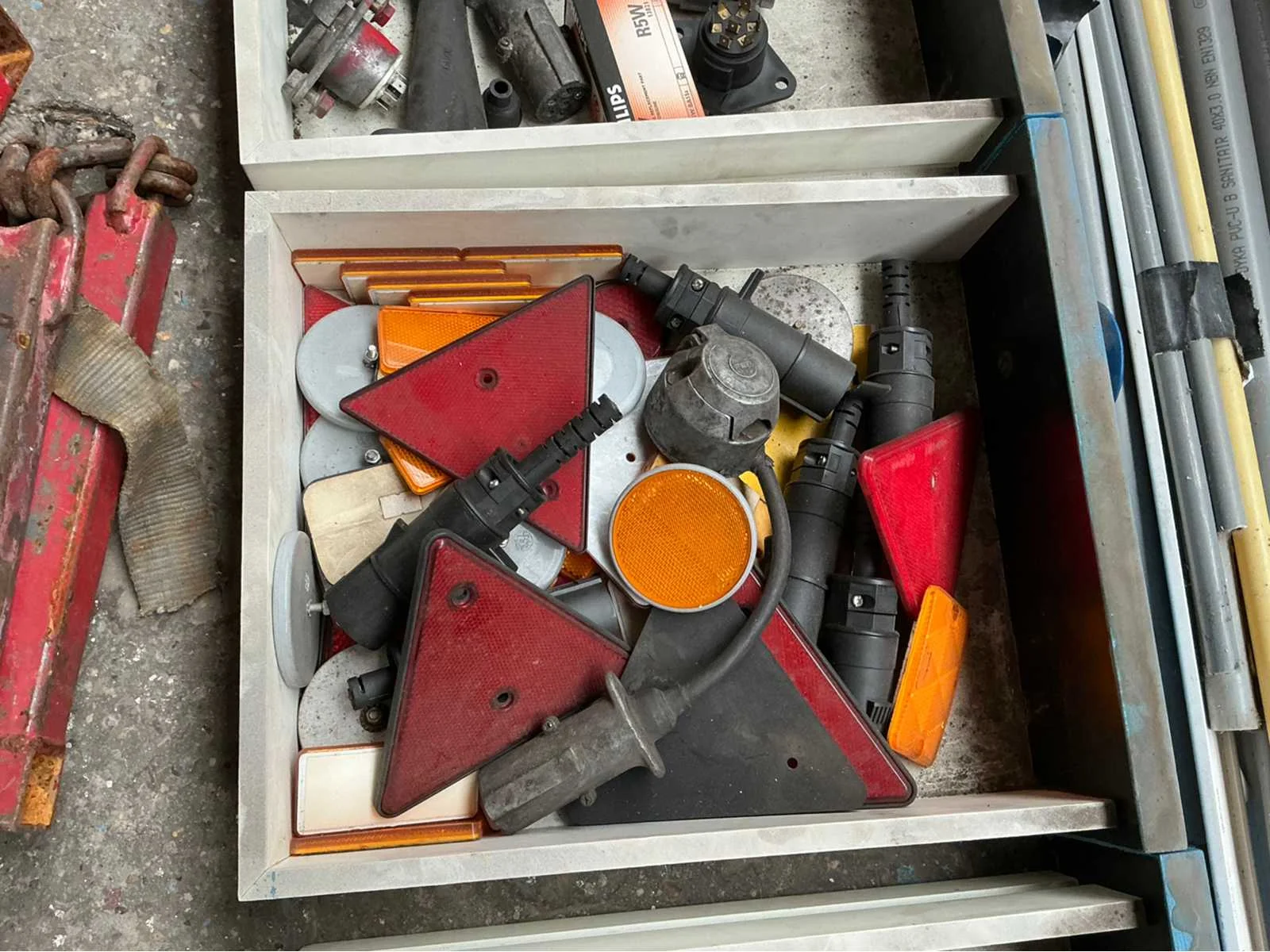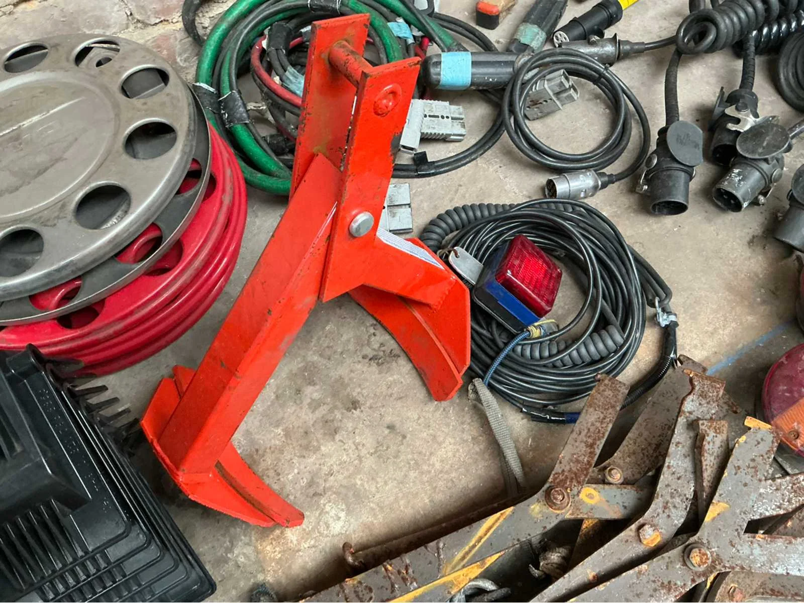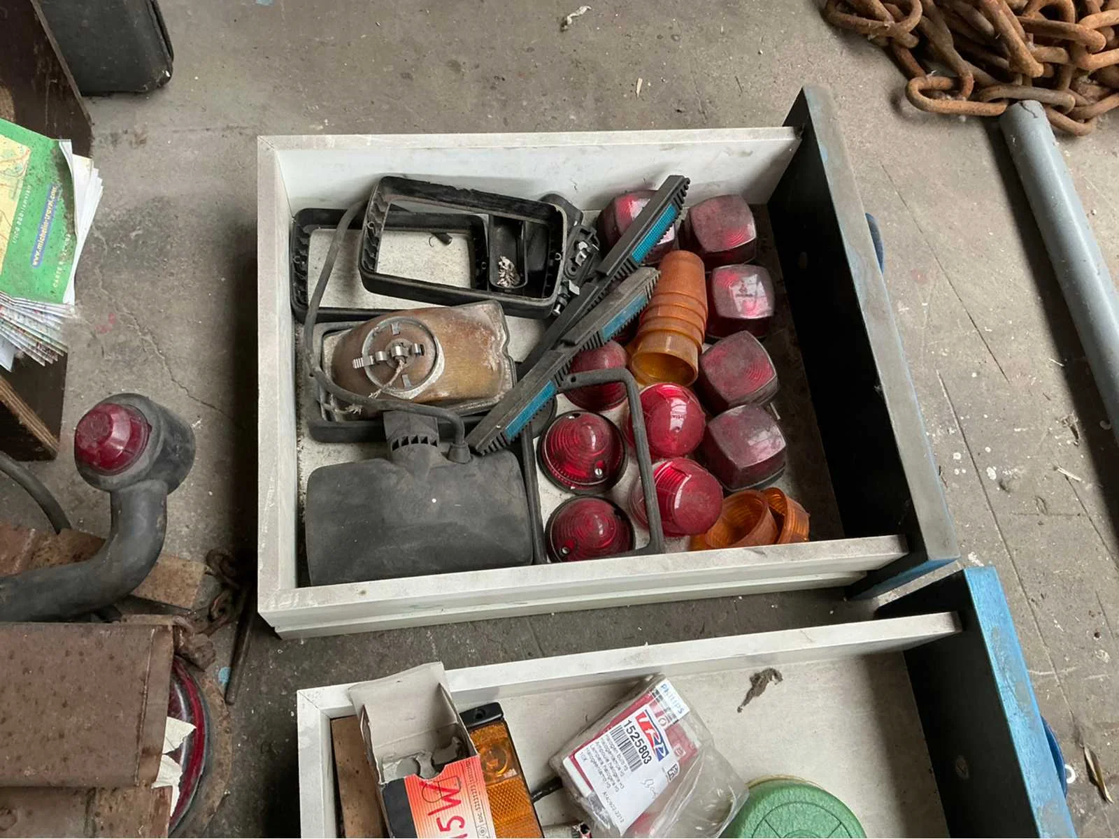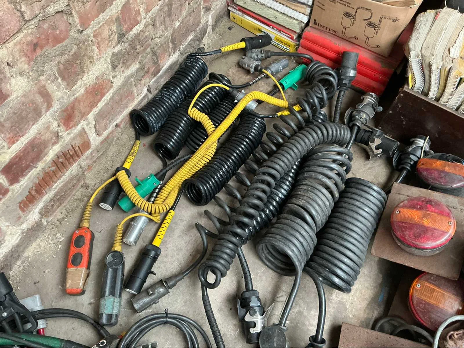 Groot lot vrachtwagen onderdelen waaronder lichten, filters, kabels en slangen, spanners, containervergrendelingen, luchtkoppelingen, ventielen, kentekenplaathouders,… Nee