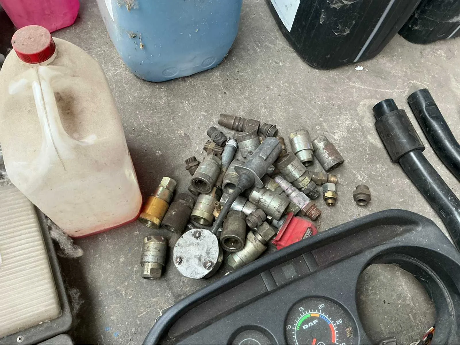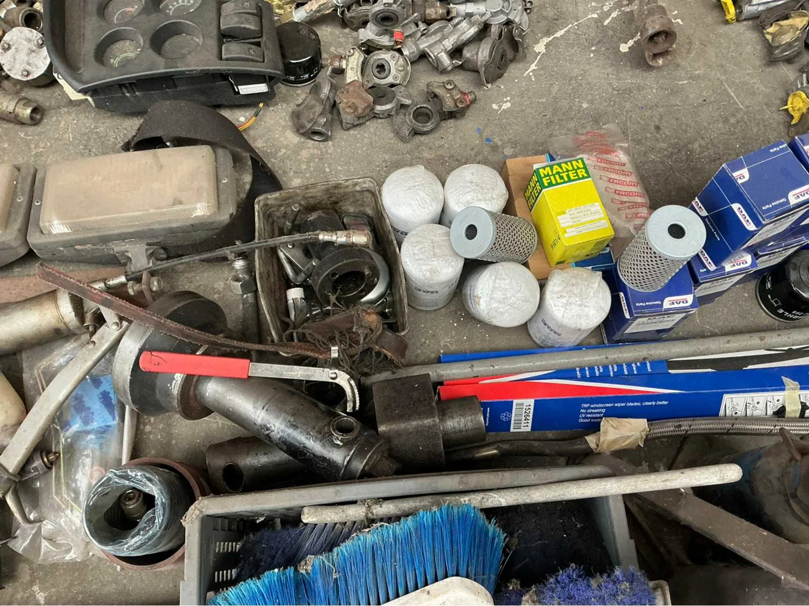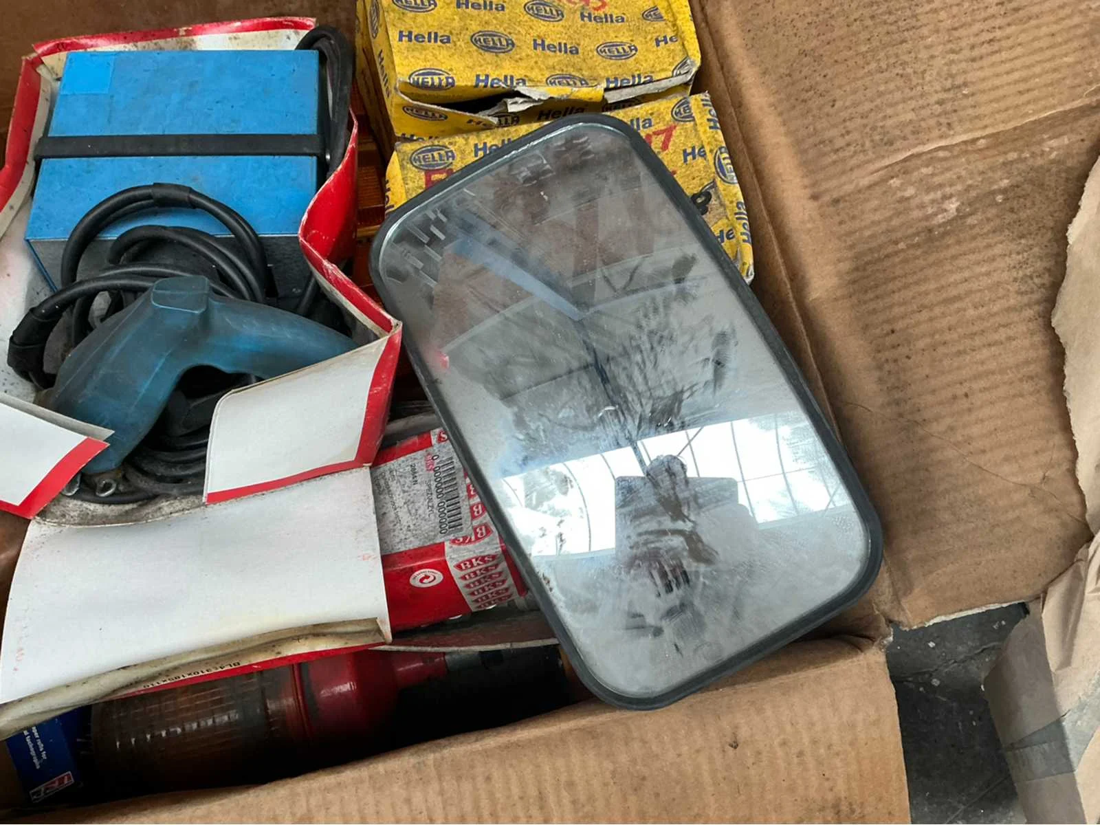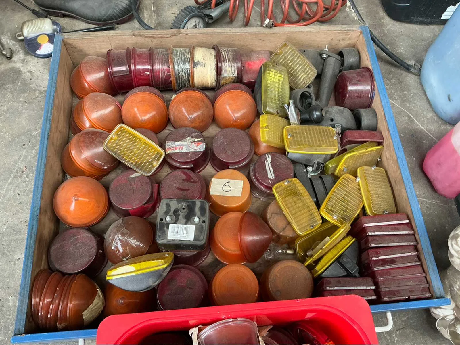 Groot lot vrachtwagen onderdelen waaronder lichten, filters, kabels en slangen, spanners, containervergrendelingen, luchtkoppelingen, ventielen, kentekenplaathouders,… Nee