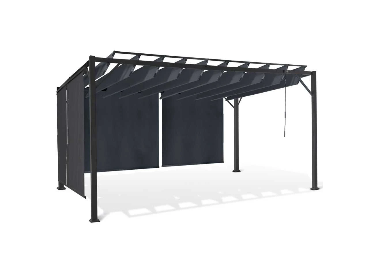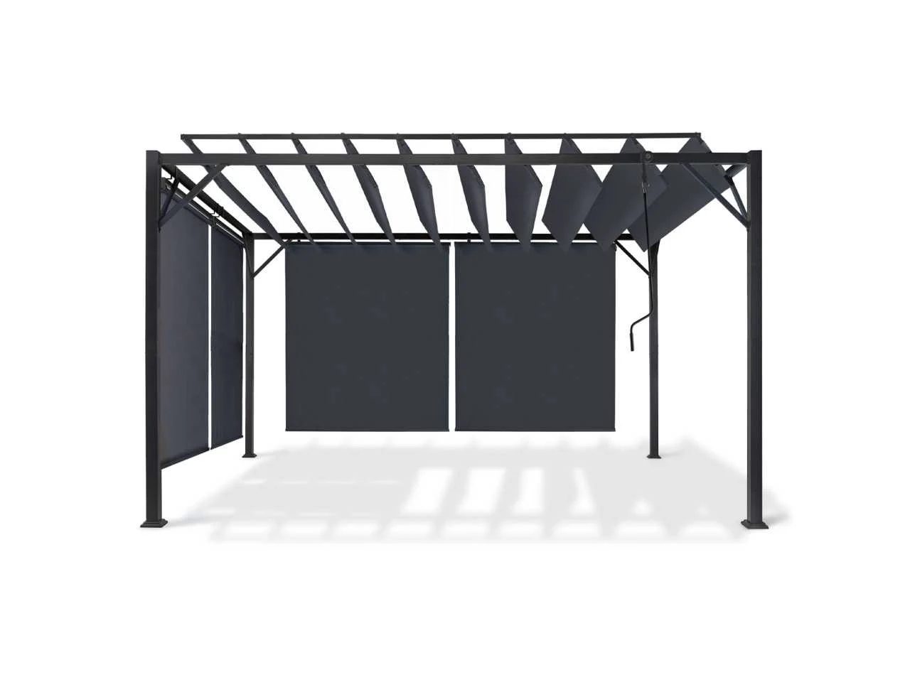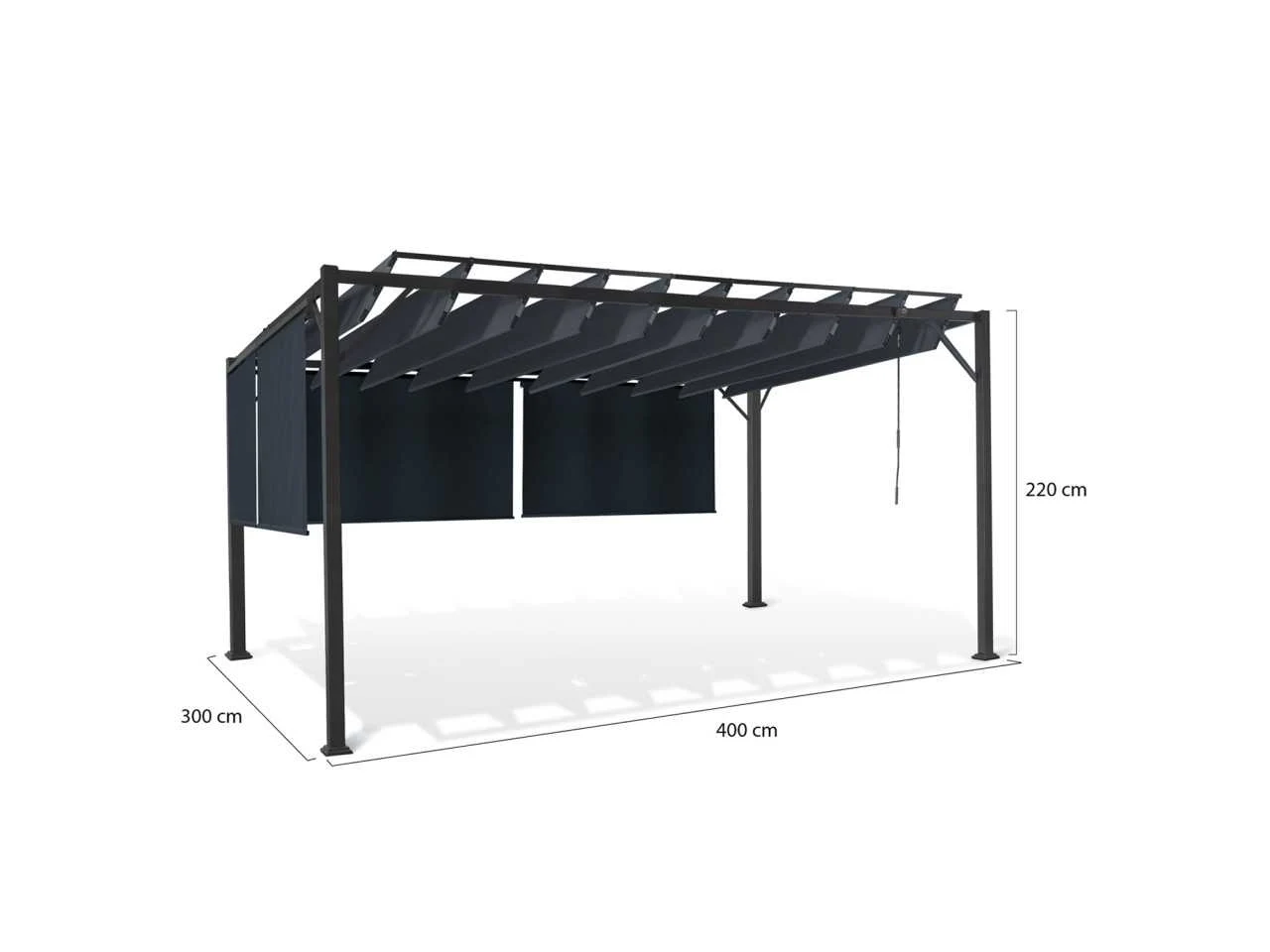 Technische beschrijving Afmetingen: (L) 400 x (B) 300 x (H) 220 cm Afmetingen poten: (L) 6 x (B) 6 x (H) 220 cm Afmetingen zijstangen: (L) 6 x (B) 3 cm Afmetingen buis: 20 X 14 mm Materiaal poot: Staal Materialen zijbalk: Staal Materiaal verstelbare latten: 160 g/m² polyester stof Aantal verstelbare lamellen: 10 Kleuren: Antracietgrijs frame, antracietgrijze stof en jaloezieën Afmetingen planken: (L) (B) 285 x 38,5 cm 160° draaibaar Aantal jaloezieën: 4 (2 maten) Extra afmetingen: Afmetingen van de dwarsbalken: 60 x 30 mm Afstand tussen de voeten: 286 / 386 cm Afmetingen van de jaloezieën x2 (B x H): 120 x 225 cm Afmetingen van de jaloezieën x2 (B x H): 170 x 225 cm Non