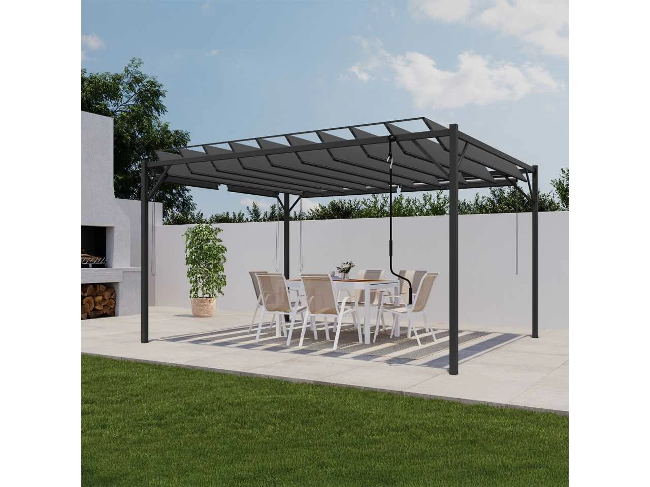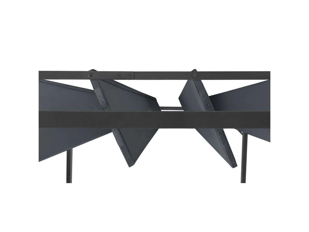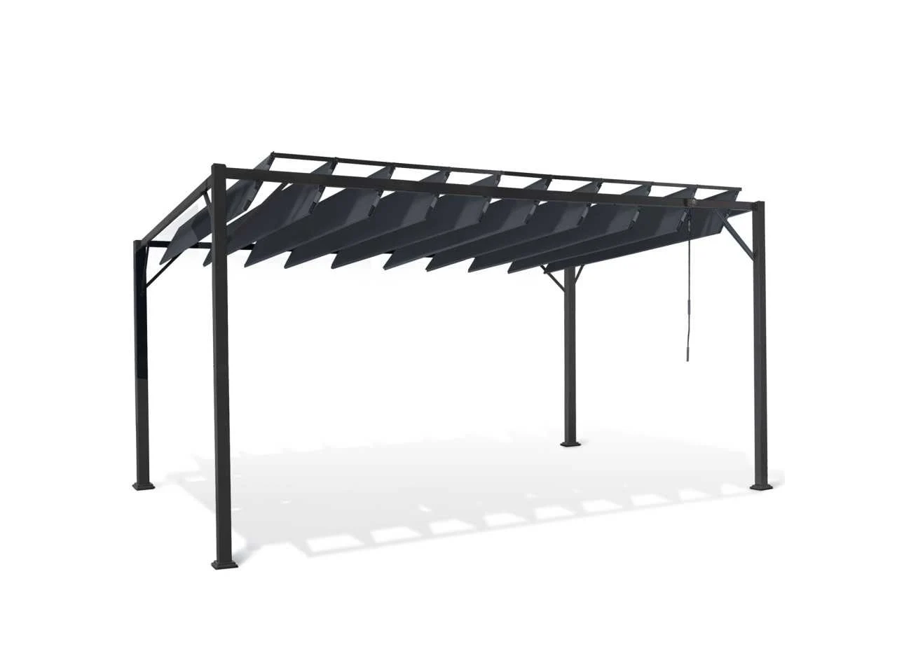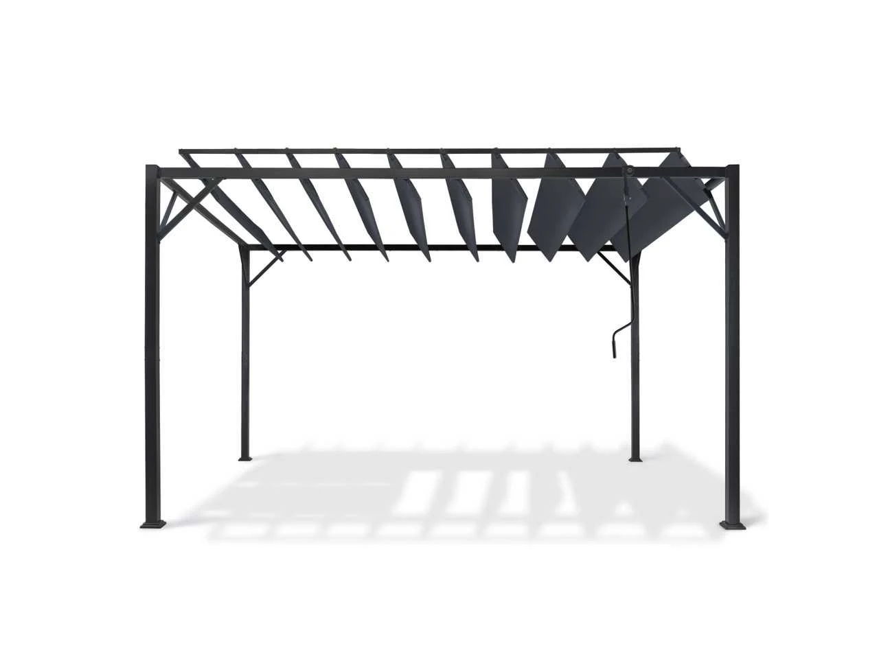 Technische beschrijving Afmetingen: (L) 400 x (B) 300 x (H) 220 cm Afmetingen poten: (L) 6 x (B) 6 x (H) 220 cm Afmetingen zijstangen: (L) 6 x (B) 3 cm Afmetingen buis: 20 X 14 mm Materiaal poot: Staal Materialen zijbalk: Staal Materiaal verstelbare latten: 160 g/m² polyester stof Aantal verstelbare lamellen: 10 Kleuren: Antracietgrijs frame, antracietgrijze stof en jaloezieën Afmetingen planken: (L) (B) 285 x 38,5 cm 160° draaibaar Aantal jaloezieën: 4 (2 maten) Extra afmetingen: Afmetingen van de dwarsbalken: 60 x 30 mm Afstand tussen de voeten: 286 / 386 cm Afmetingen van de jaloezieën x2 (B x H): 120 x 225 cm Afmetingen van de jaloezieën x2 (B x H): 170 x 225 cm Non