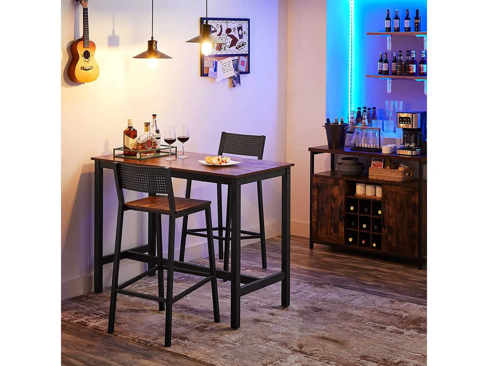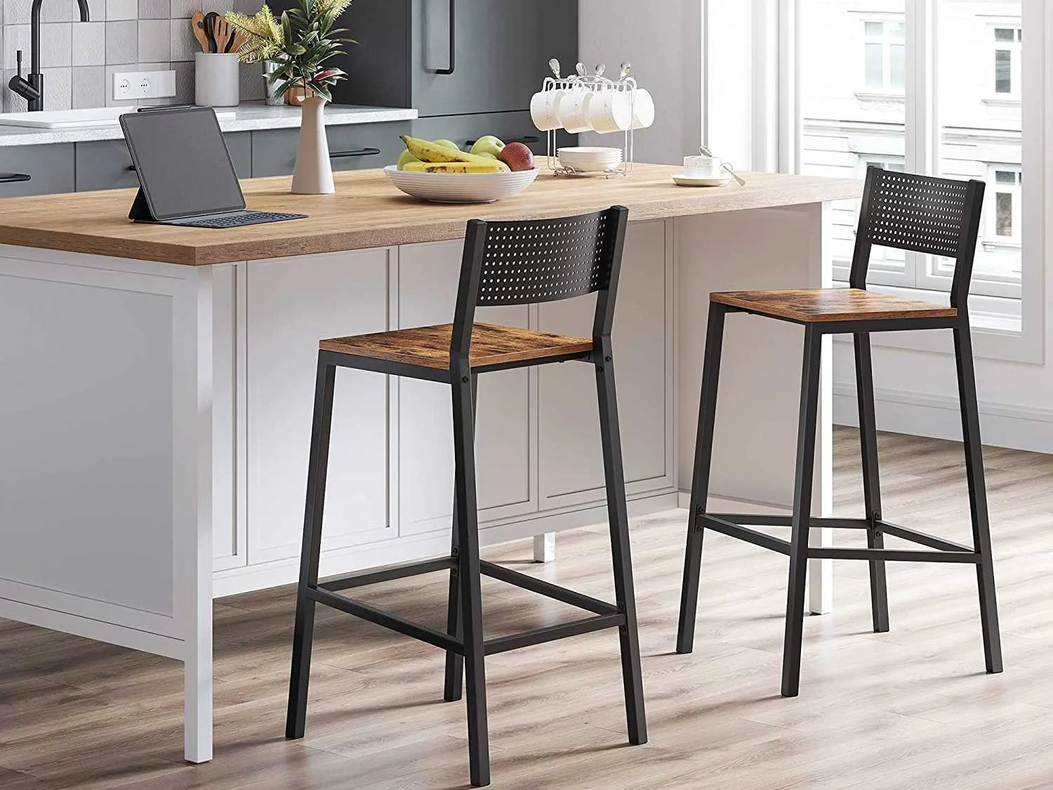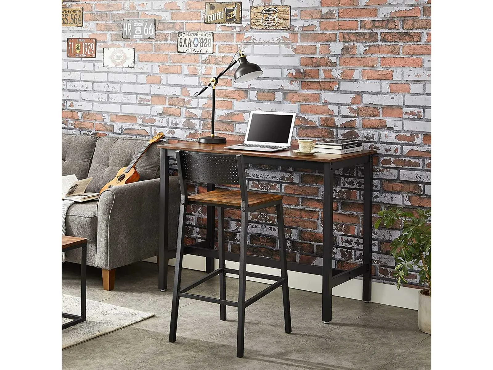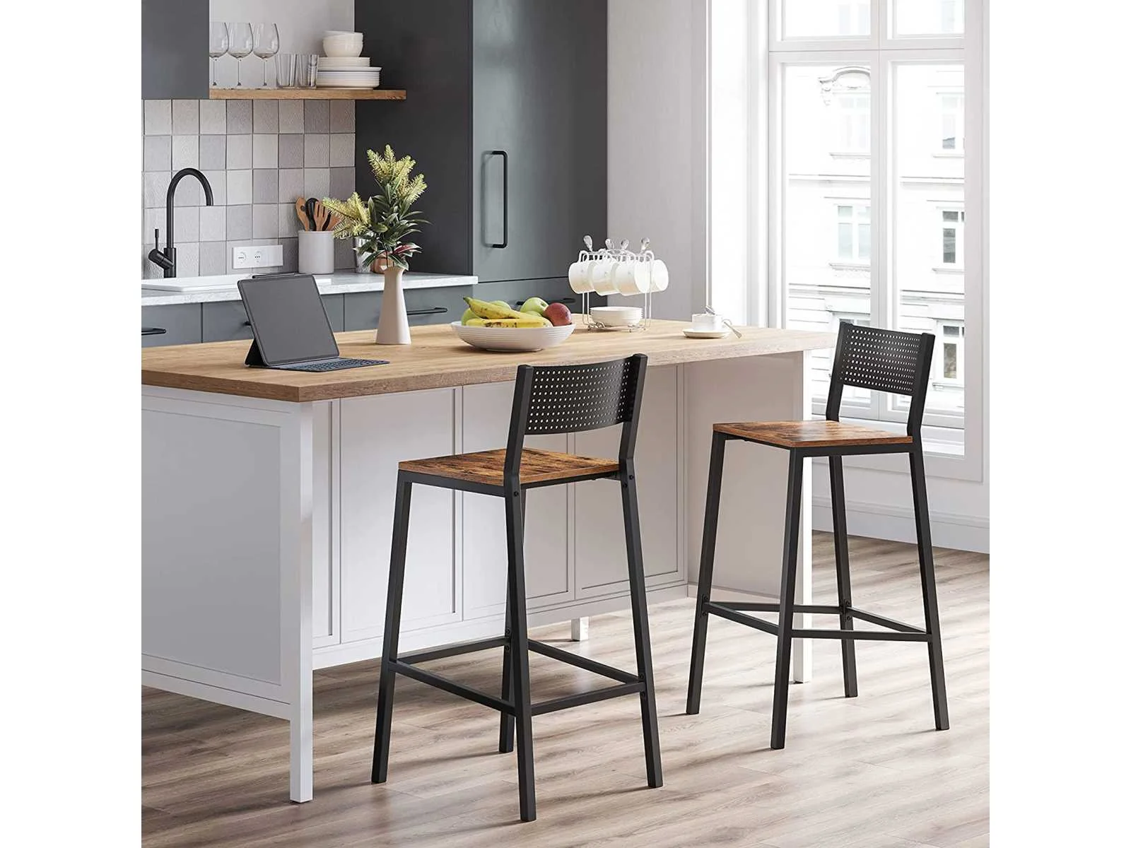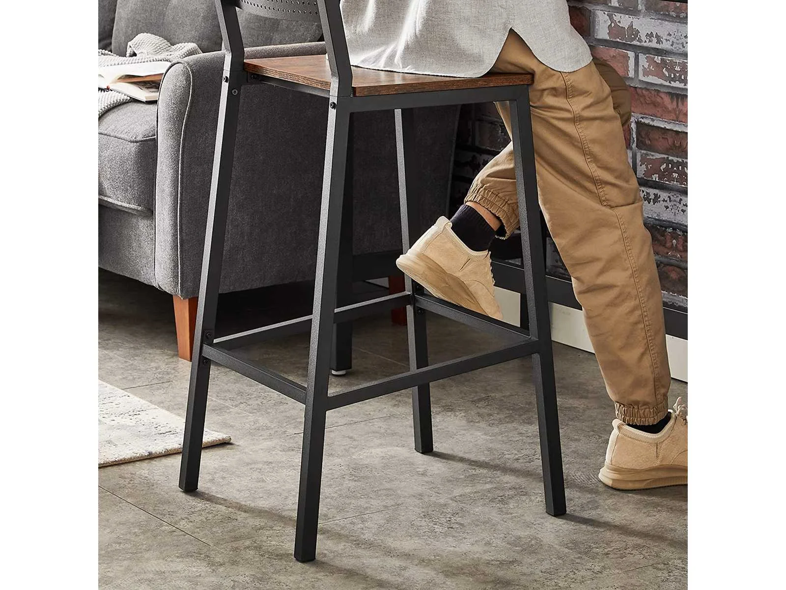 Kenmerken: Kleuren: Rustiek bruin, zwart Materialen: spaanplaat, staal Afmetingen van elke kruk: 43,1 x 50,7 x 97,2 cm (L x B x H) Gewicht van elke kruk: 12,8 kg Maximaal statisch draagvermogen van elke kruk: 130 kg Levering: Non