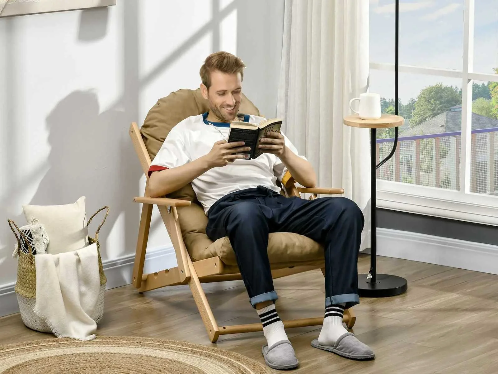 Specificaties: - Kleur: lichtbruin - Materialen: massief hout, schuim, 100% katoenen stof -Zon. totaal: 71I x 89D x 96H cm (voor instelling), 71I x 80D x 103H cm, 71I x 95,5D x 88H cm -Zon. opgevouwen: 71W x 14D x 126H cm -Zon. zitting: 50W x 50D cm -Zon. Rugleuning: 64L x 50B cm -Zon. kussen: 51W x 120D cm - Diepte kussen: 14 cm -Zon. armleuning: 46L x 6,5B x 2E cm Non