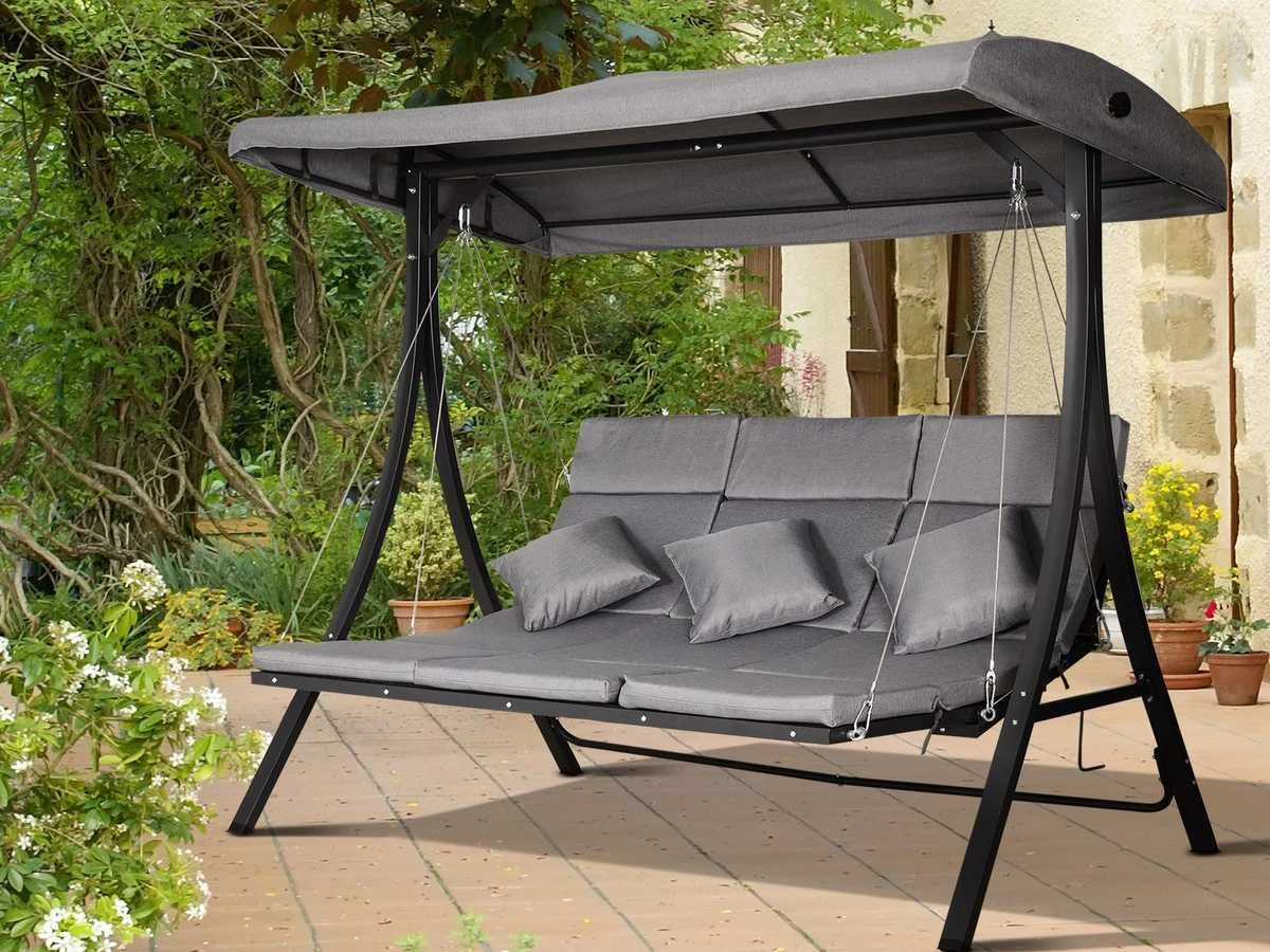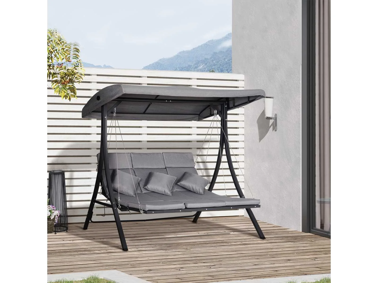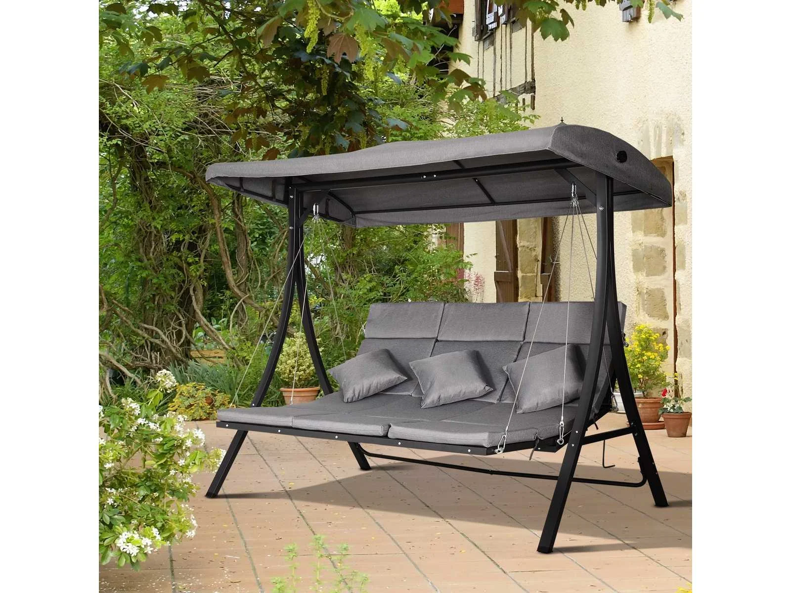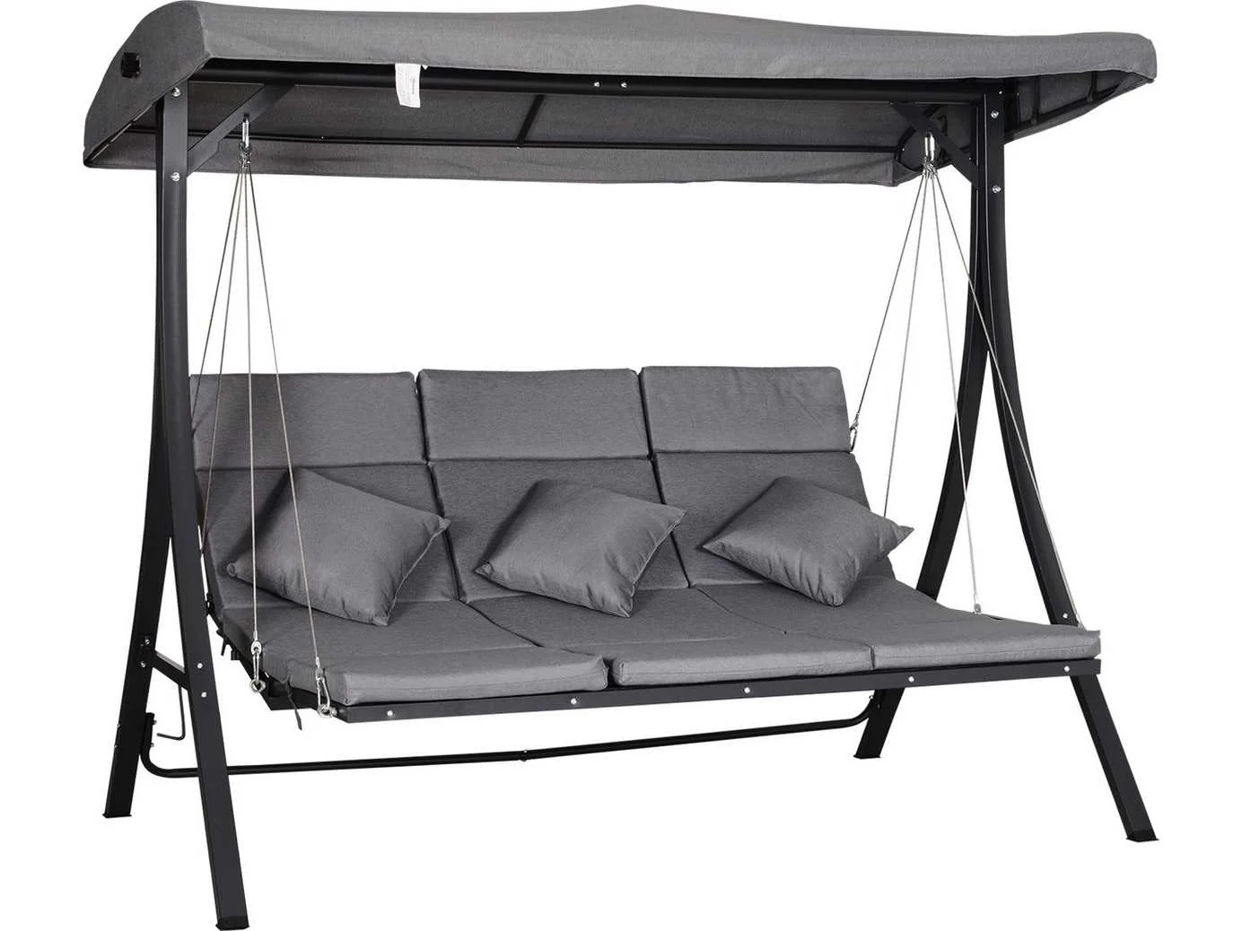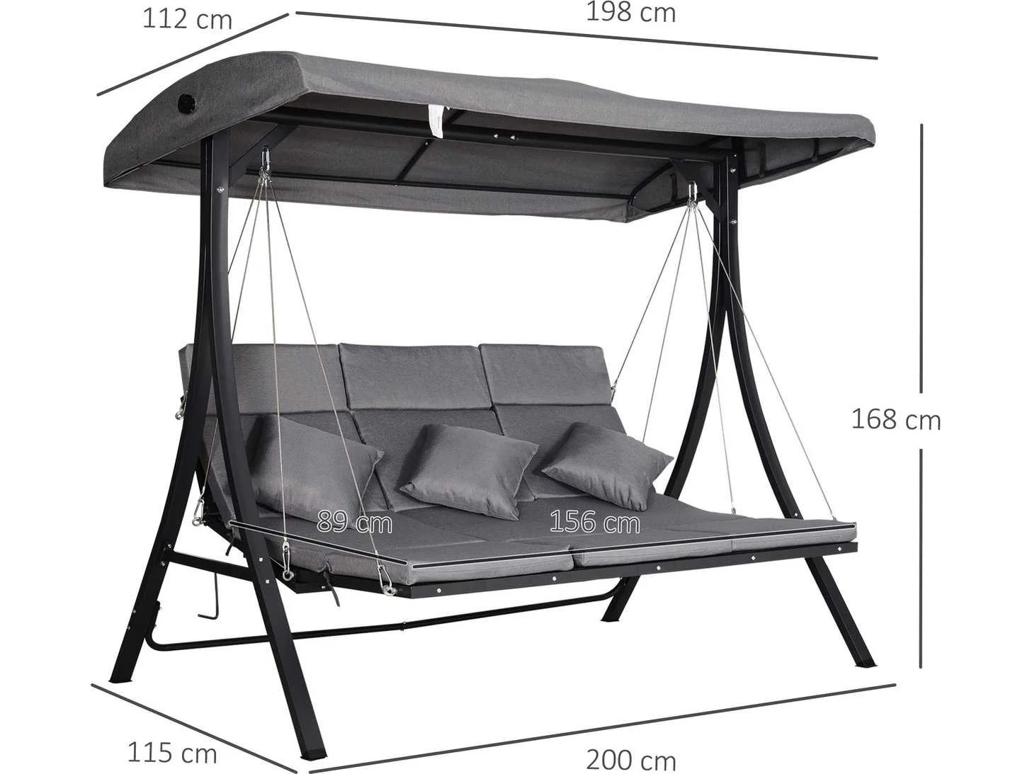 Specificatie: • Kleur: Zwart en Grijs • materiaal: stalen buis, gesponnen polyesterweefsel, textileenstof • Totale afmetingen: 78,75 "L x 45,25" B x 66,25 "H • Afmetingen luifel: 78"L x 44"W • Afmetingen zitting: 61,5 "B x 35" D • Afmetingen kussen: 57,75 "L x 22,75" W • Hoogte rugleuning: 22,75 '' • Afmetingen kussen: 14,25 "L x 14,25" W • Zithoogte tot vloer: 20,5" • Enkel kussen: 57,75 "L x 20,5" W • Netto gewicht: 97 lbs • Gewicht capaciteit: 600 lbs Non