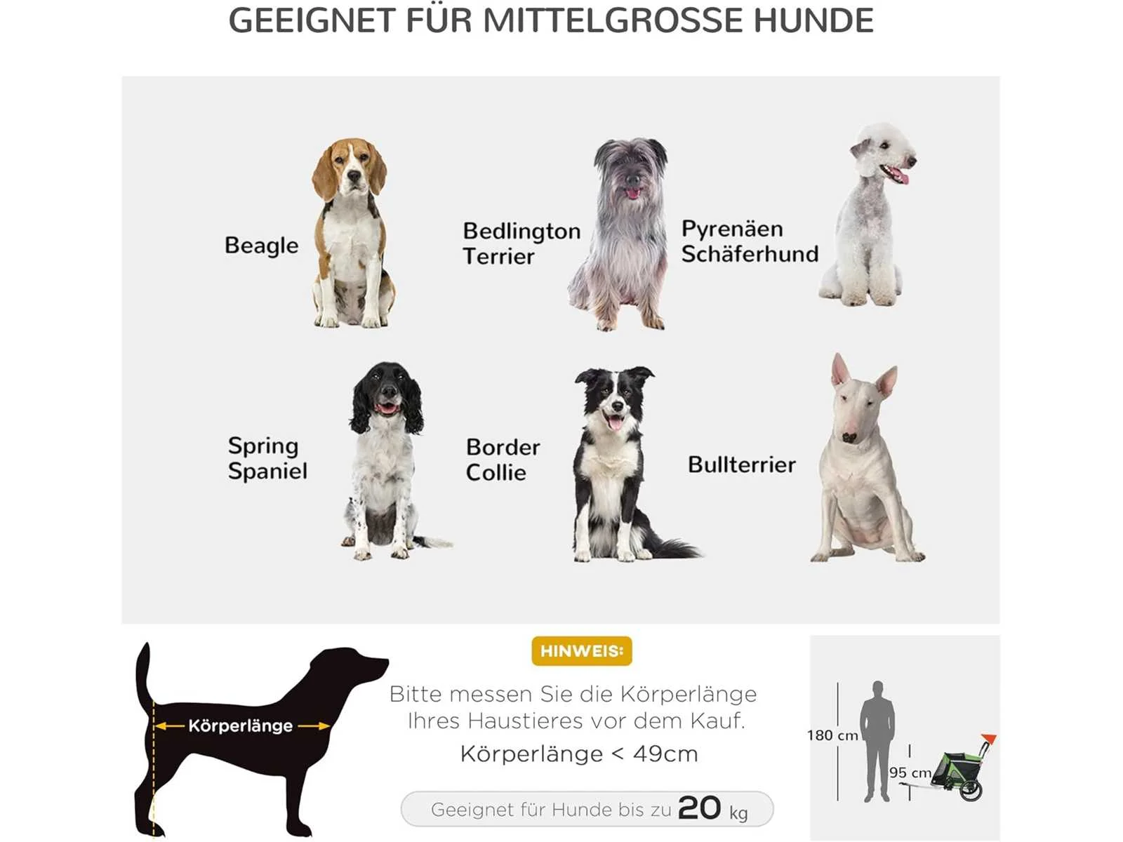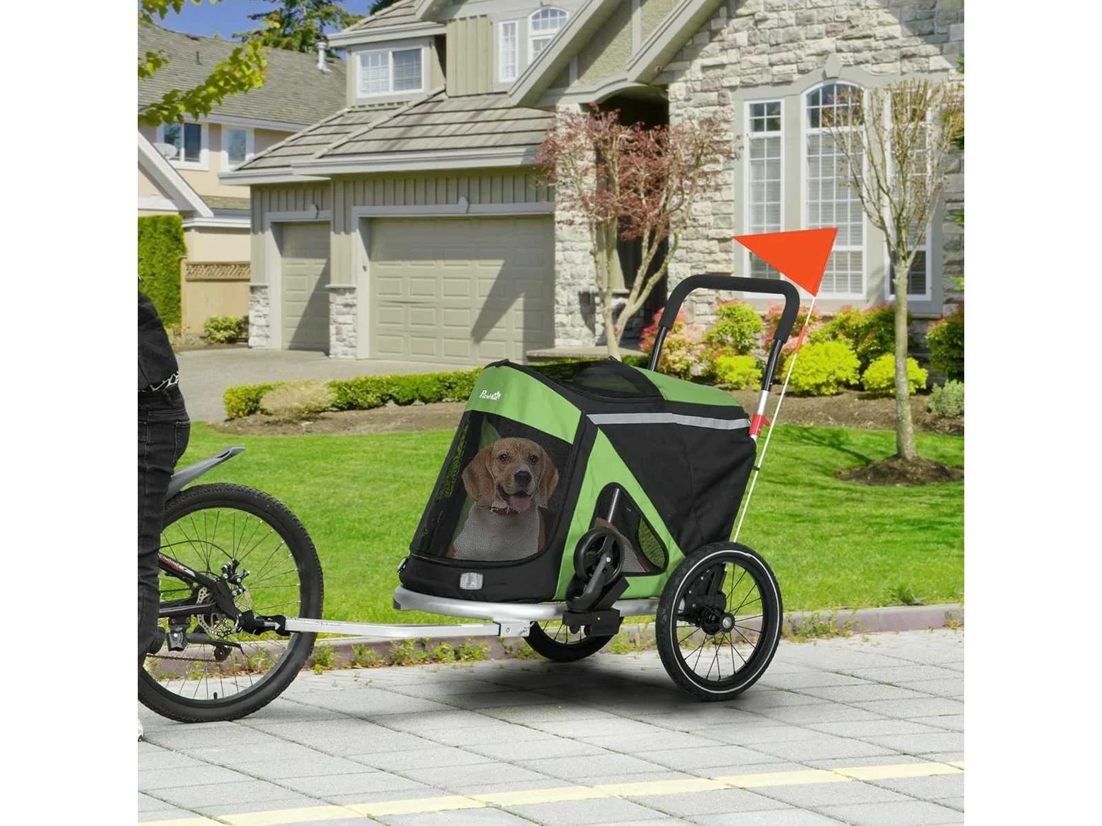 2-in-1 ontwerp, kan worden gebruikt als aanhanger en kar om uw hond uit te laten Opvouwbaar voor opslag in het koude seizoen en voor opslag in de auto Water-, weer- en lichtbestendige stof voor gebruik buitenshuis in zon, wind en regen Veiligheidsvlag en reflector bevestigd om anderen uit verschillende richtingen te waarschuwen 2-in-1 hondenaanhanger voor- en achterdeur met ritssluiting voor gemakkelijke toegang Gaasroosters aan de voorkant, bovenkant en zijkanten zorgen voor een goede ventilatie Veiligheidsriem om de riem van uw huisdier te bevestigen Eenvoudig opbergen met snelspanwielen Kleur: Zwart Groen Materiaal & Materiaal Oxford Doek, Aluminium Totale afmetingen: 150L x 68B x 95H cm Binnenafmetingen van de auto: 74L x 43B x 55H cm Afmetingen voordeur: 44 x 48 cm (B x H) Afmetingen opgevouwen: 94L x 68B x 39H cm (met wielen), 74L x 43B x 20H cm (zonder wielen) Afmeting voorwiel 15 cm Maat achterwiel 40,6 cm Non