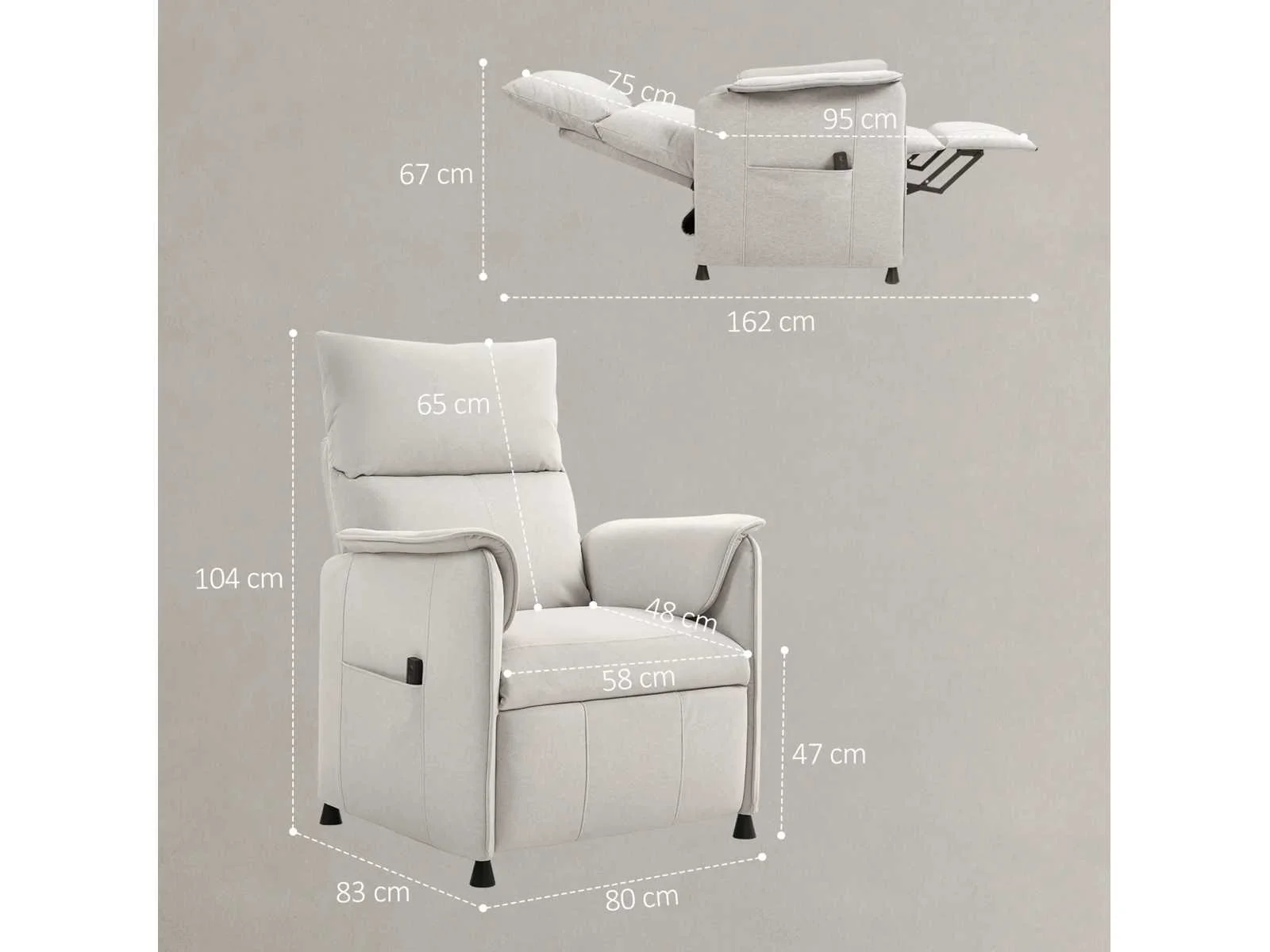 Specificaties: - Kleur: Crème - Materiaal: huisdiervriendelijk suède kunstleer (100% polyester), schuim en staal - Algemene afmetingen: (Staand) 80W x 83D x 104H cm - Totale afmetingen: (Schuin) 80W x 162D x 67H cm - Afmetingen zitting: 58W x 48D x 47H cm - Afmetingen rugleuning: 66B x 65D cm - Dikte rugleuning: 18 cm - Hoogte van de armleuningen op de vloer: 20 cm - Afstand tot de muur: (Schuin) 50 cm - Draagvermogen: 135 kg - Ingang: 100-240V, 50-60Hz - Uitgang: 29V, 1A, 29W - Lengte kabel: 2 m Non