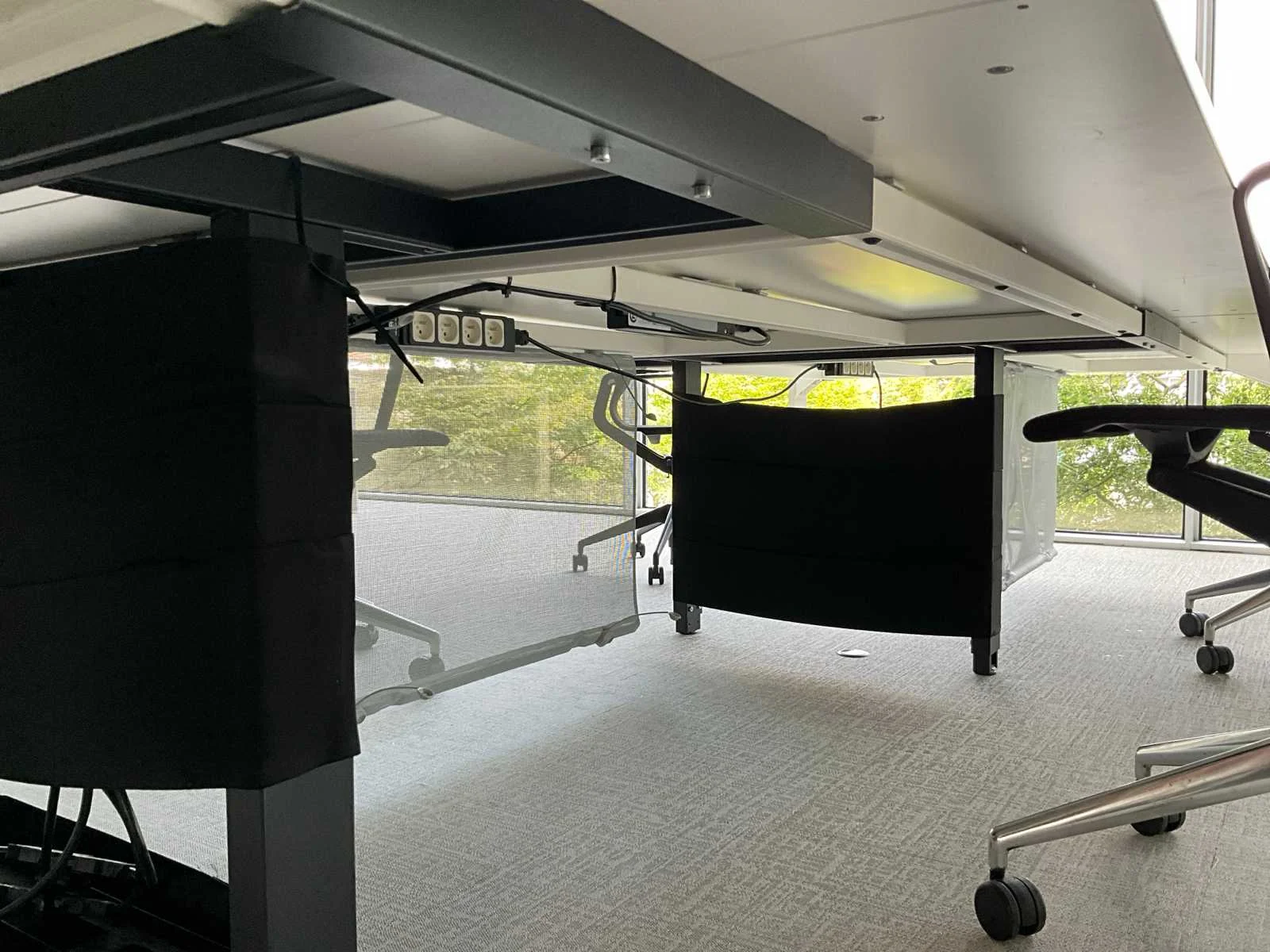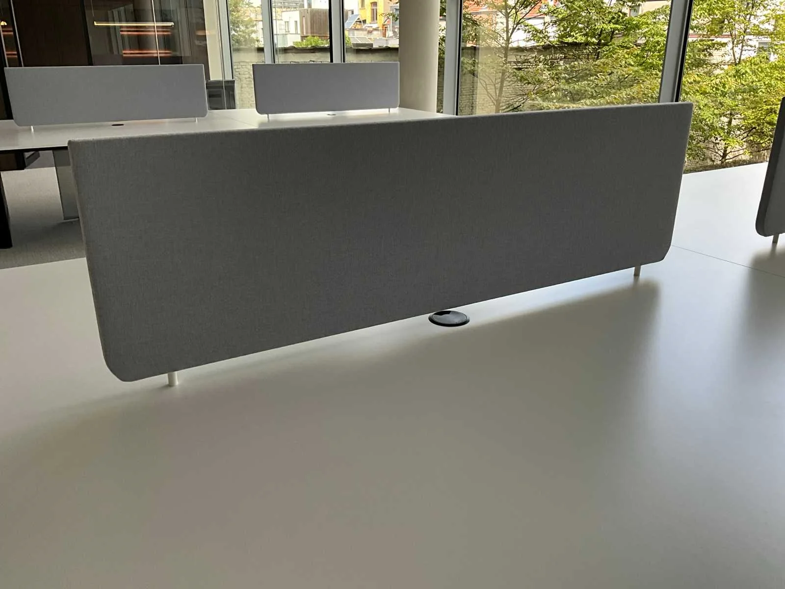 Bestaande uit 3 aparte bureau-eilanden, afmeting circa. 160 x 160 x75cm, elk eiland voorzien van akoestisch tussenscherm, compleet met 6 designbureaustoelen VITRA 529 Nee Merk: BULO Type: H2O
