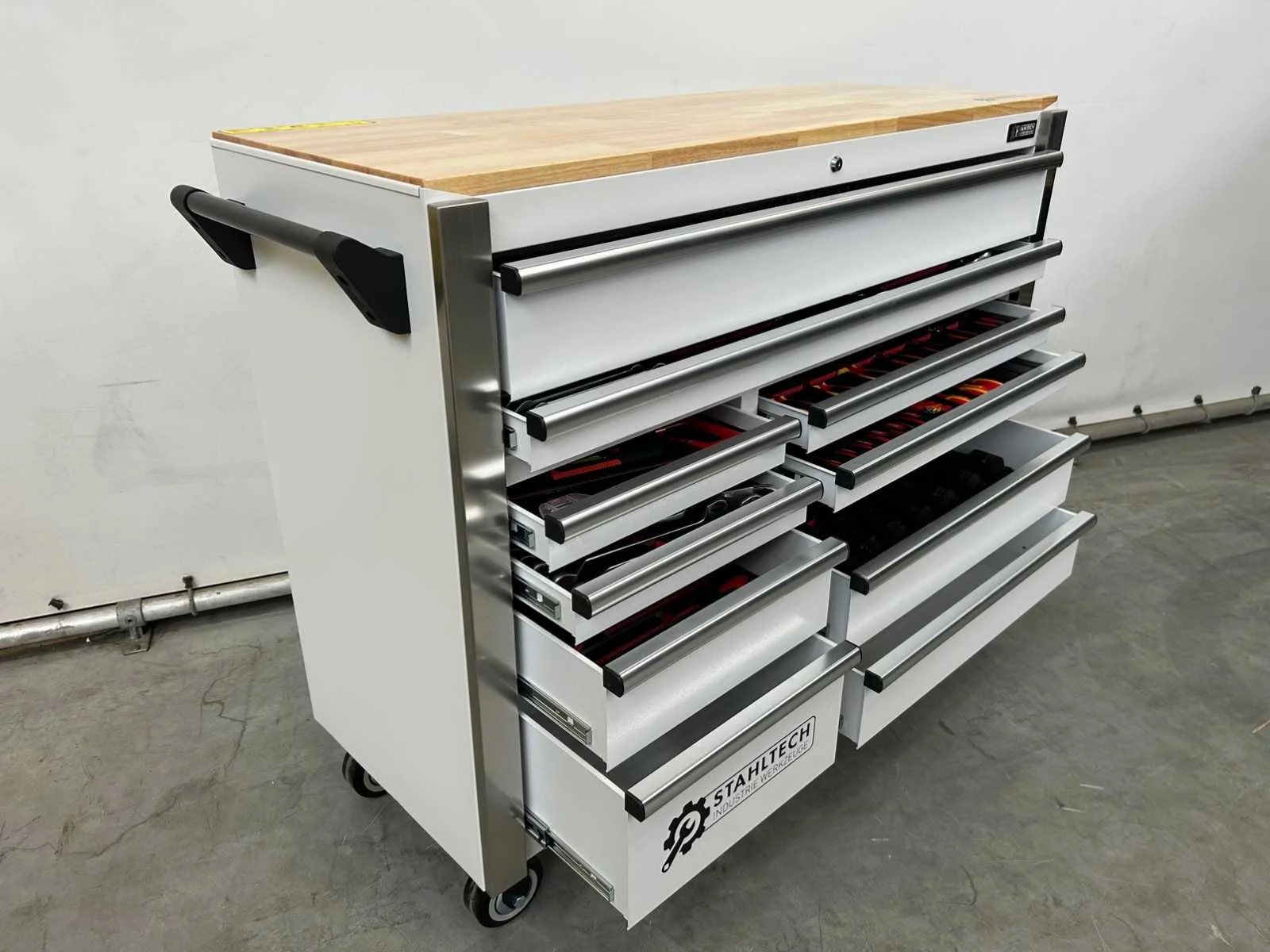 Ongebruikt; gereedschap in plastic verpakt; 12-delig tangenset; 13-delig hamerset; 14-delig meetset; 36-delig slagmoersleutel set; 21-delig sleutels met T-greep; 41-delig schroevendraaierset; 29-delig combinatiesleutels; 12-delig ringsleutels; 125-delig doppenset; 84-delig bitjes set; 7483 Nee Merk: Stahltech Type: 387-delig Lengte: 148cm Breedte: 52cm Hoogte: 110cm