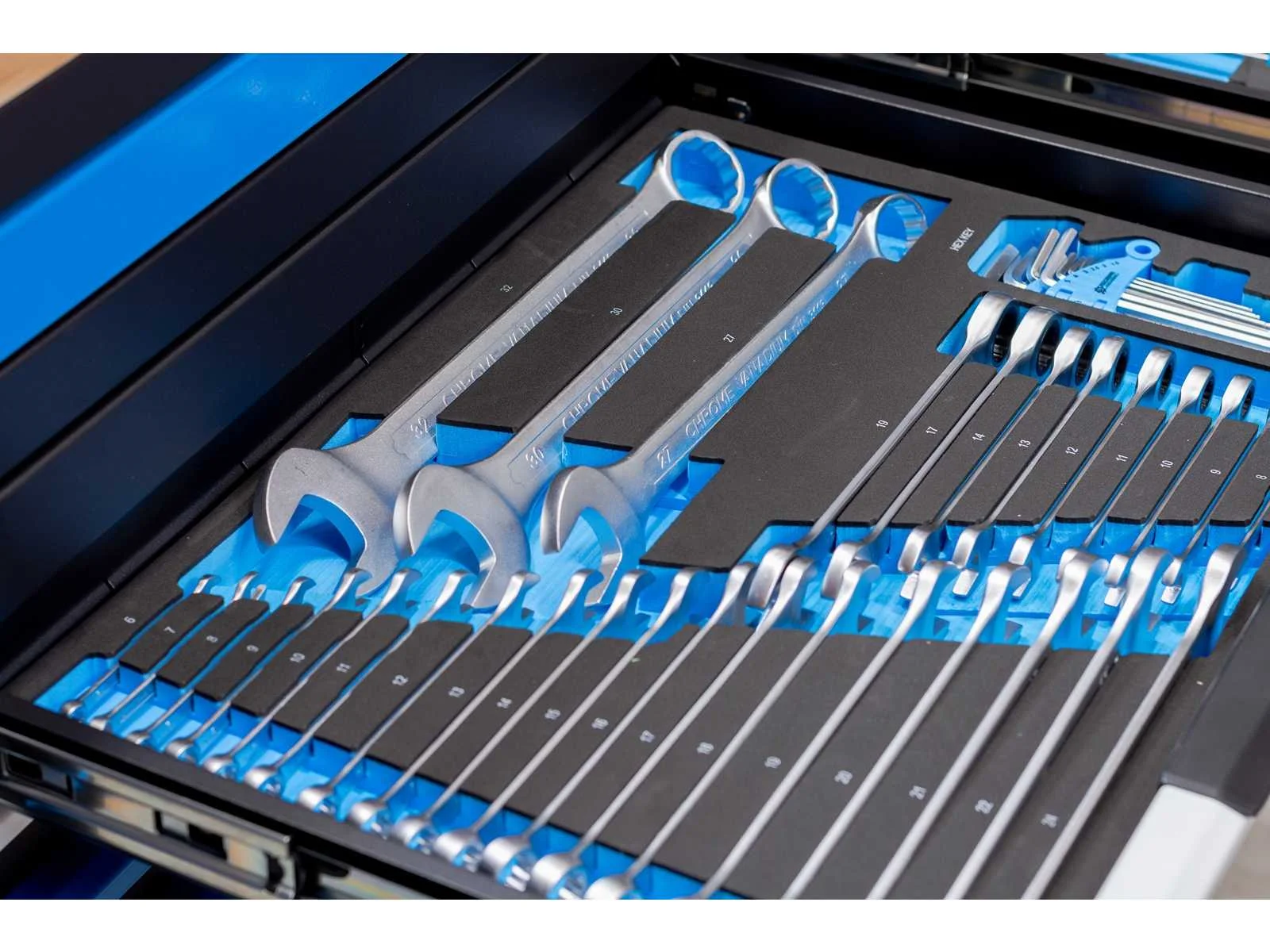 V.v. gereedschap 294-delig; 4 wielen waarvan 2 met rem; stuurgroep; houten werkblad; 13 lades; 11 lades gevuld; 2 sleutel sets; in de doos; ongebruikt; 4145; Nee Merk: Stahlgruppe Type: SG22 Bouwjaar: 2023 Aantal laden: 13 Met inhoud: true Totale afmeting L: 1130mm Totale afmeting Breedte: 570mm Totale afmeting Hoogte: 1090mm