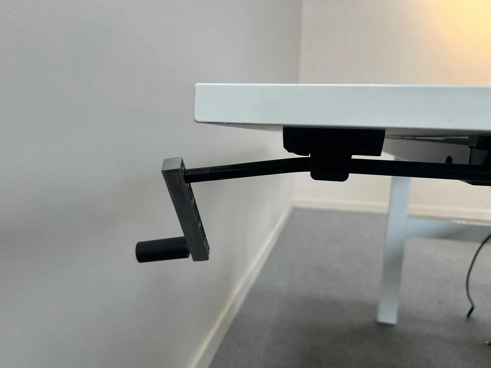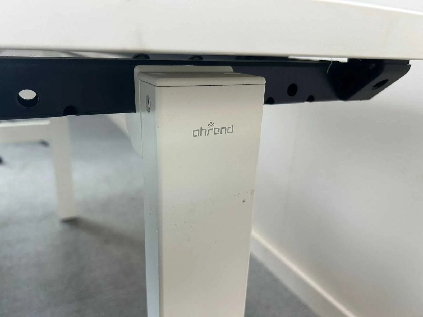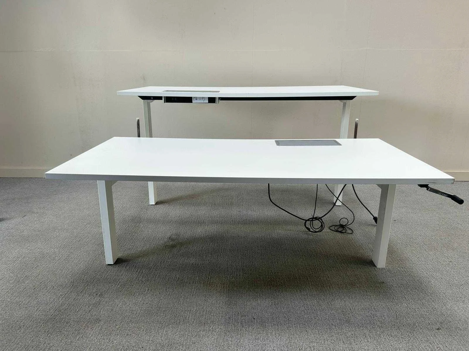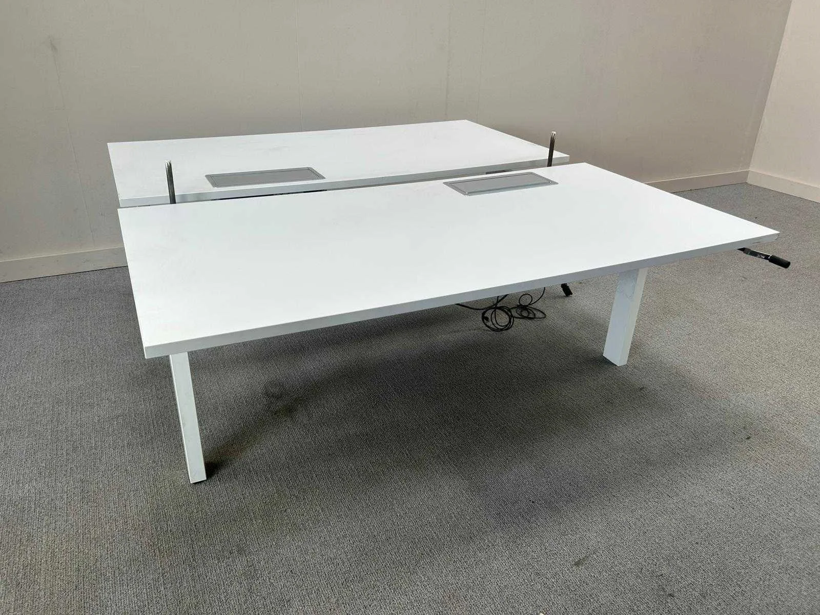 Ahrend dubbele workbench met handslinger in wit melamine met wit metaal onderstel. Nee Merk: AHREND Type: Dubbele workbench Slingerbureau: true Kleur: Wit Breedte: 160cm Hoogte: 61-90cm Materiaal: Melamine Diepte: 170cm