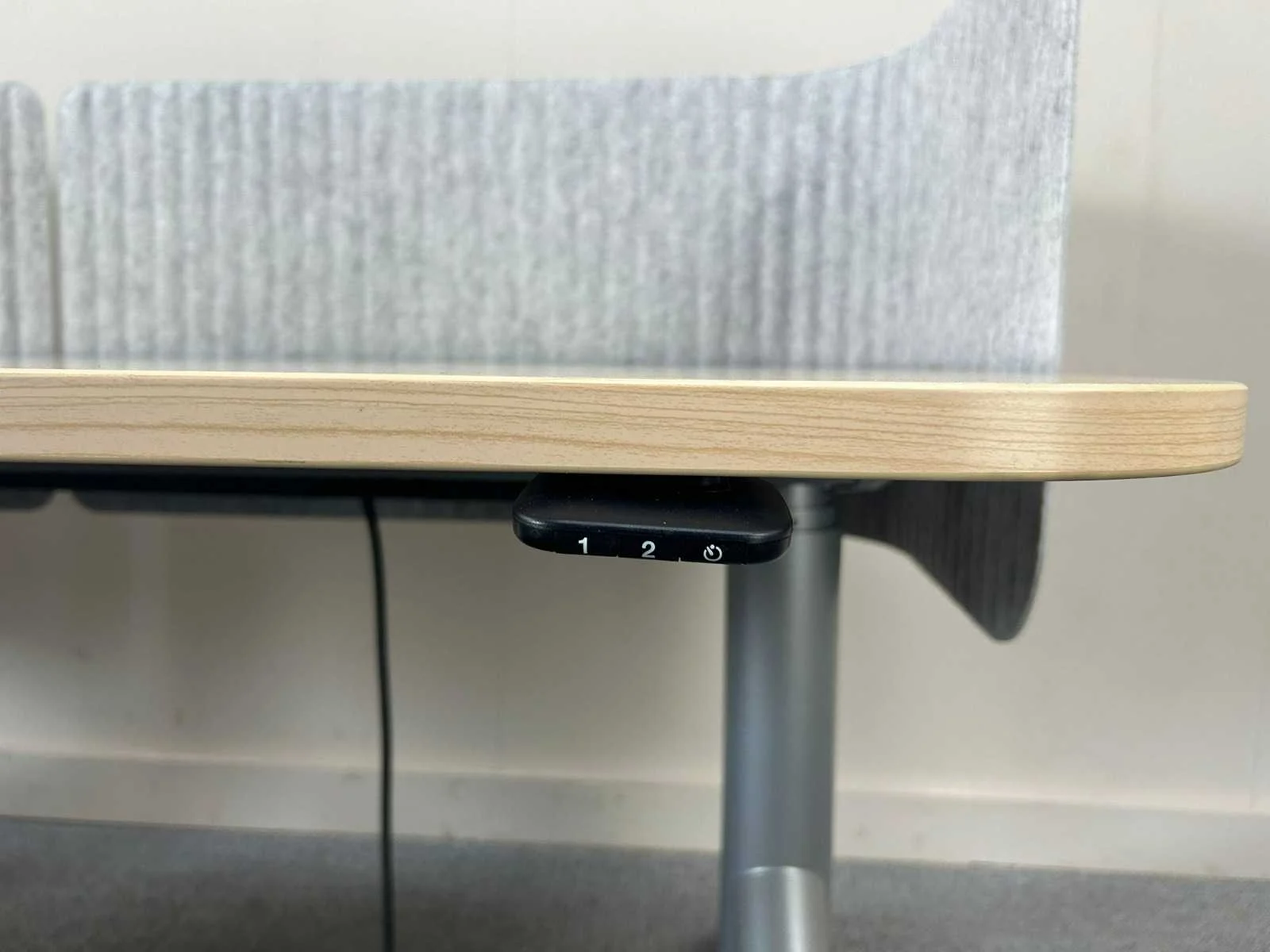 Steelcase flex collection zit-sta bureau, In goede staat maar met mogelijke schade of zit-sta mechanisme. Nee Merk: STEELCASE Type: Zit-Sta Bureautafel Model: Flex Collection Zit-sta: true Elektrisch verstelbaar: true Kleur: Grijs / Hout Breedte: 180cm Hoogte: 64-125cm Materiaal: Hout / Stof Diepte: 80cm