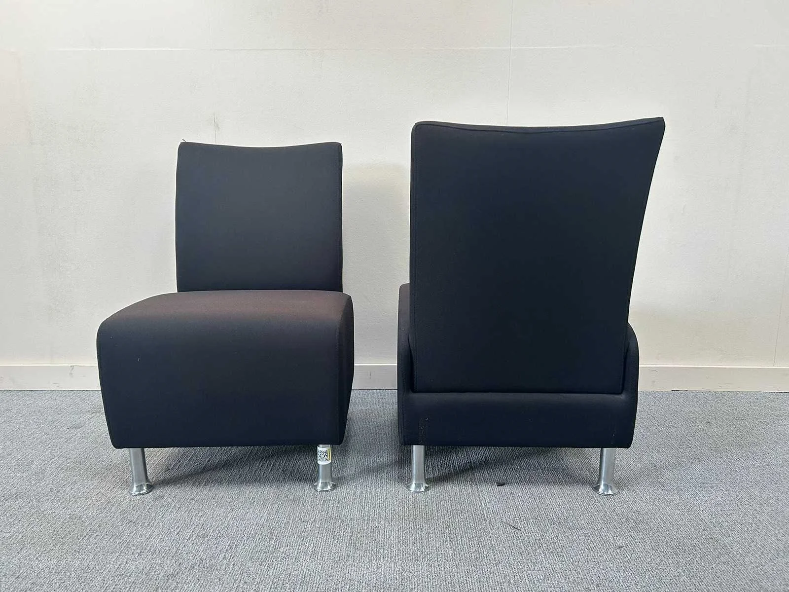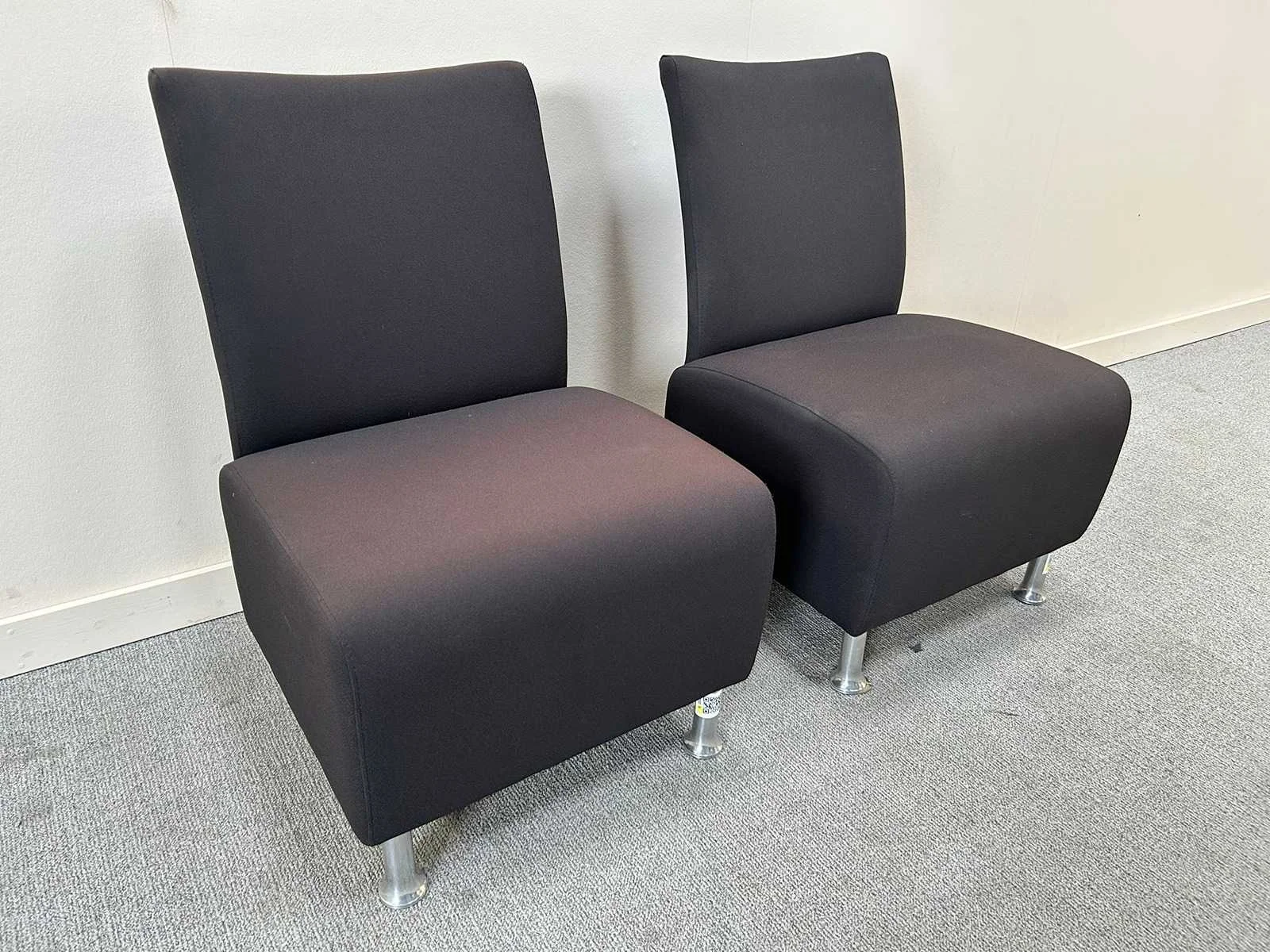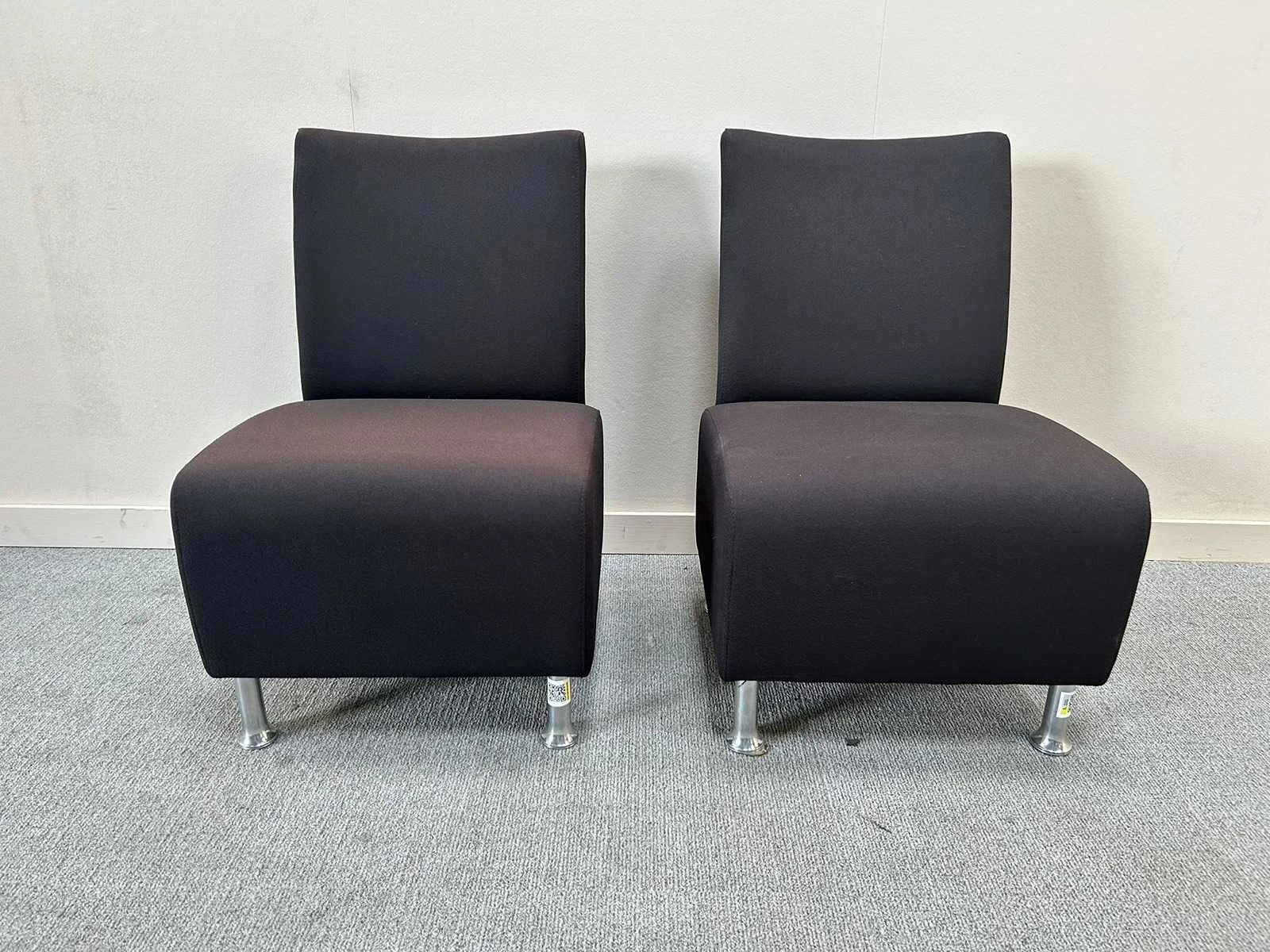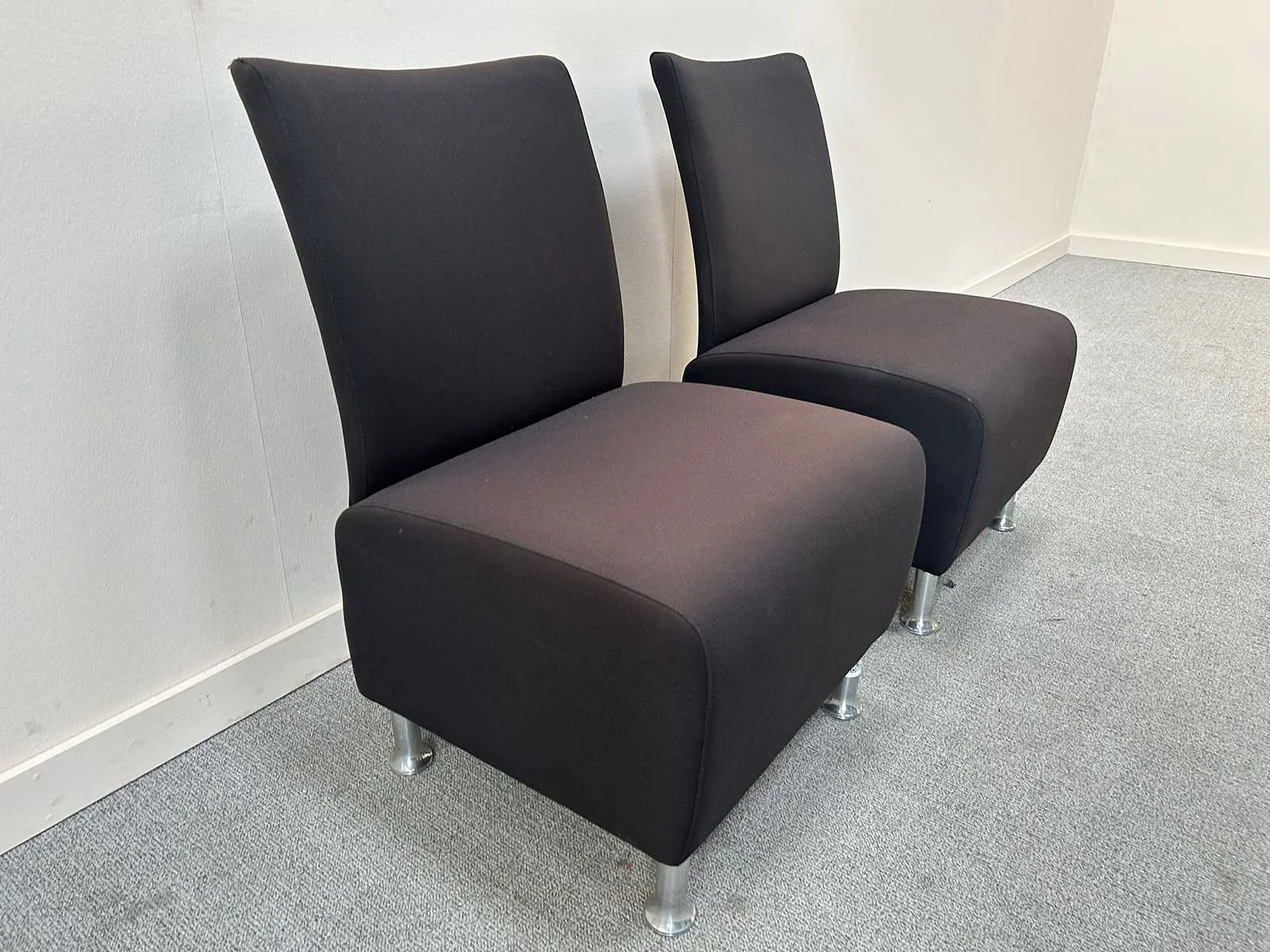 Een duo van 2 comfortabele ontvangstoelen in donker bruine stof, Met gebruikssporen, stofverzadiging. Nee Type: Ontvangststoel Kleur: Bruin Gewicht: 60kg Materiaal: Stof