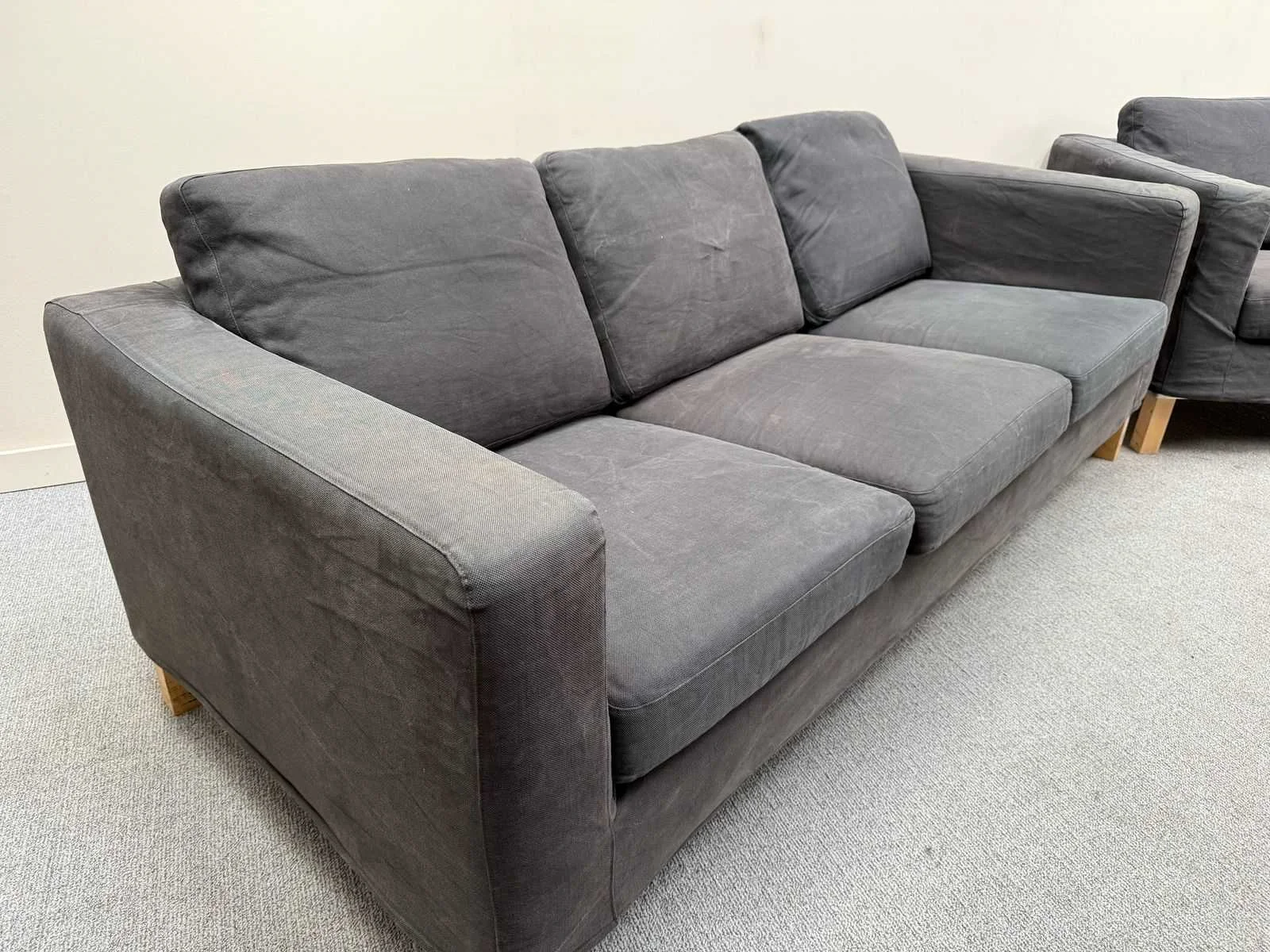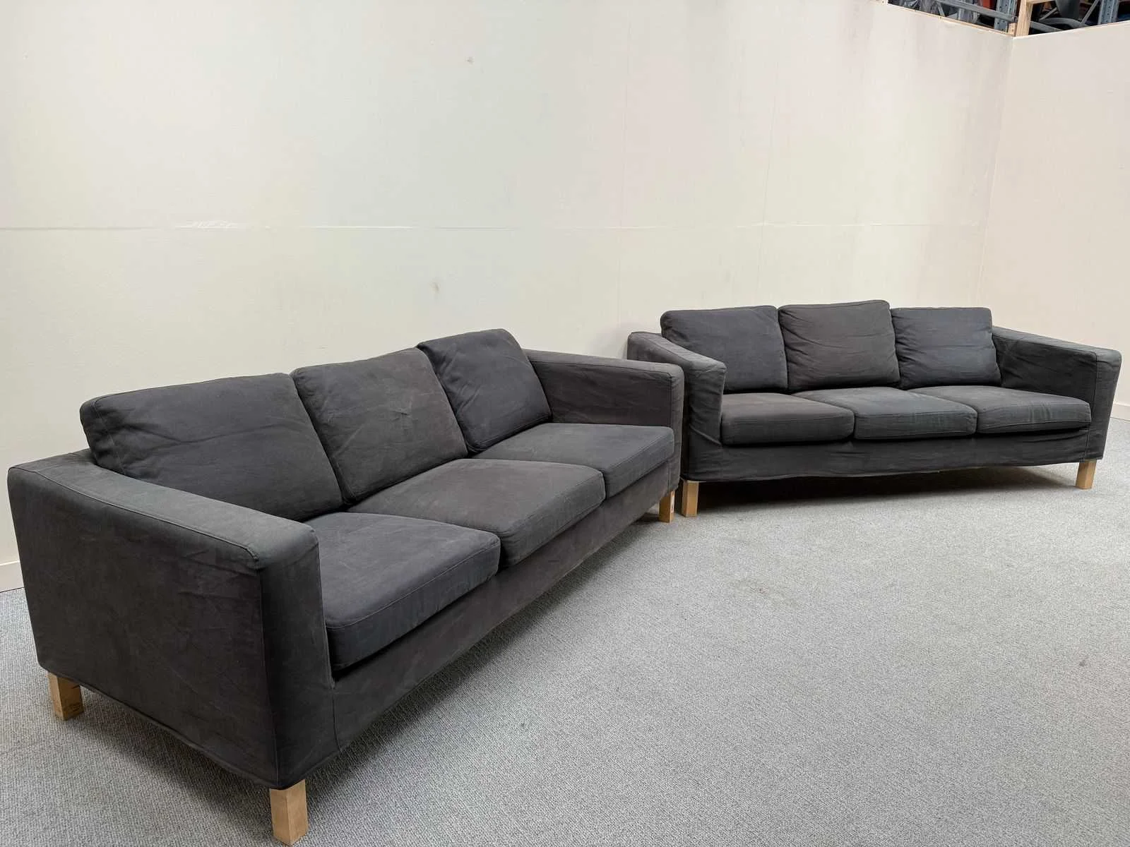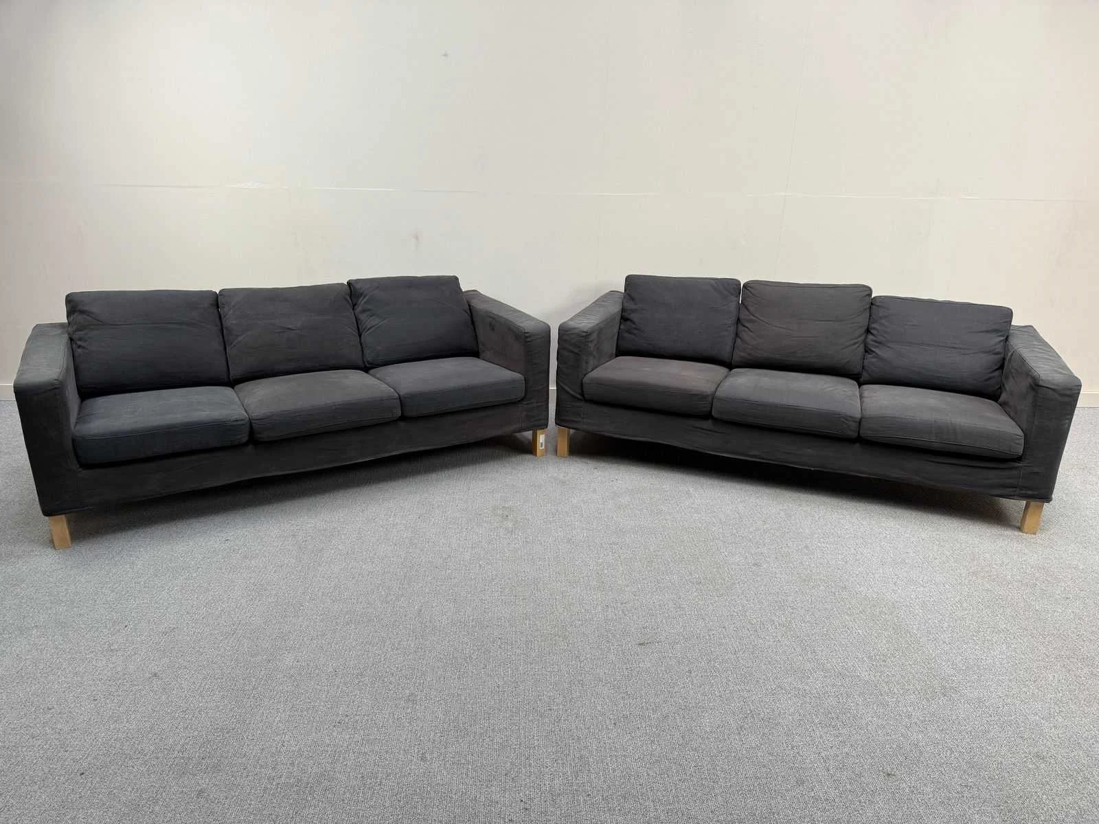 Een set van 2 Ikea zetels in donker grijze stof. Geschikt voor 3 personen per zetel. Met gebruikssporen op de zitoppervlakken. Nee Merk: IKEA Product type: Zetel 3-zit Zitplaatsen: 3 Kleur: Grijs Gewicht: 120kg Materiaal: Stof