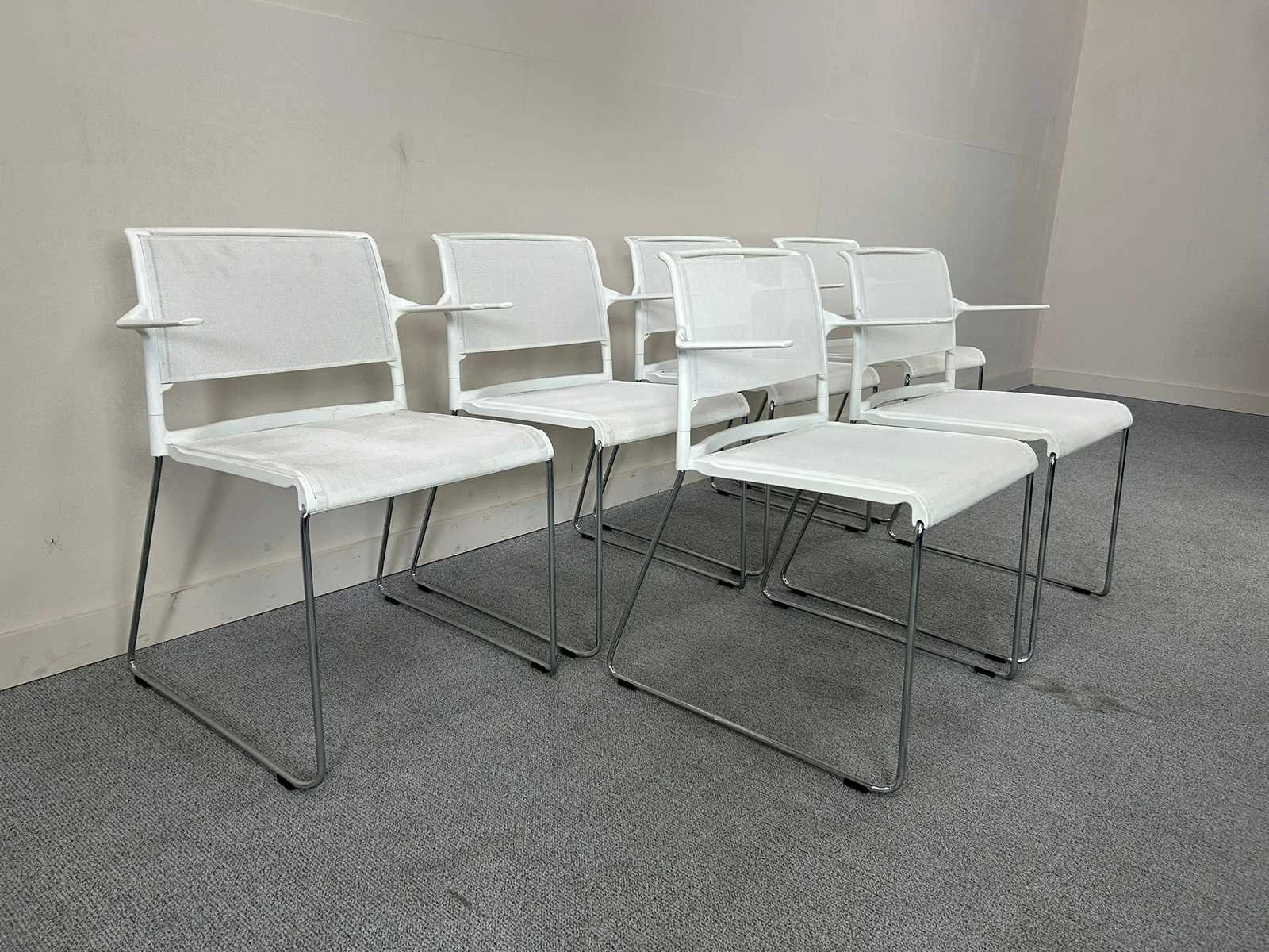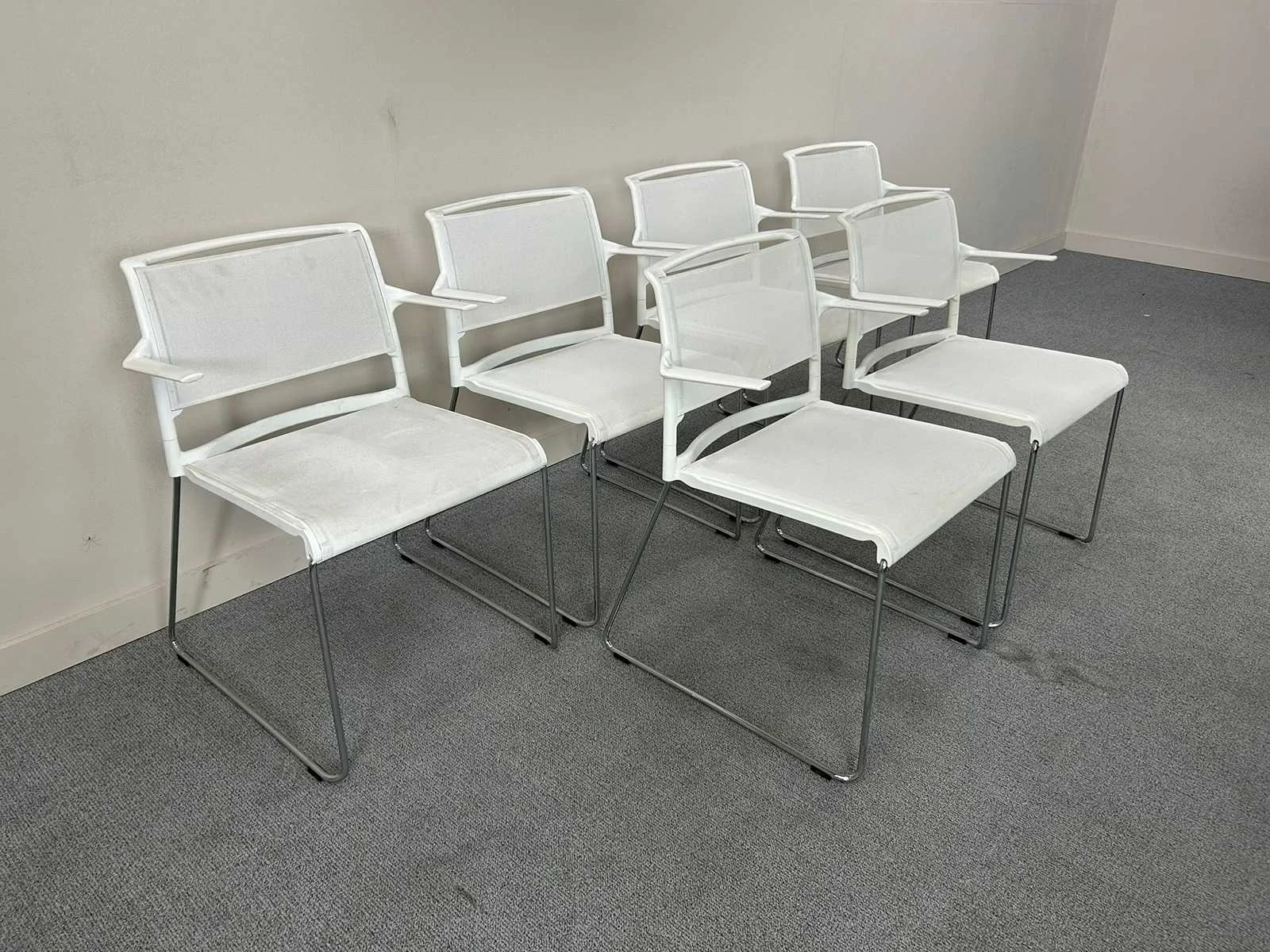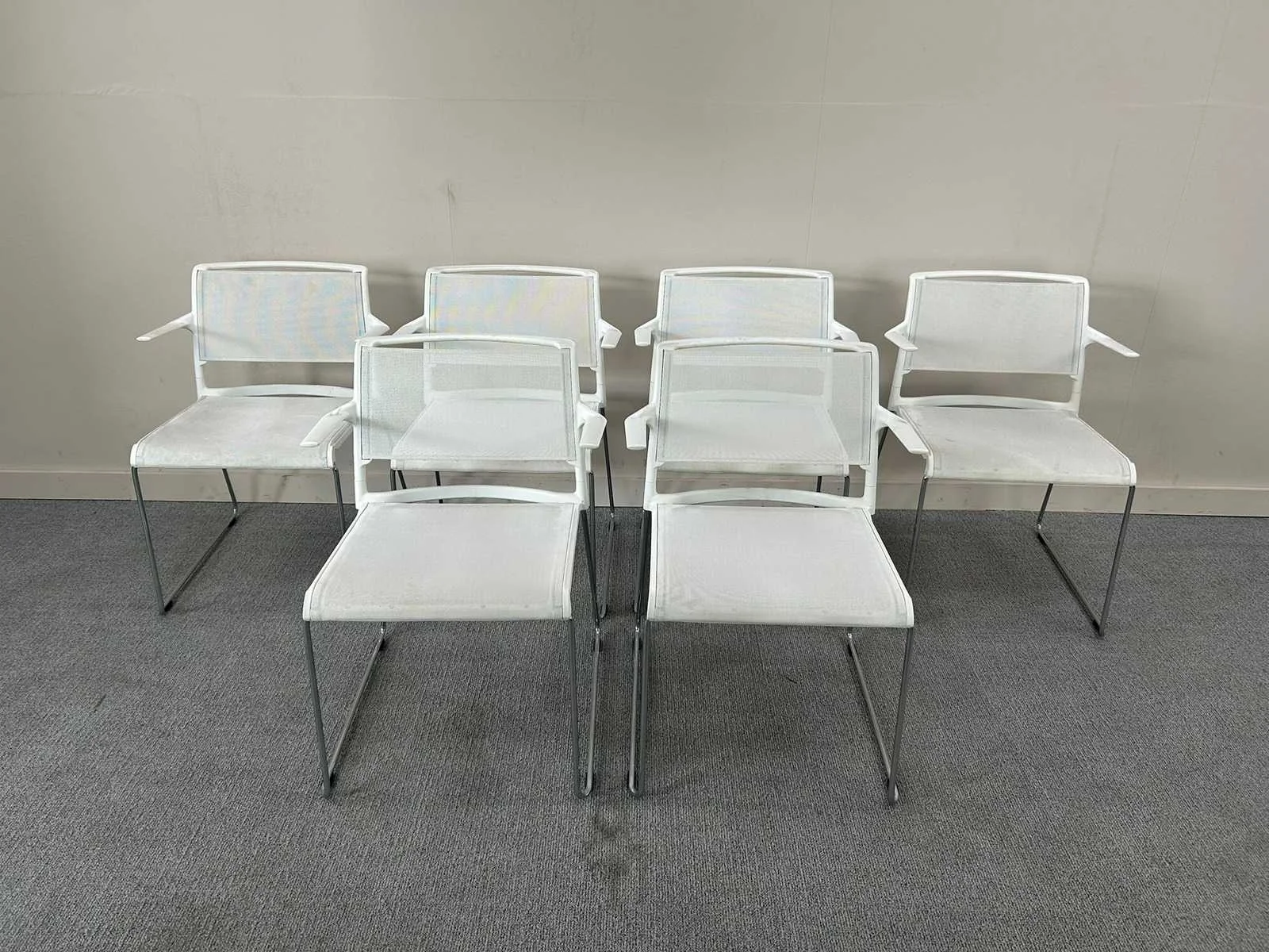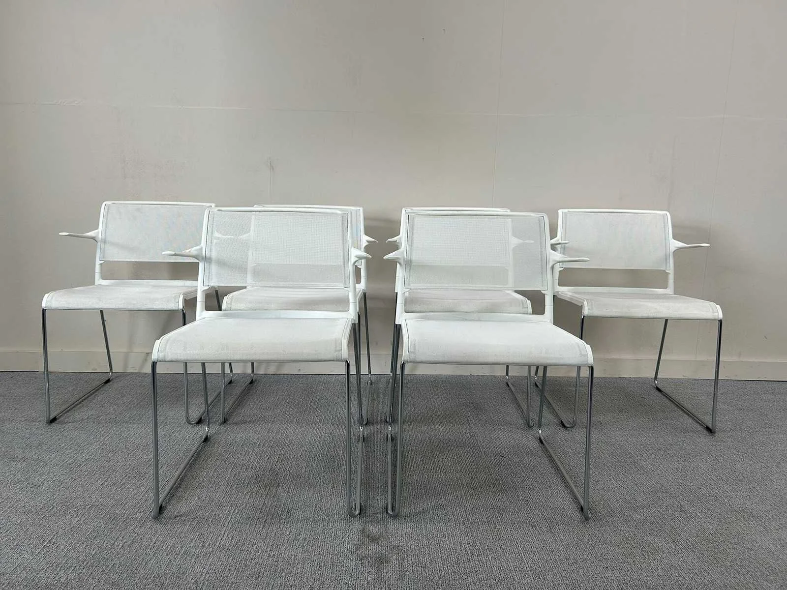Een set van 7 stapelbare Wilkahn sledepoot kantinestoelen in het wit. Met gebruikssporen, lichte verzadiging en vlekjes. Nee Merk: WILKHAHN Stapelbaar: true Kleur: Wit Gewicht: 65kg Materiaal: Kunststof/Mesh