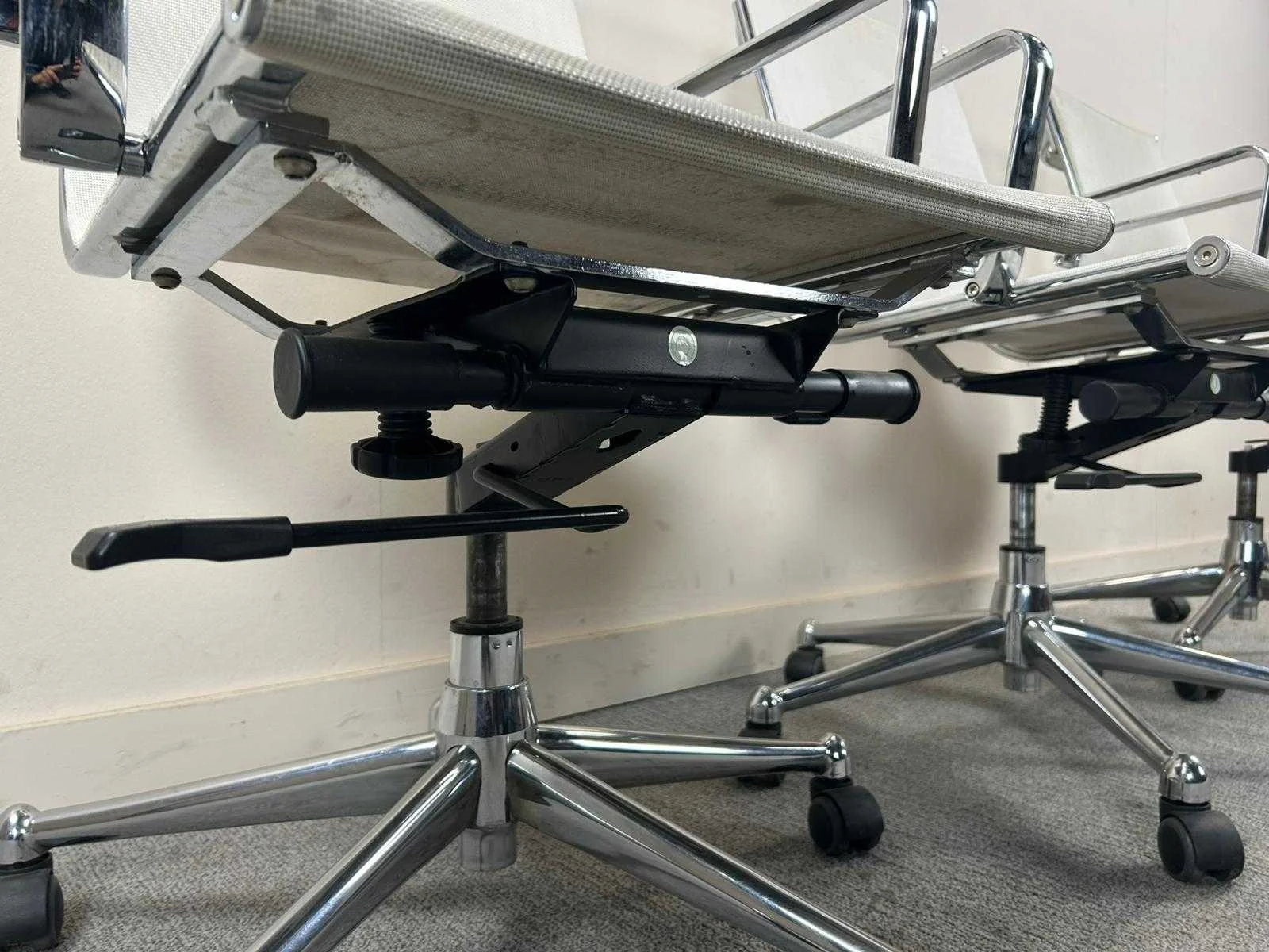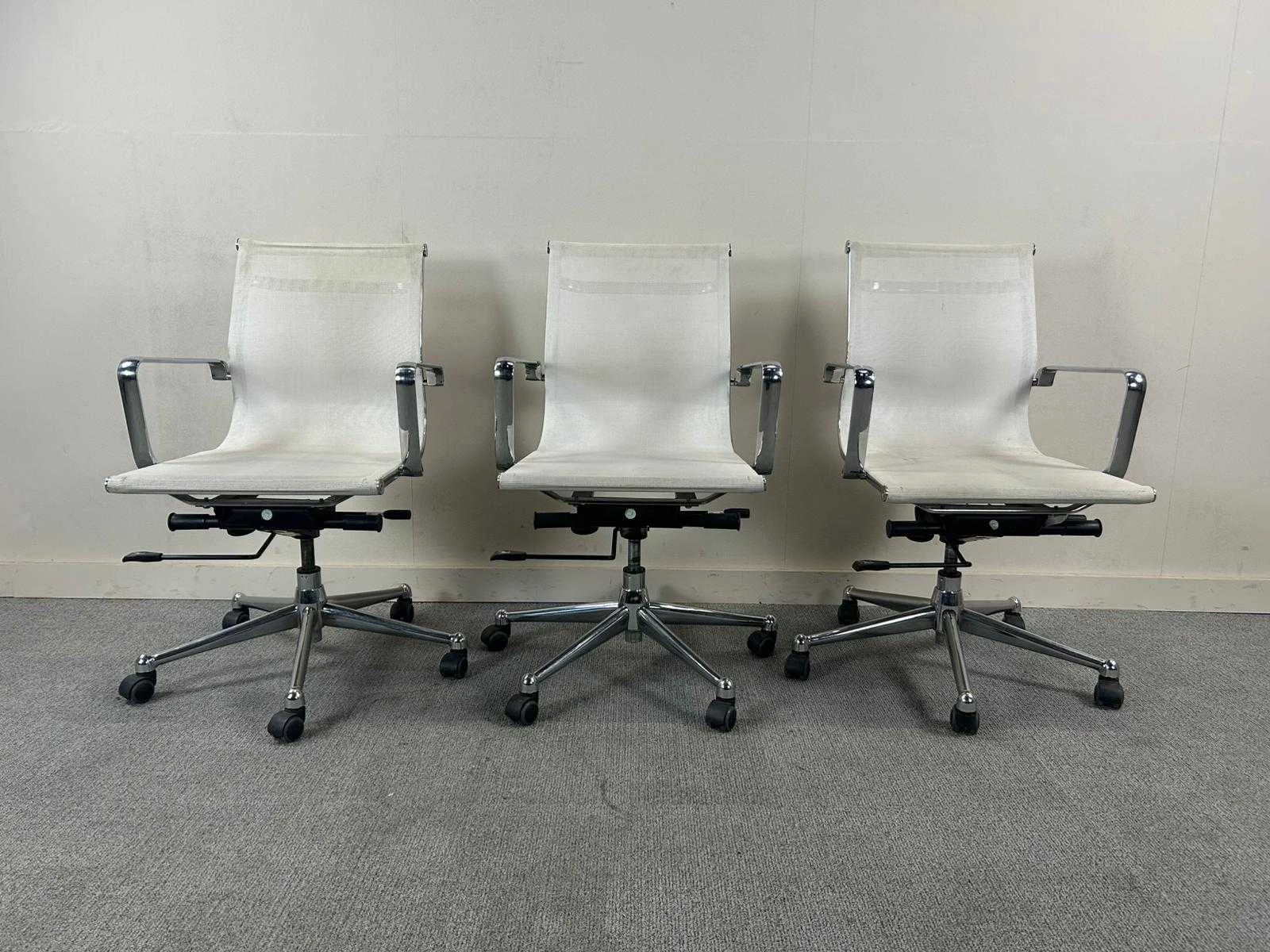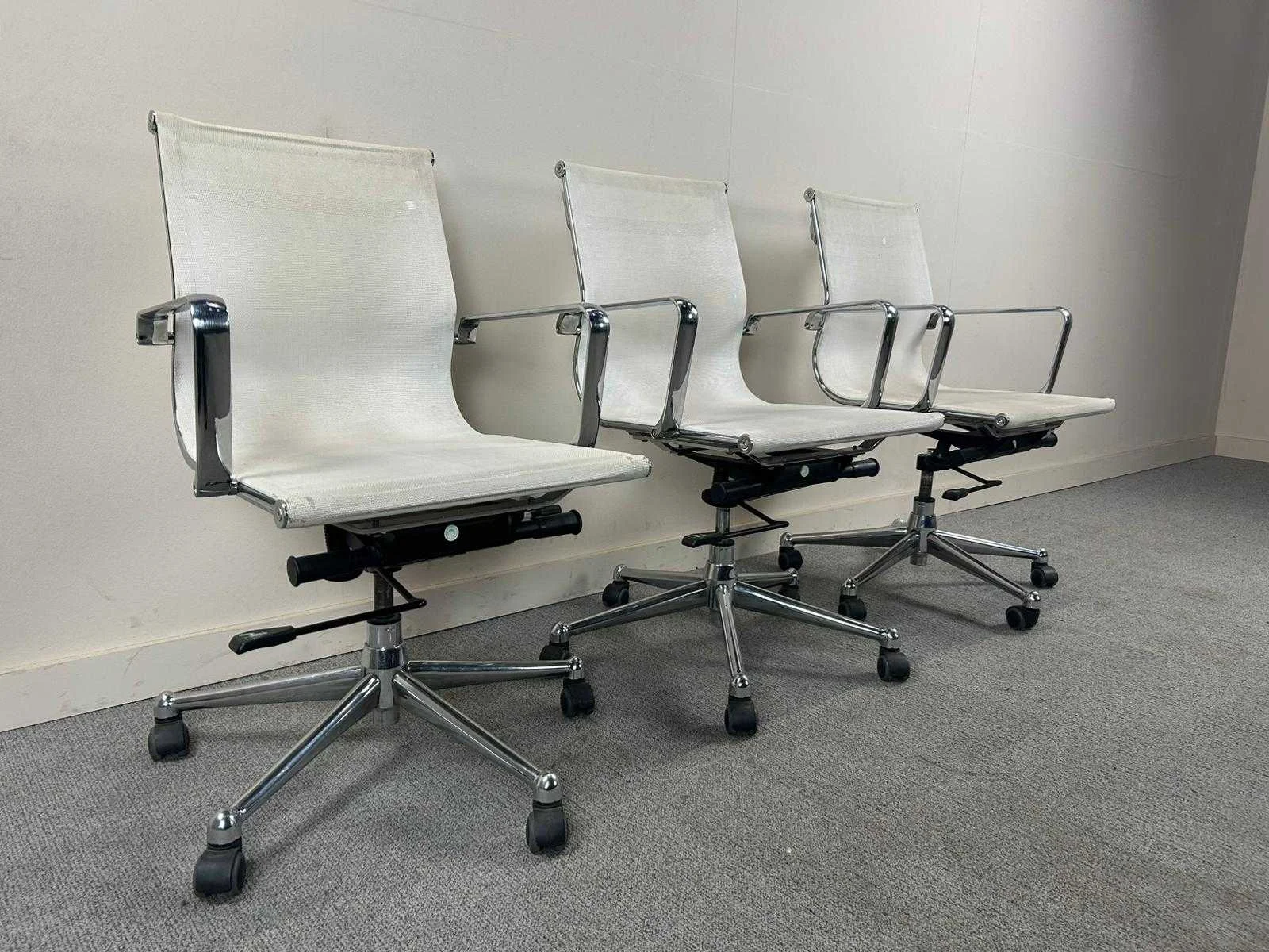 Trio van witte bureastoelen met voetkruis met wielen. Met gebruikssporen, stofverzadiging. Nee Kleur: Wit Gewicht: 80kg
