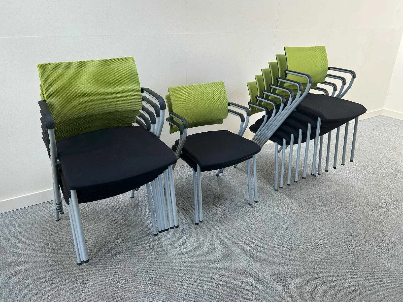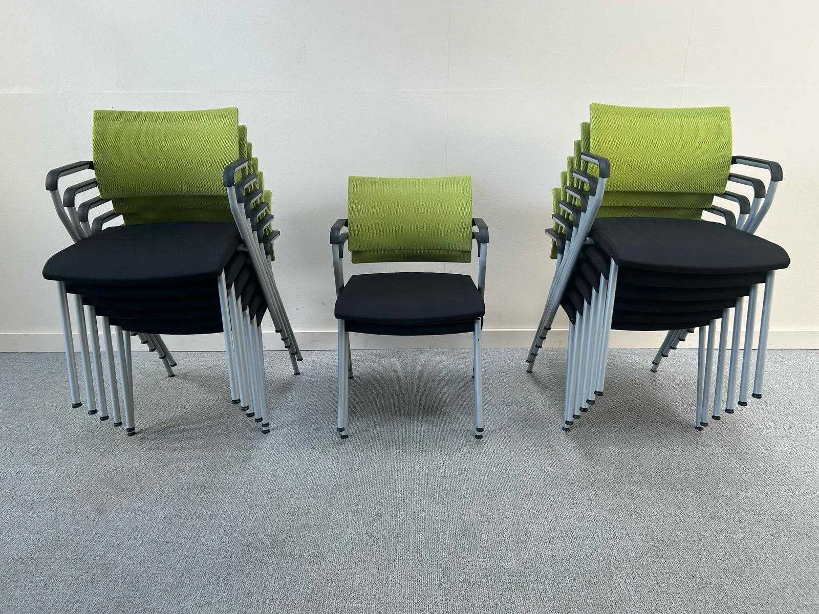 Een set van 14 stapelbare Bene bezoekersstoelen met zwarte stoffen bekleding en groene mesh rugleuning. Enkele lichte gebruikssporen. Kan verschillen per item. Nee Merk: BENE Type: Stapelbare Bezoekersstoel Kleur: Groen / Zwart Gewicht: 180kg Materiaal: Mesh / Stof