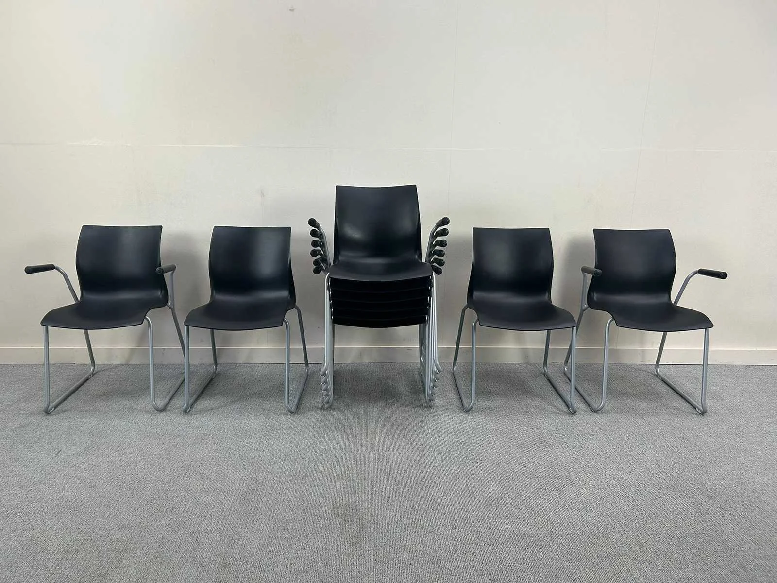 Een set van 10 stapelbare NAMI vergaderstoelen in het zwart, waarvan 2 zonder armleuningen. Met gebruikssporen, staat kan variëren per item. Nee Merk: NAMI Product type: Stapelbare kantinestoel Kleur: Zwart Gewicht: 75kg Materiaal: Kunststof