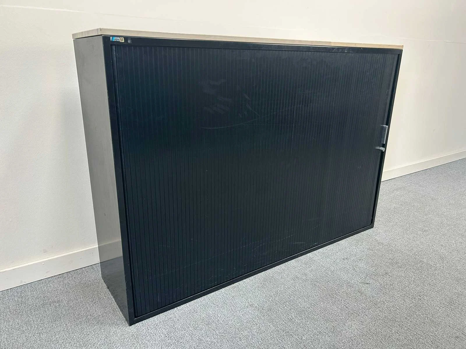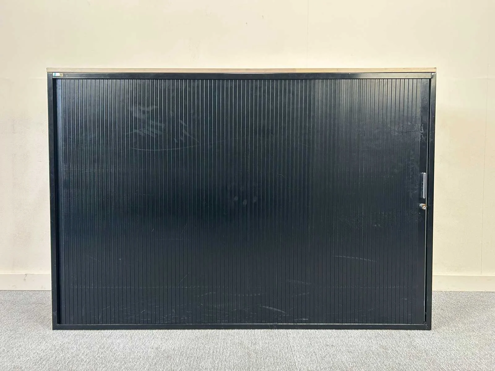 Dossierkast zwart, met schuifdeur, 2 x 2 leggers, met gebruiksporen, sleutel niet gegarandeerd Nee Merk: LISTA Kleur: zwart Breedte: 160cm Hoogte: 110cm Materiaal: metaal Diepte: 40cm