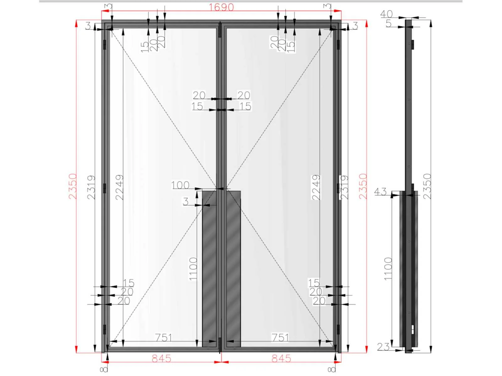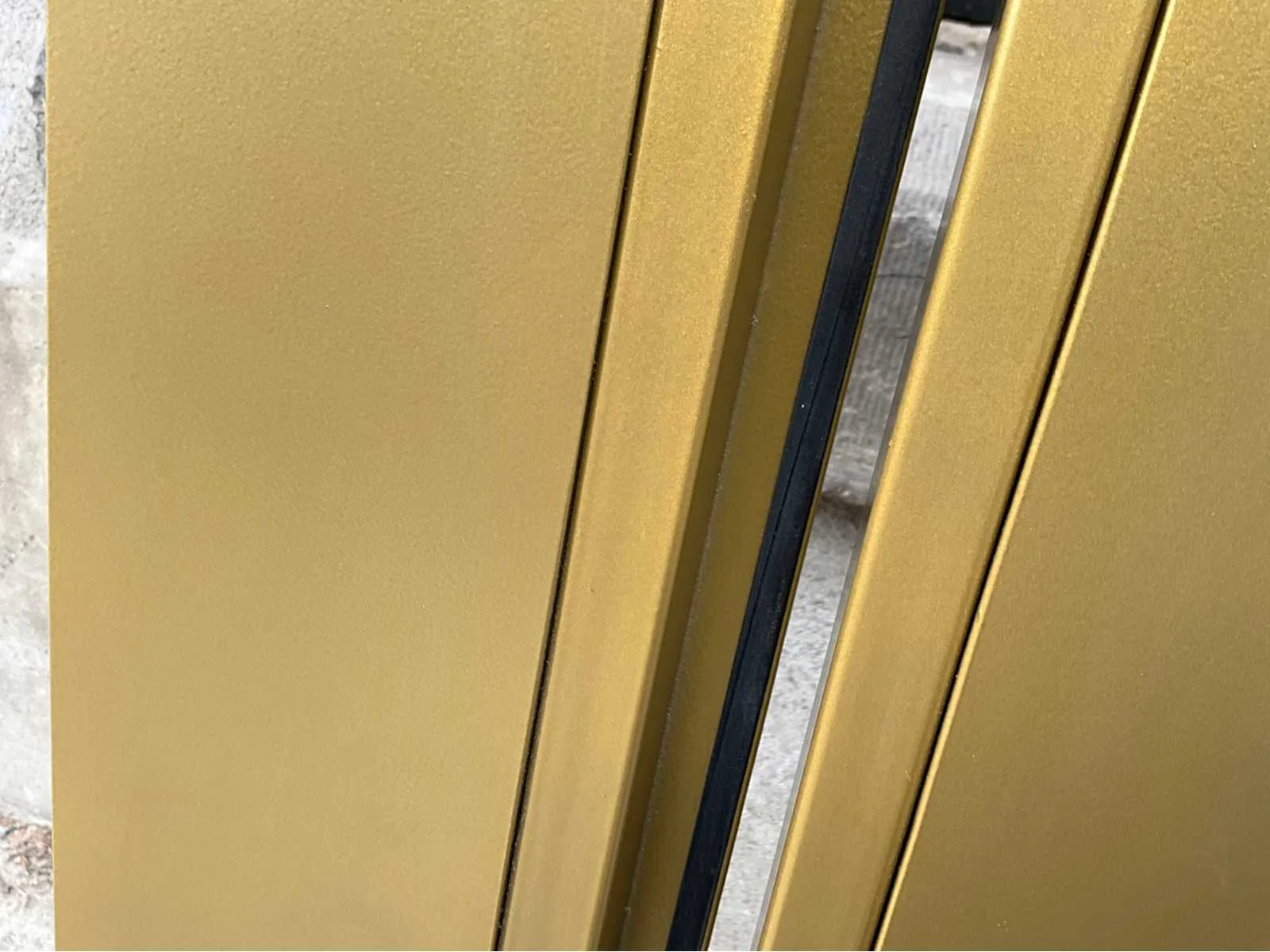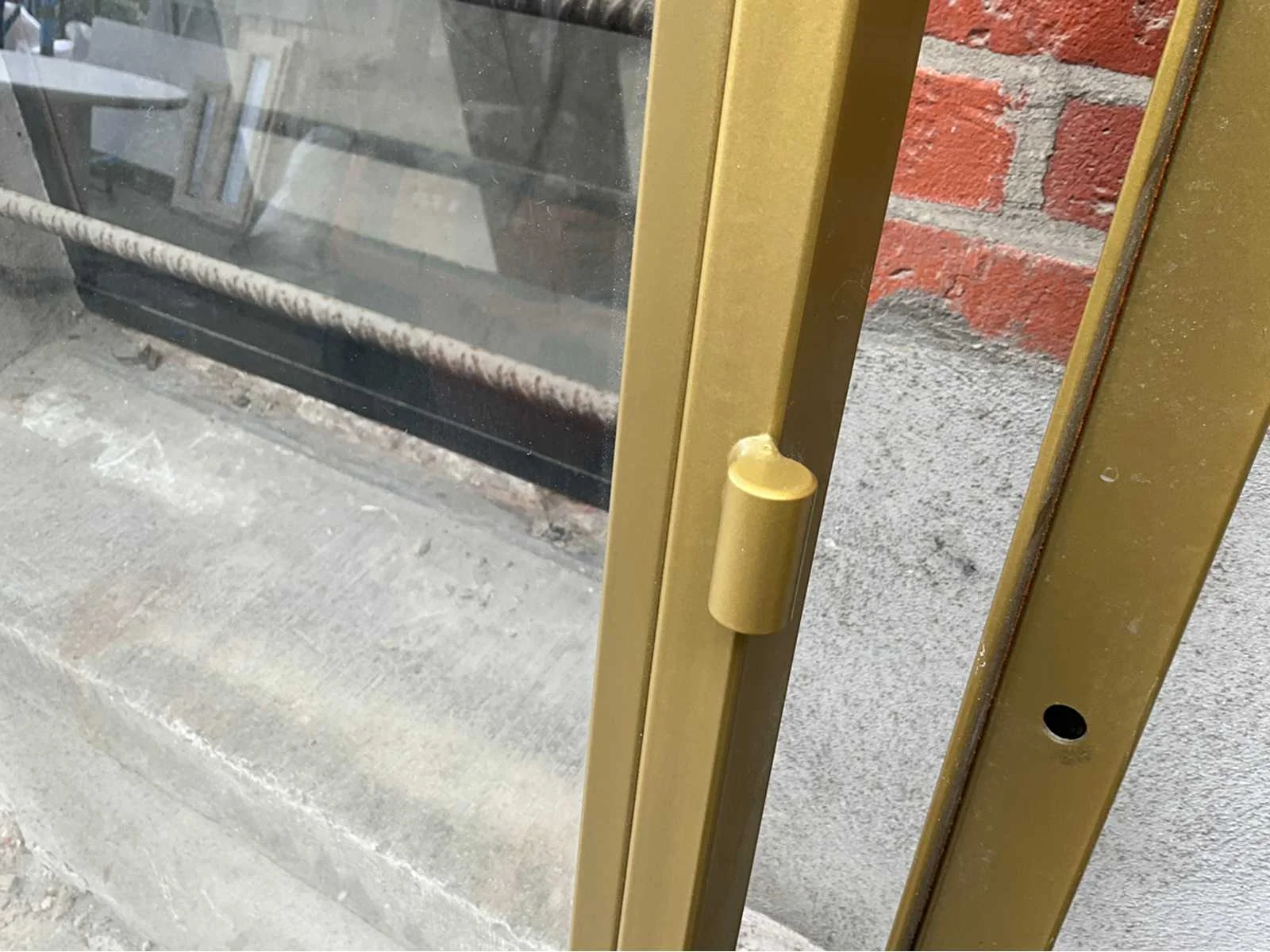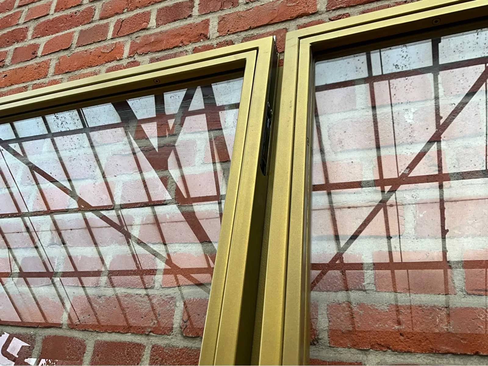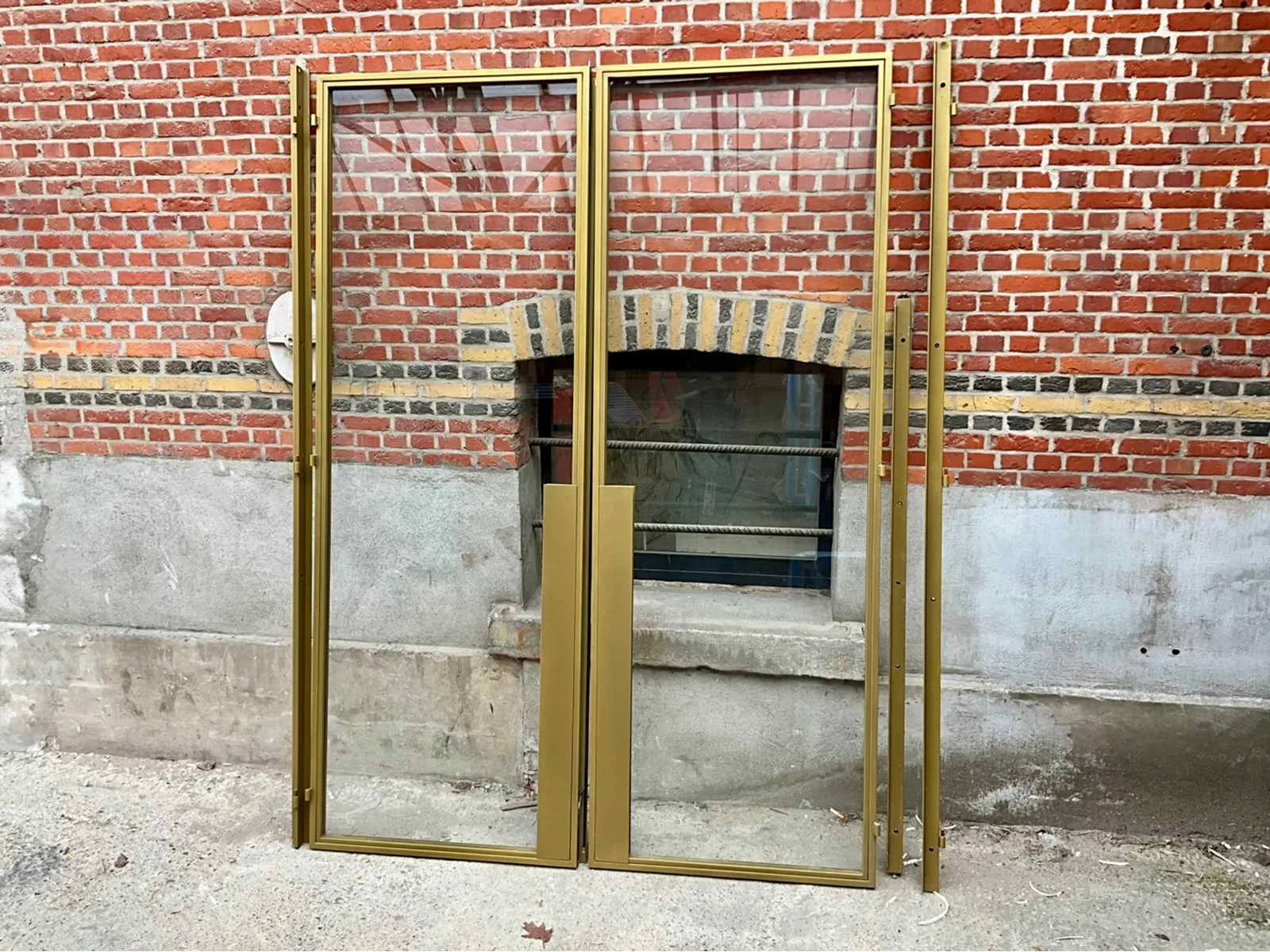 Stijlvolle dubbele glazen deur met slank aluminium profiel, in luxueuze gouden kleur (RAL 1036) - Transparant veiligheidsglas zorgt voor een moderne, lichte uitstraling - Geschikt voor elke interieurtoepassing: kantoor, showroom, woning of winkelruimte - Deurbladen voorzien van stevige scharnieren, sluitpennen en rubberafdichtingen - Strak en elegant design met doorlopend handgreepprofiel over 1100 mm hoogte - Zware kwaliteit aluminium constructie met nauwkeurige passing (technisch detail bijgevoegd) - De deuren zijn demontabel geleverd inclusief verticale en horizontale profielstukken - Conditie: In zeer nette staat, éénmalig geplaatst maar omwille van foutieve kleur onmiddellijk terug gedemonteerd - Glas volledig intact, geen barsten of breuken - paar zeer lichte krasjes op het profiel, amper zichtbaar. Afmetingen 1690 B x 2350 H x 40 mm - levering te bespreken met verkoper Nee Binnendeur: true Beglaasd: true Afmeting h: 2350mm Afmeting b: 1690mm Aluminium: true Dikte: 40mm Glas: true Kleur: RAL1036