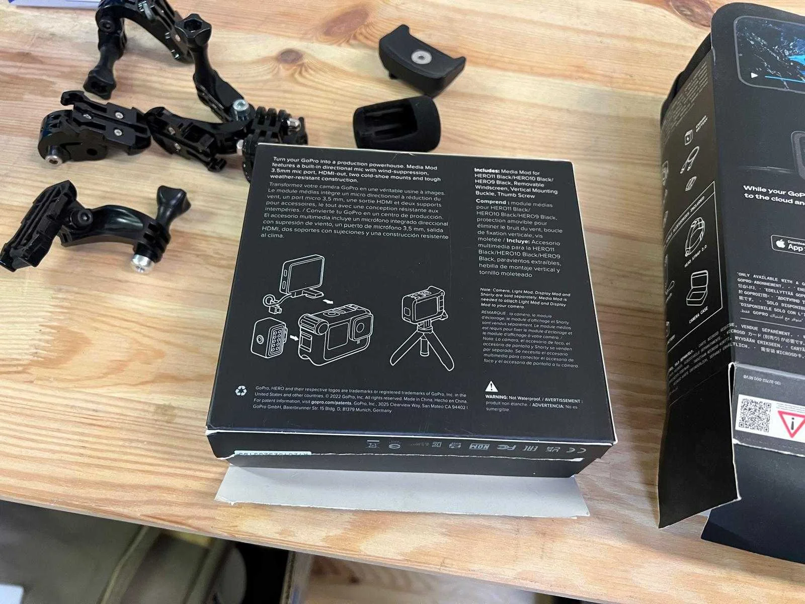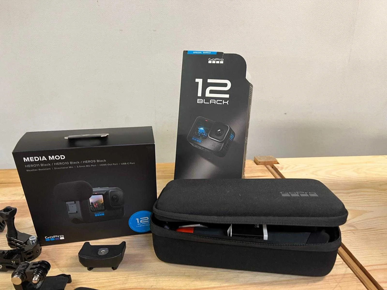 Set bestaande uit GoPro Hero 12 Black actiecamera met originele draagcase, Media Mod microfoonmodule, dubbele acculader met 2 Enduro batterijen, Phoenix MCI0 lavalier microfoon, diverse montagematerialen (bevestigingsclips, klemmen en mounts). In originele verpakking, inclusief kabels en handleidingen. Nee Merk: GoPro Model: Hero 12 Black Product type: Actiecamera / Videocamera Wifi: true Video functie: true Geheugen type: MicroSD Accu: true Mps: 27mp Foto resolutie: 27 Functies: HyperSmooth 6.0 stabilisatie, waterdicht tot 10 m, Bluetooth/WiFi, livestreaming, slow motion, HDR video Kleur: Zwart Materiaal: Kunststof / Metaal