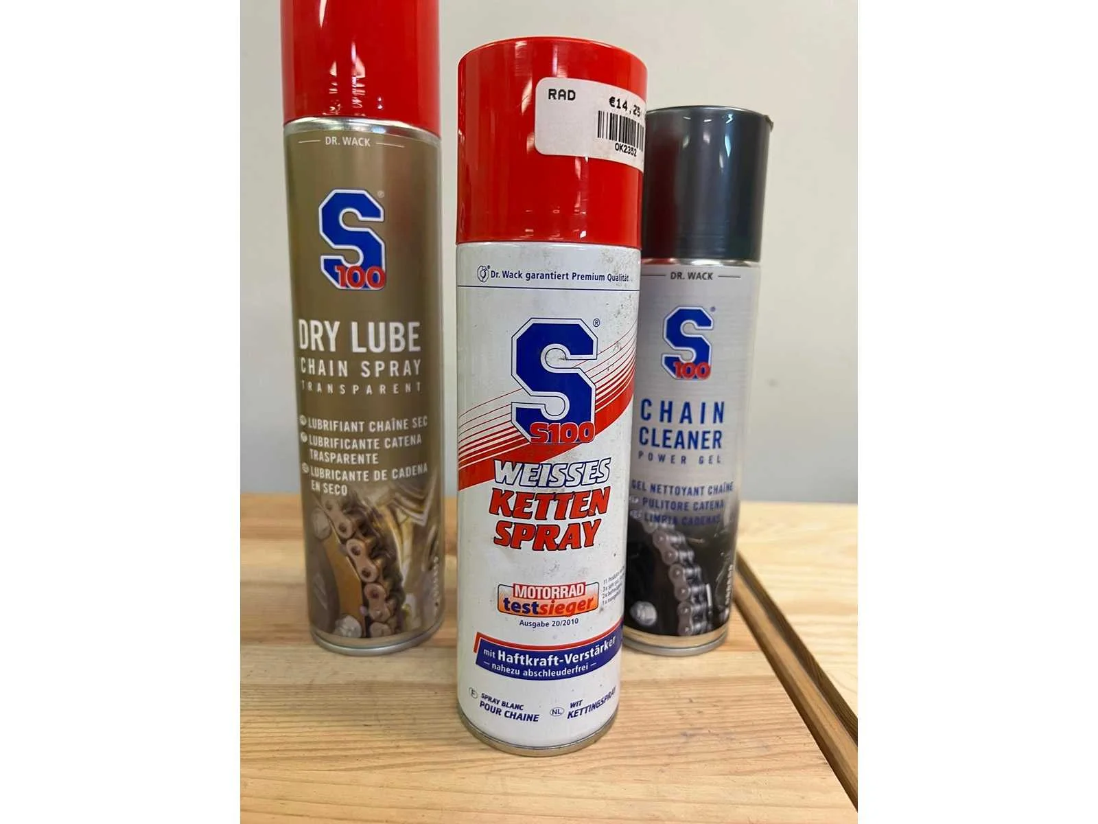 Set van 3 spuitbussen kettingonderhoud van Dr. Wack – S100. Bevat: - S100 Dry Lube Chain Spray Transparent (droge kettingspray) - S100 Weisses Kettenspray (witte kettingspray met hoge hechting) - S100 Chain Cleaner Power Gel (kettingreiniger in gelvorm) Geschikt voor motorfietsen, scooters en andere kettingaangedreven voertuigen. Nee Merk: S100
