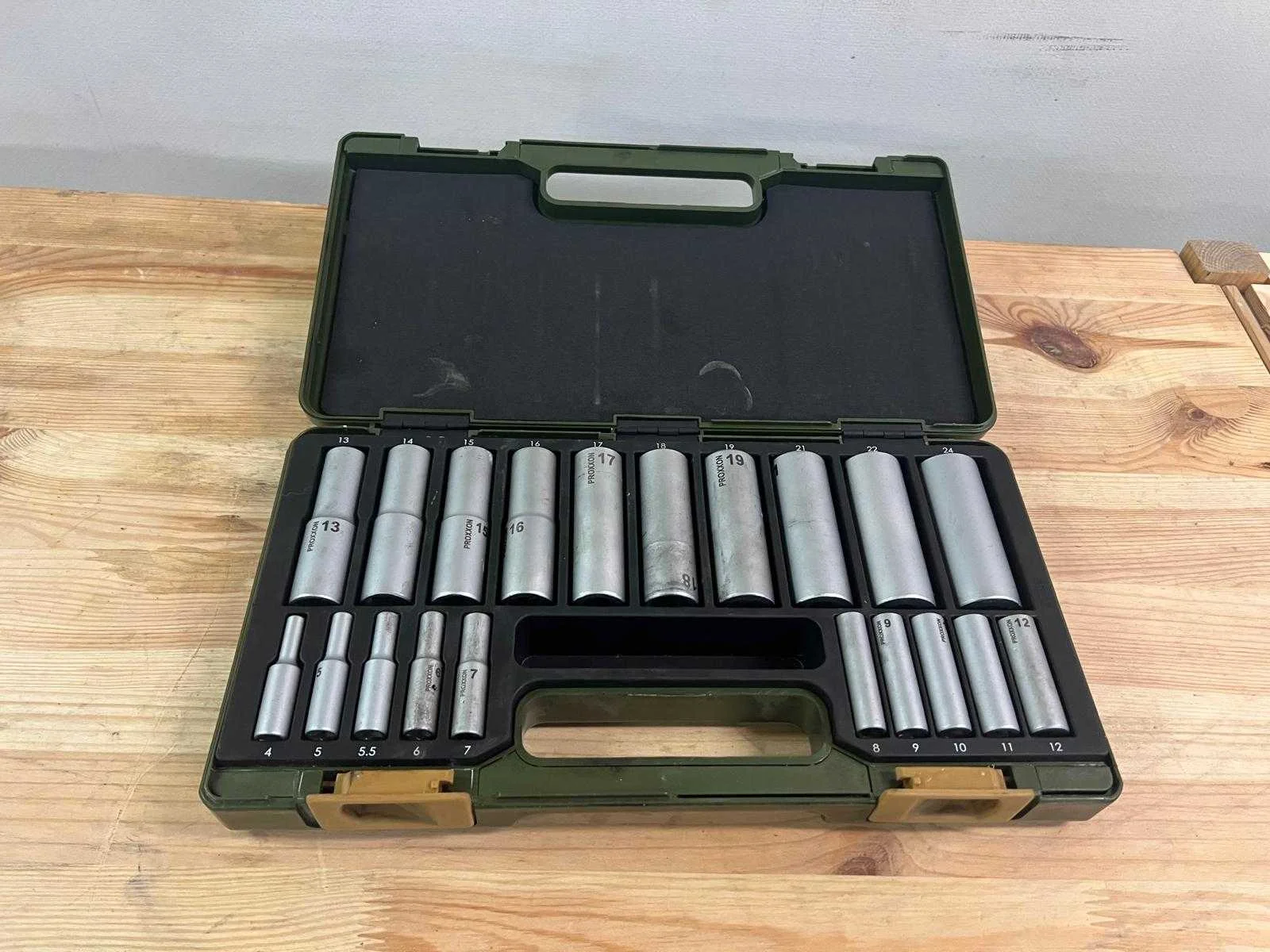 Proxxon 20-delige lange doppenset in groene kunststof koffer (No. 23 292). Bevat doppen van 4 t/m 24 mm, inclusief lange uitvoeringen. In nette staat, compleet met originele koffer. Nee Merk: Proxxon Met koffer: true Delig: 20