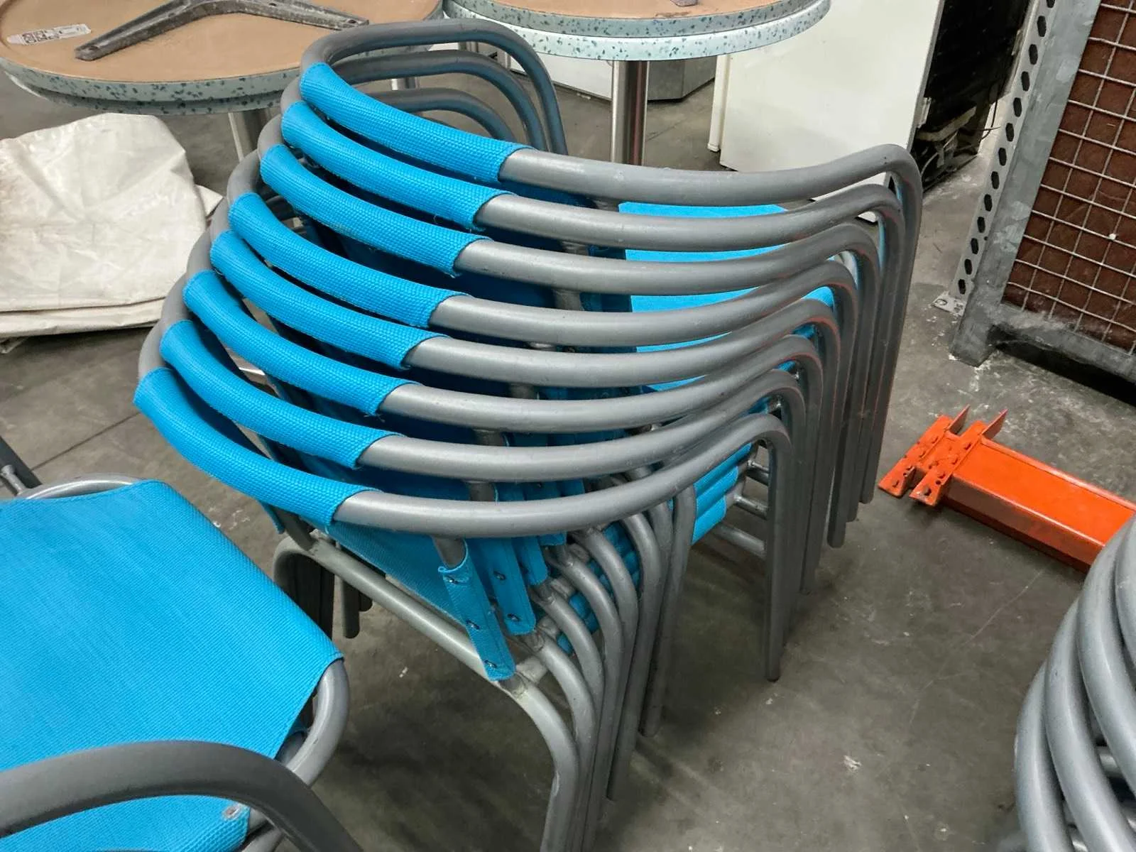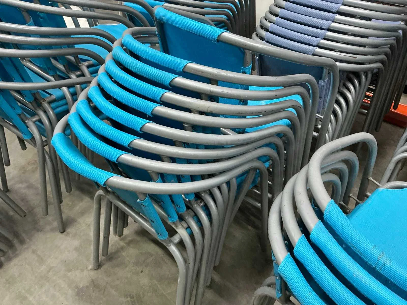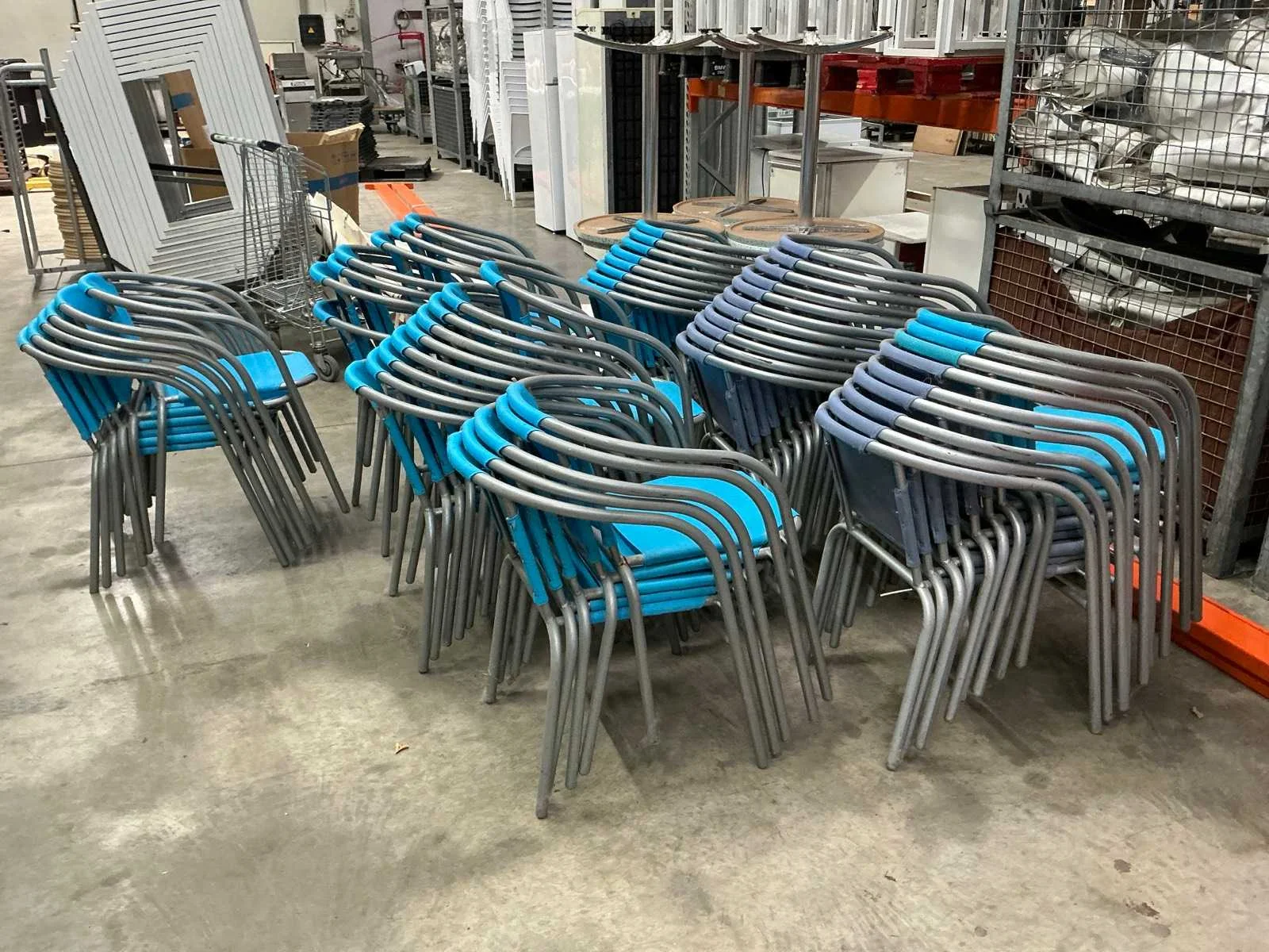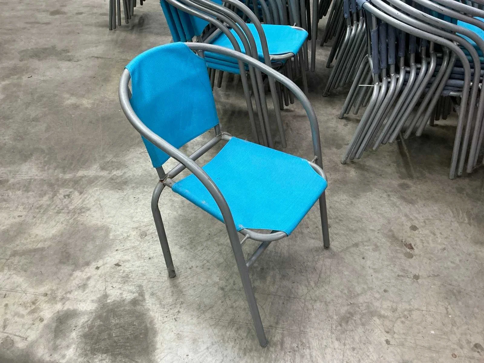 In gebruikte staat. 55 stoelen en 6 ronde tafeltjes Nee Kleur: Blauw paars