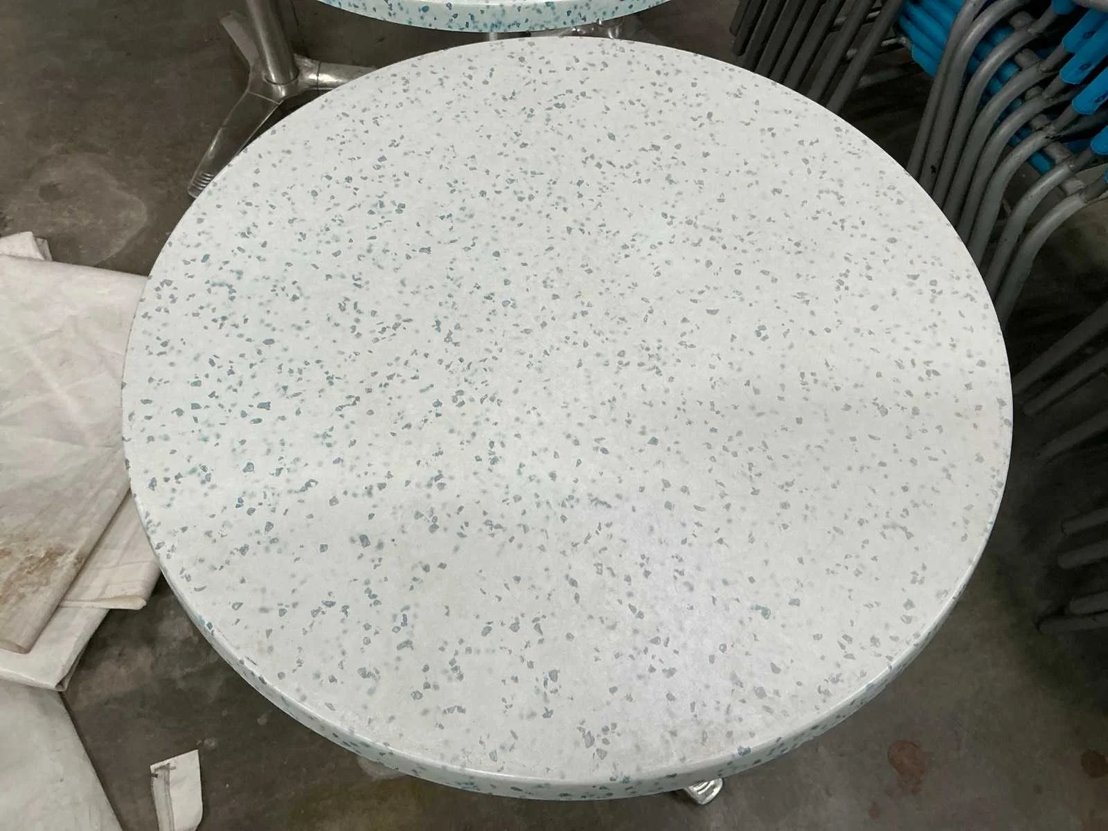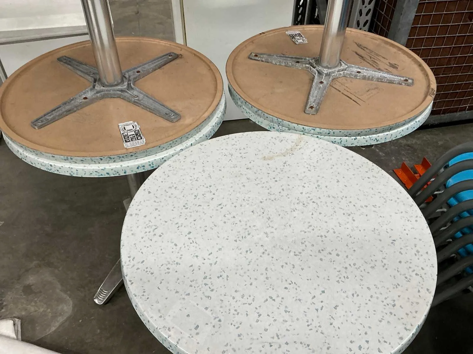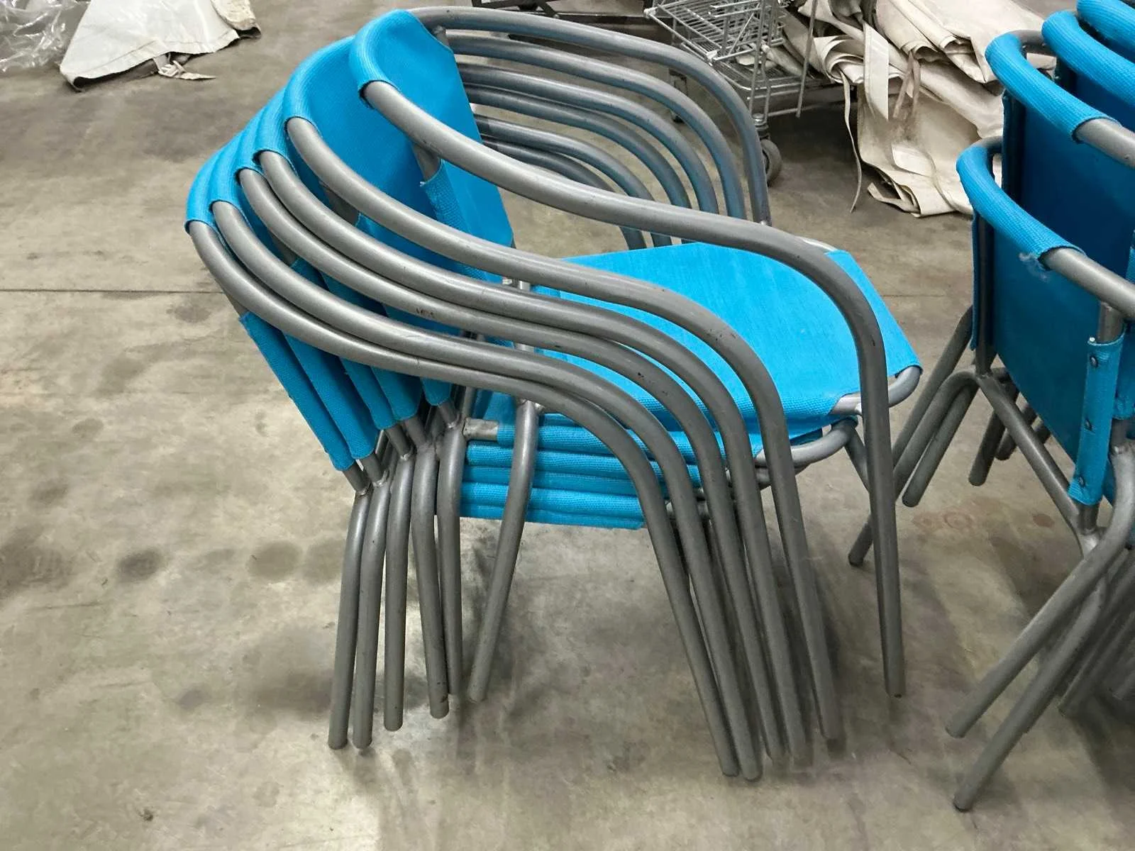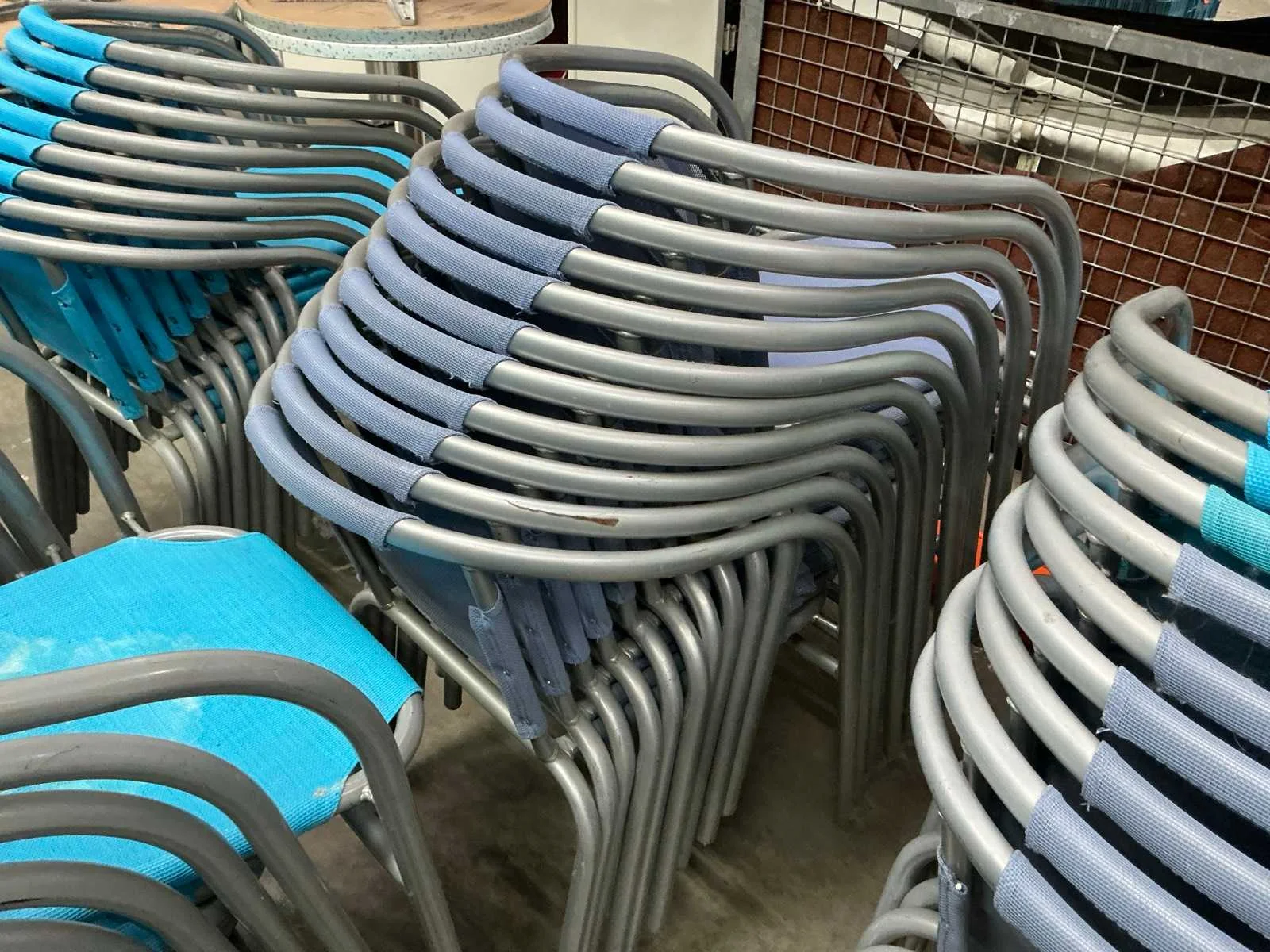 In gebruikte staat. 55 stoelen en 6 ronde tafeltjes Nee Kleur: Blauw paars