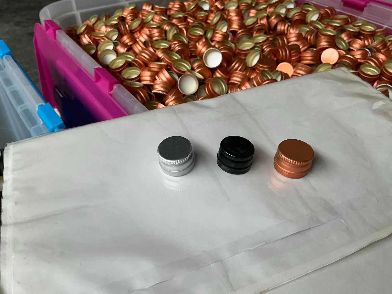 Dit lot bestaande uit meerdere ‘Schroefdop PP18’ in kleuren: zwarte, grijs (zilver) en koperkleurig. Stock: zwart: 1500 (1 box) Stock: zilver: 6000 (3x2000 in box) Stock: koper: 130000 (8 cartons +2000 in a box) Nee Merk: Schroefdop PP18