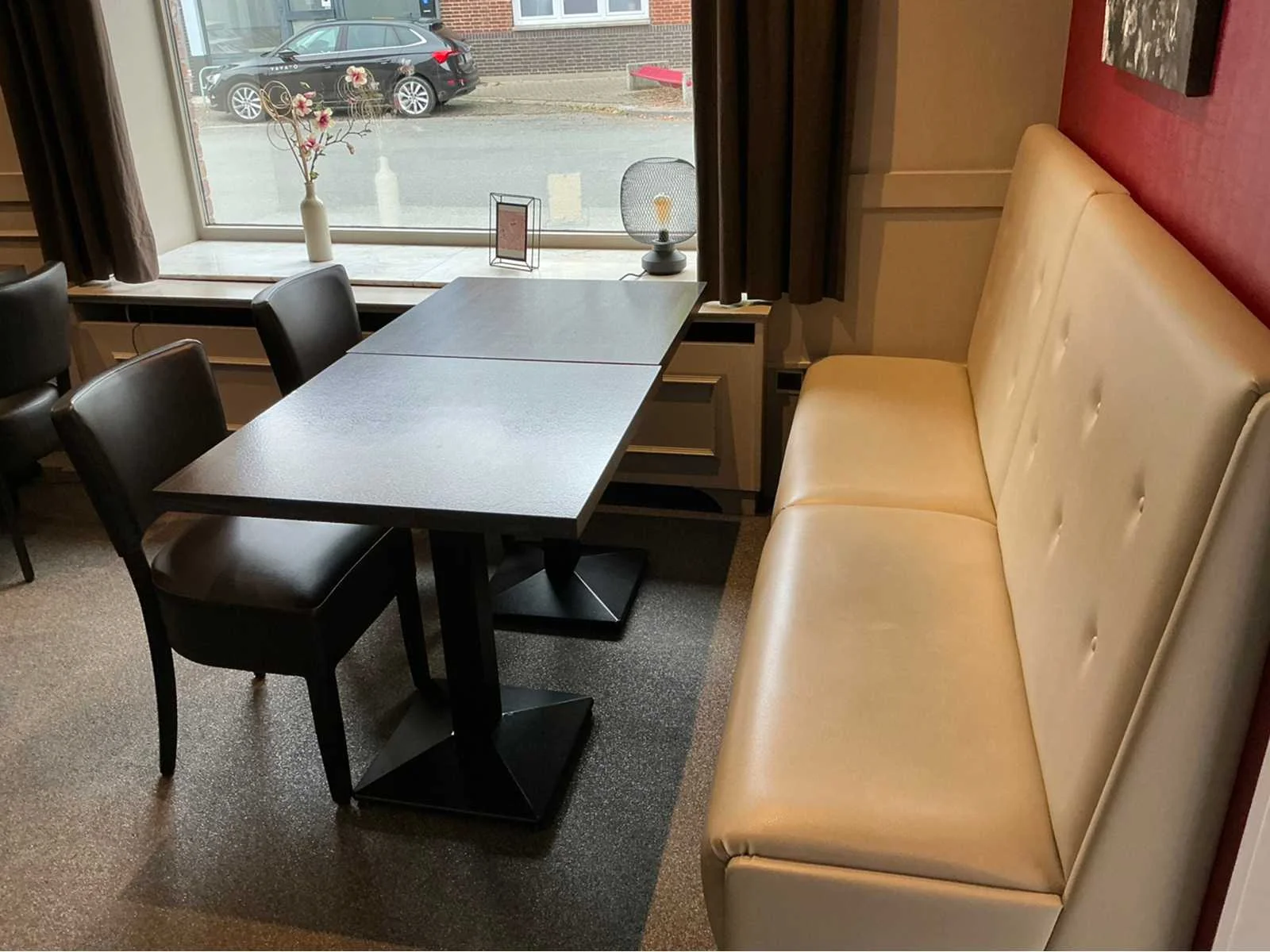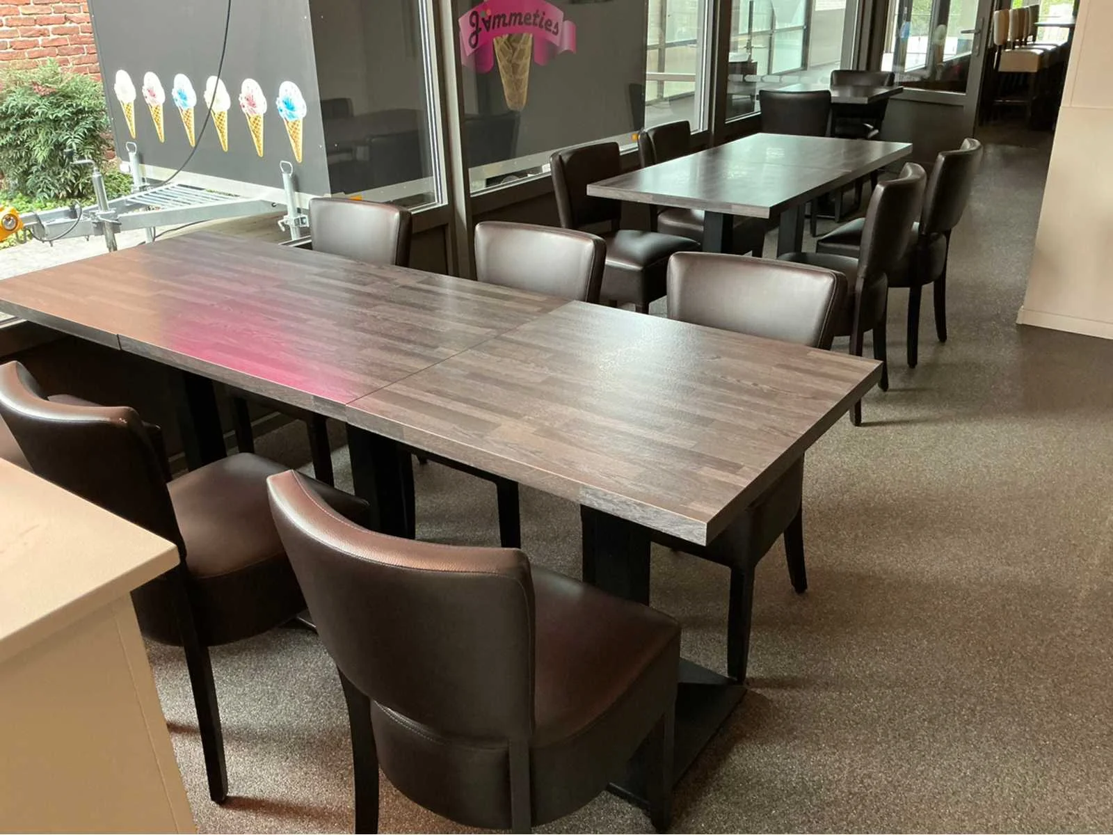 Wegens stopzetting van activiteiten deze mooie houtlook met zwarte poot horeca tafel / terrasstafel in goede staat zonder zichtbare beschadigingen. Nee Kleur: Bruin / Zwart Materiaal: Leder
