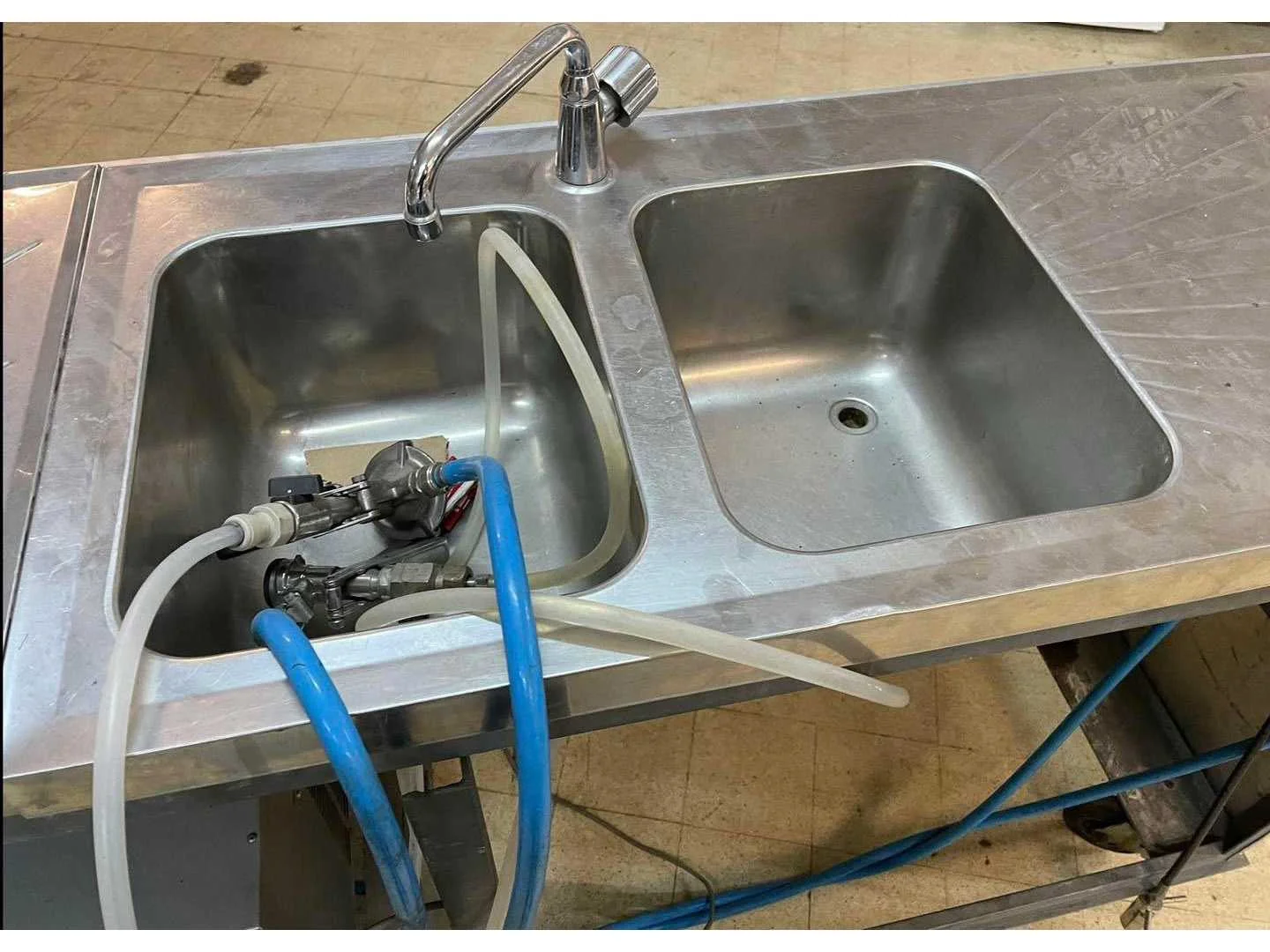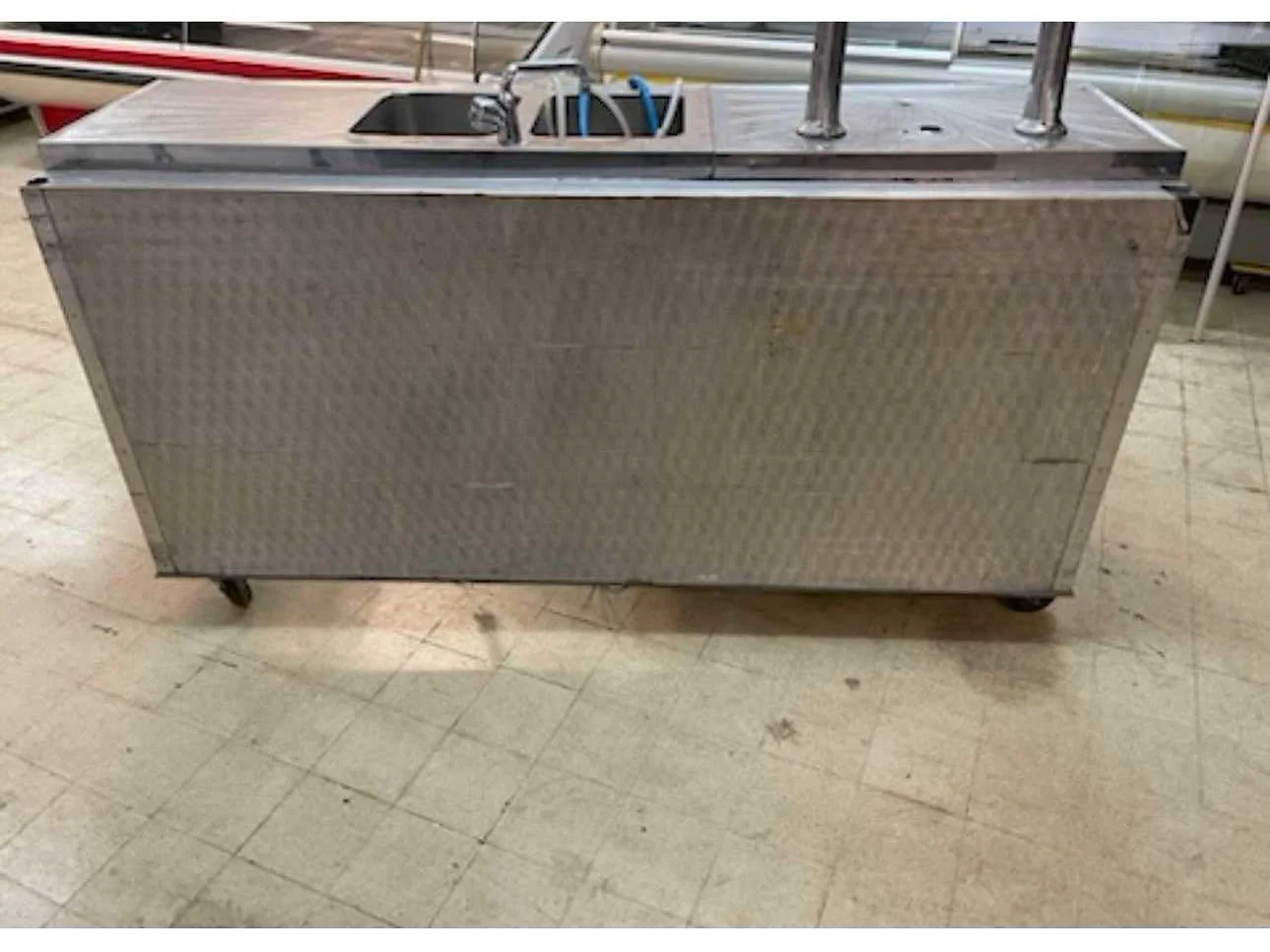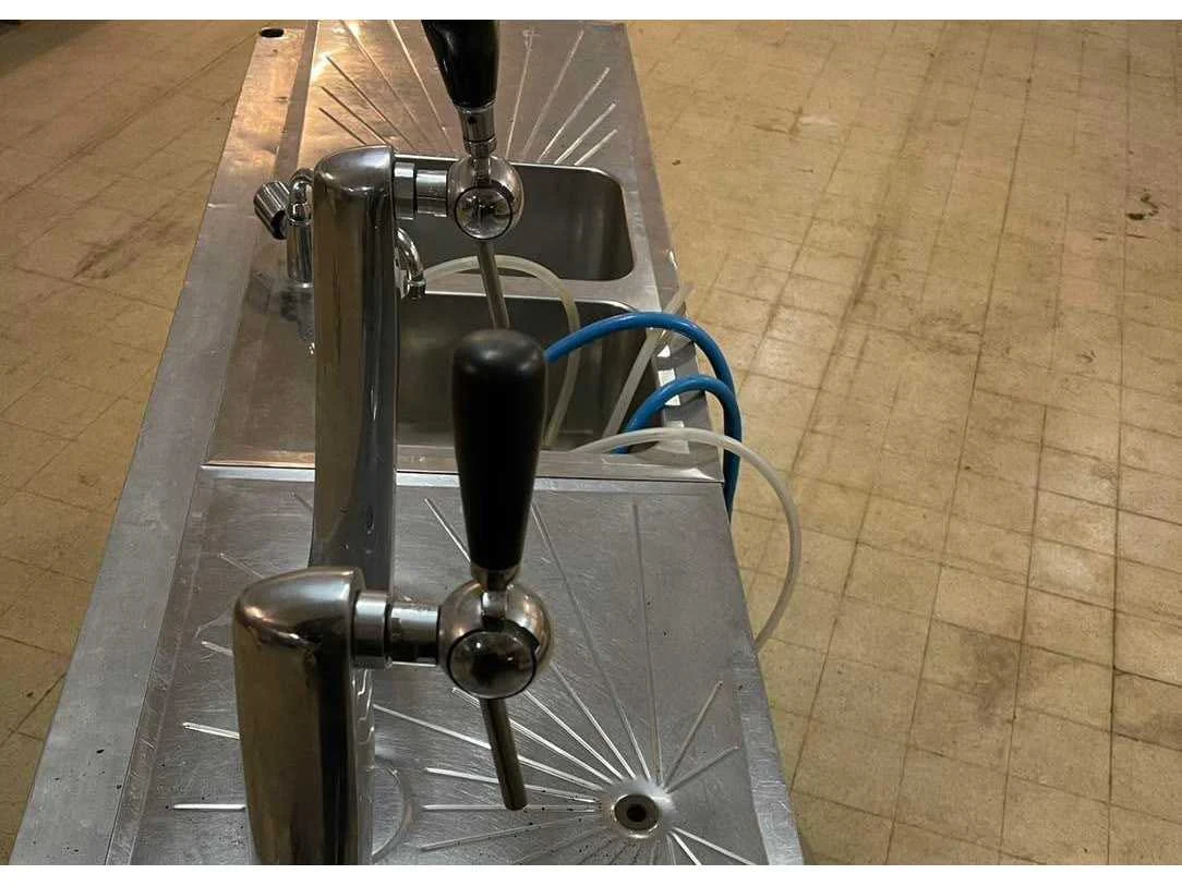 Ondergelopen bar 2M20 lang, gemonteerd op wielen voor gemakkelijk transport - uitgerust met: - Antoine bierkoeler met 2 biertapkolommen (2 koppen) - 2 roestvrijstalen spoelbakken met kraan - RVS ruw werkblad - opslag en doorgangen voor leidingen / eenvoudige installatie Non