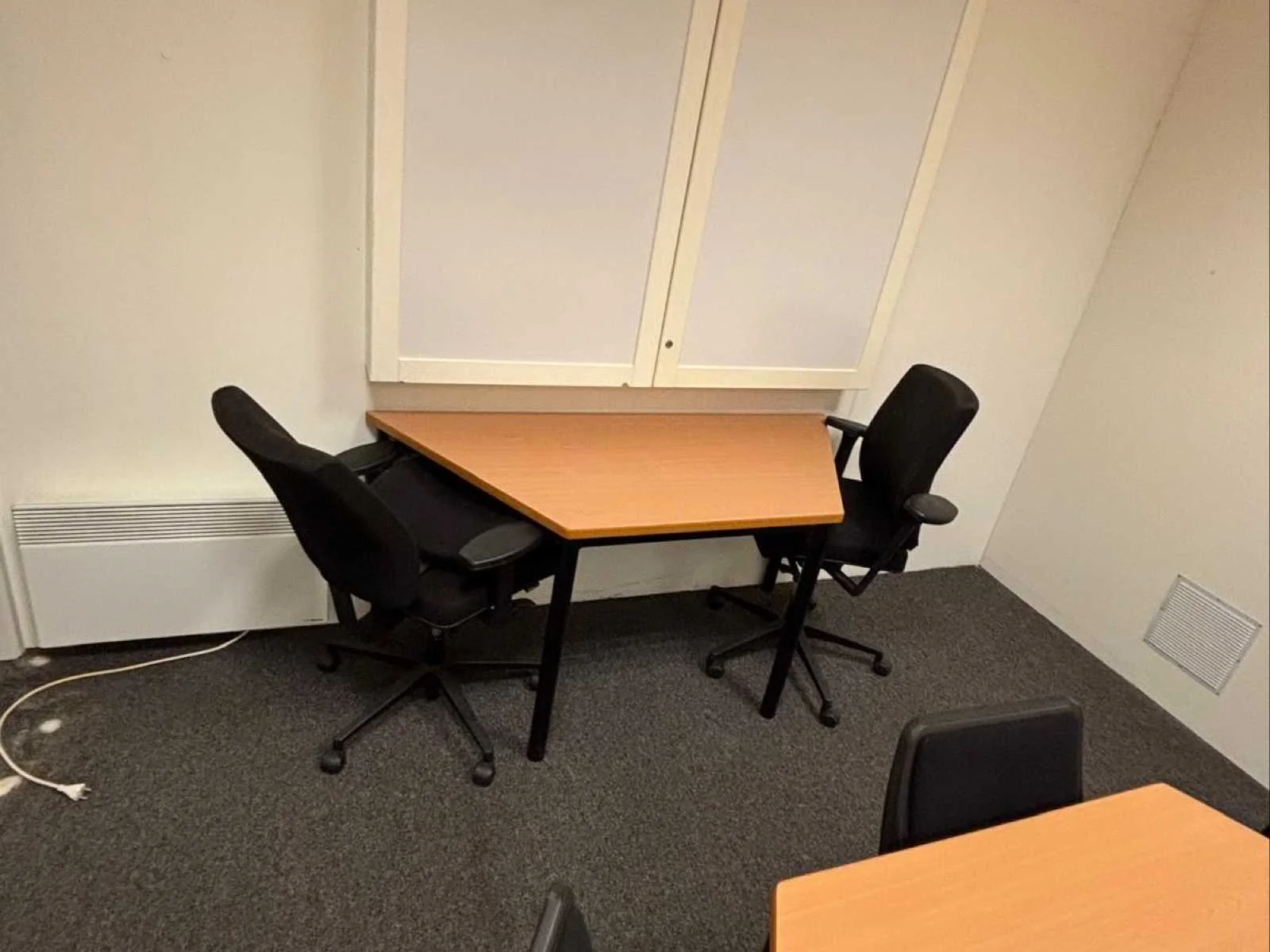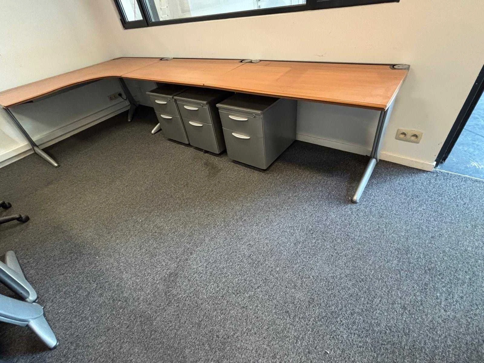 Diverse set bureaus, tafels en stoelen.
