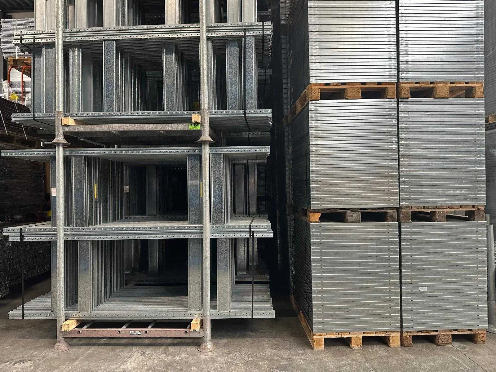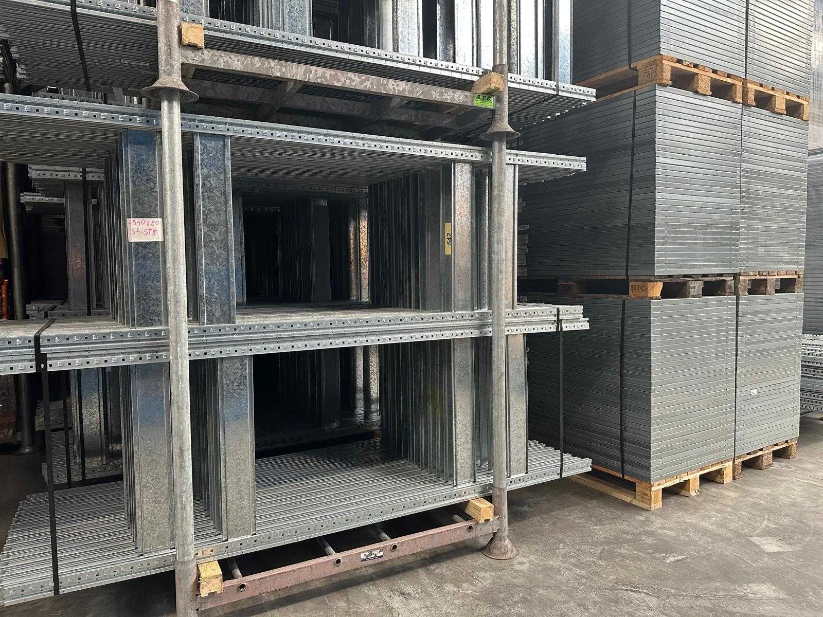 Gebundeld; met schoorset; 12x staander 2495x800mm; 40x legbord 1200x800mm; 7651*12 / 7653*40 Nee Merk: Schäfer Aantal secties: 11 Sectie afm. b: 1200mm Sectie diepte: 800mm Sectie afm. h: 2495mm Aantal staanders: 12 Aantal liggers: 40