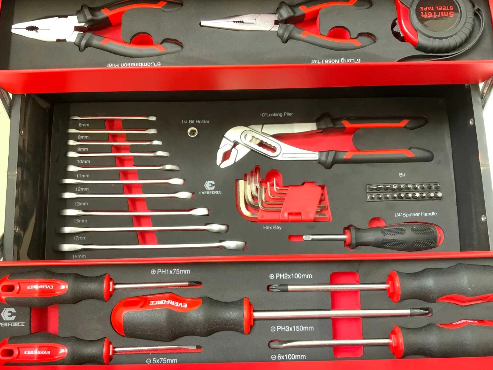 Doppenset 1/4” 4-4.5-5-5.5-6-7-8-9-10-11-12-13; Doppenset 1/2” 10-11-12-13-14-15-16-17-19-20-21-22-23-24-27-30-32; ring steeksleutel 6-8-9-10-11-12-13-15-17-19; bitset; inbussleutel set; tangen; schroevendraaiers; 5m rolmeter; afmeting gereedschapskist gesloten; 470x210x210mm; 5775 Nee Merk: Everforce Type: EF-3201 Metaal: true Afmeting l: 470mm Afmeting b: 210mm Afmeting h: 210mm