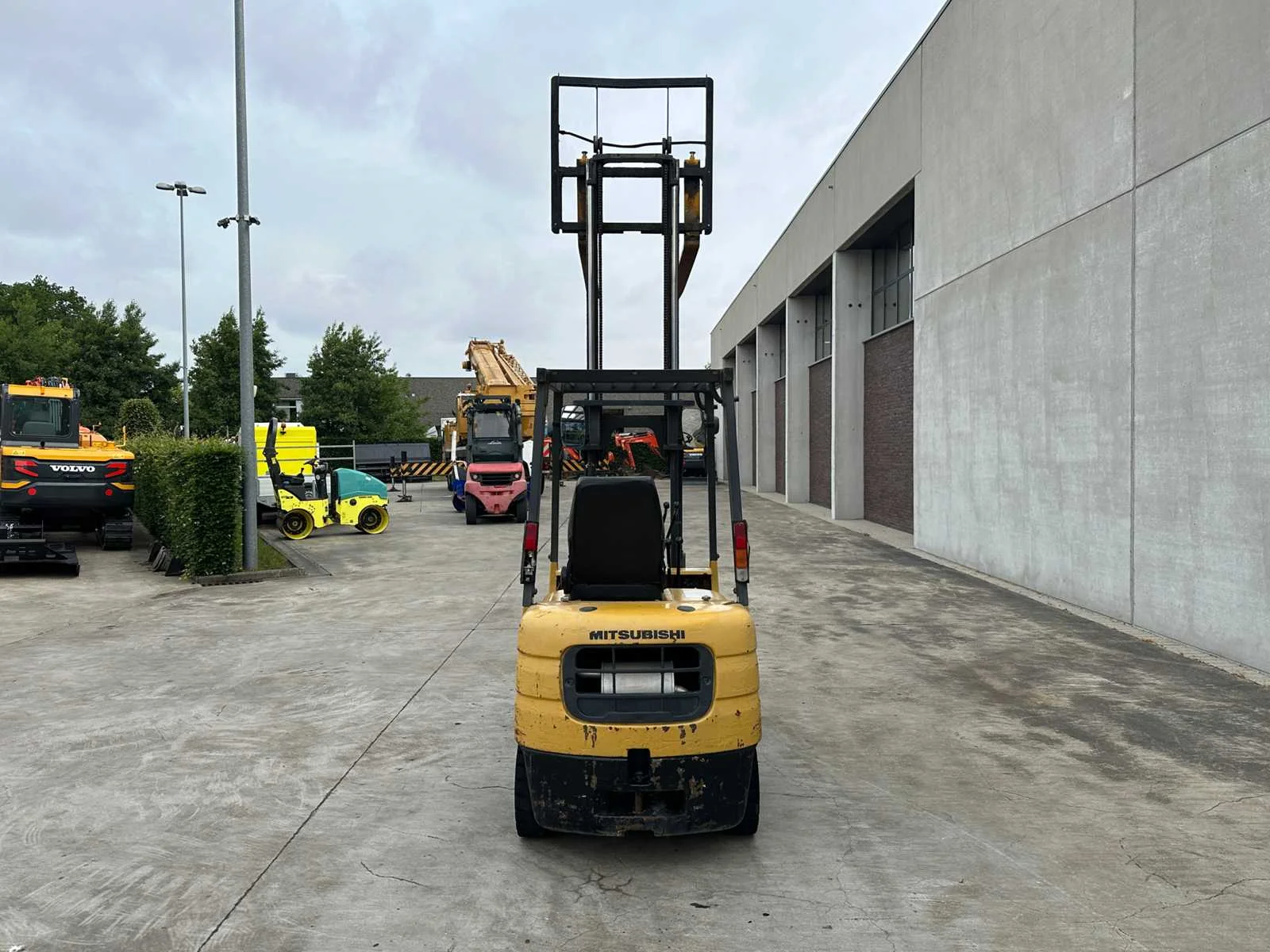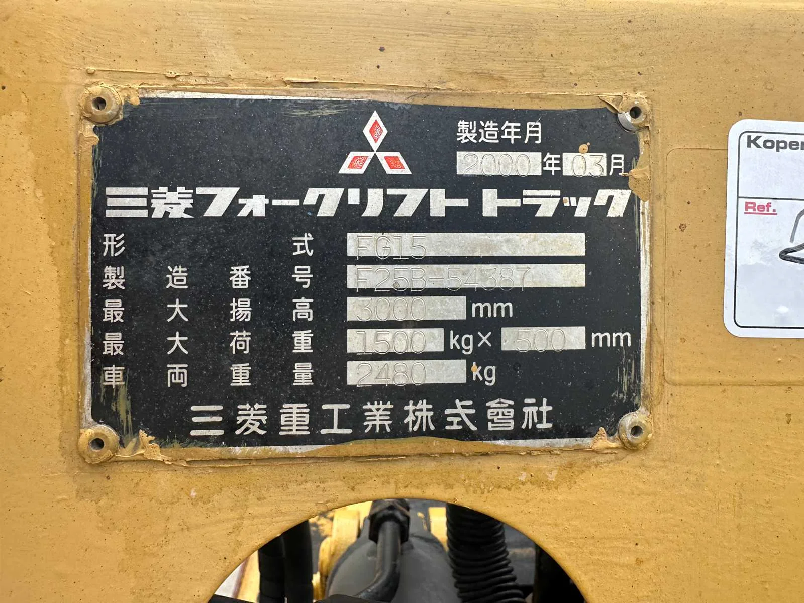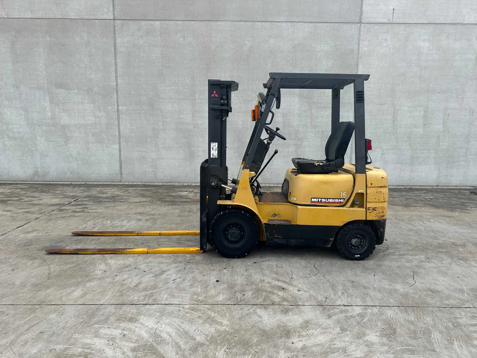 Geen verdere gegevens en documenten No Merk: Mitsubishi Type: FG15 Bouwjaar: 2000 Serienummer: F25B-54387 Brandstof: Benzine Mast: 2-delig Aantal wielen: 4 Afgelezen urenstand: 10036 Duplex mast: true Eigen gewicht: 2480kg Hefvermogen: 1500kg Lepellengte: 1800mm Max. hefhoogte: 3000mm Vol rubber banden: true Totale afmeting L: 2200mm Totale afmeting Breedte: 1050mm Totale afmeting Hoogte: 2000mm