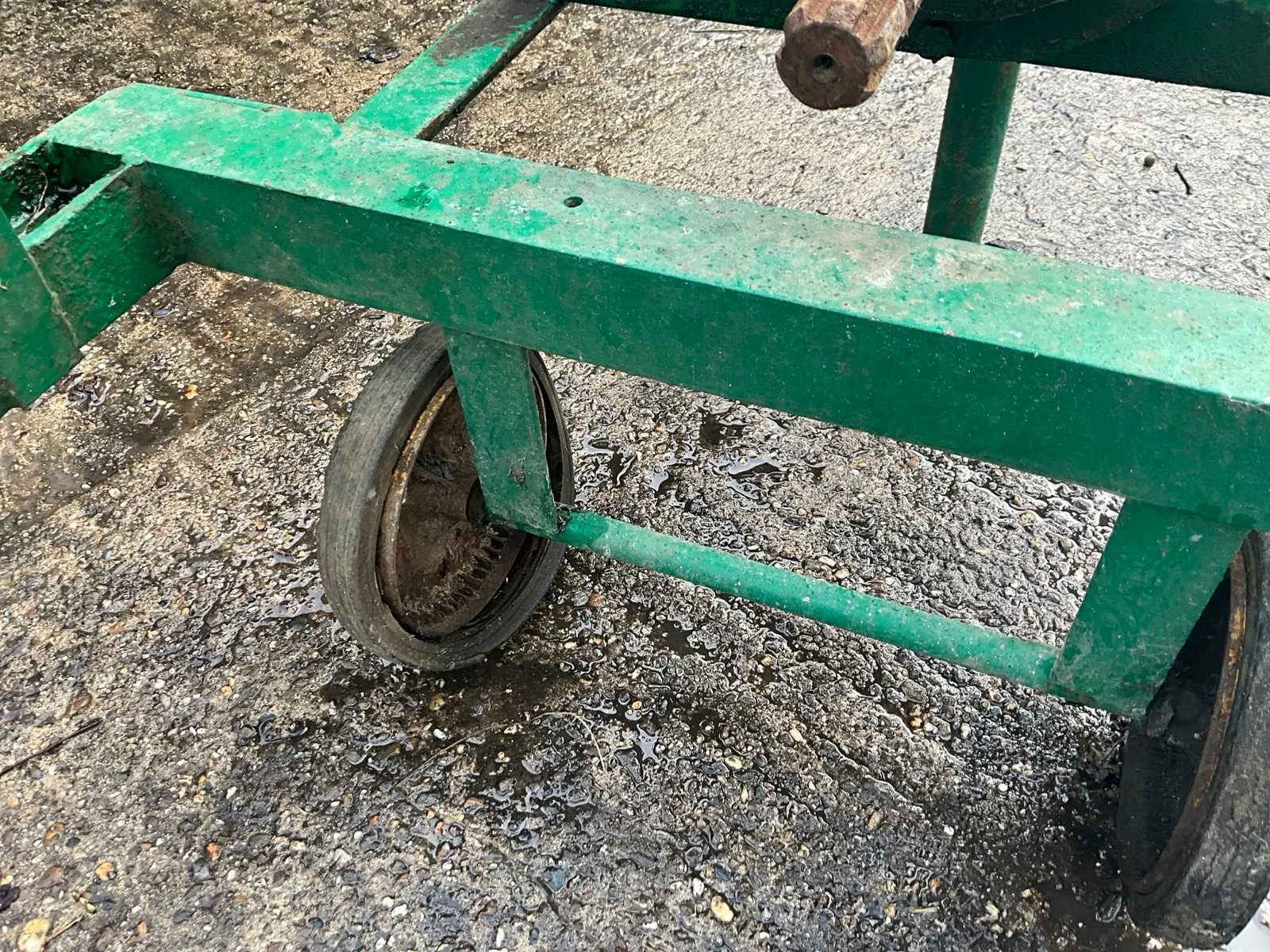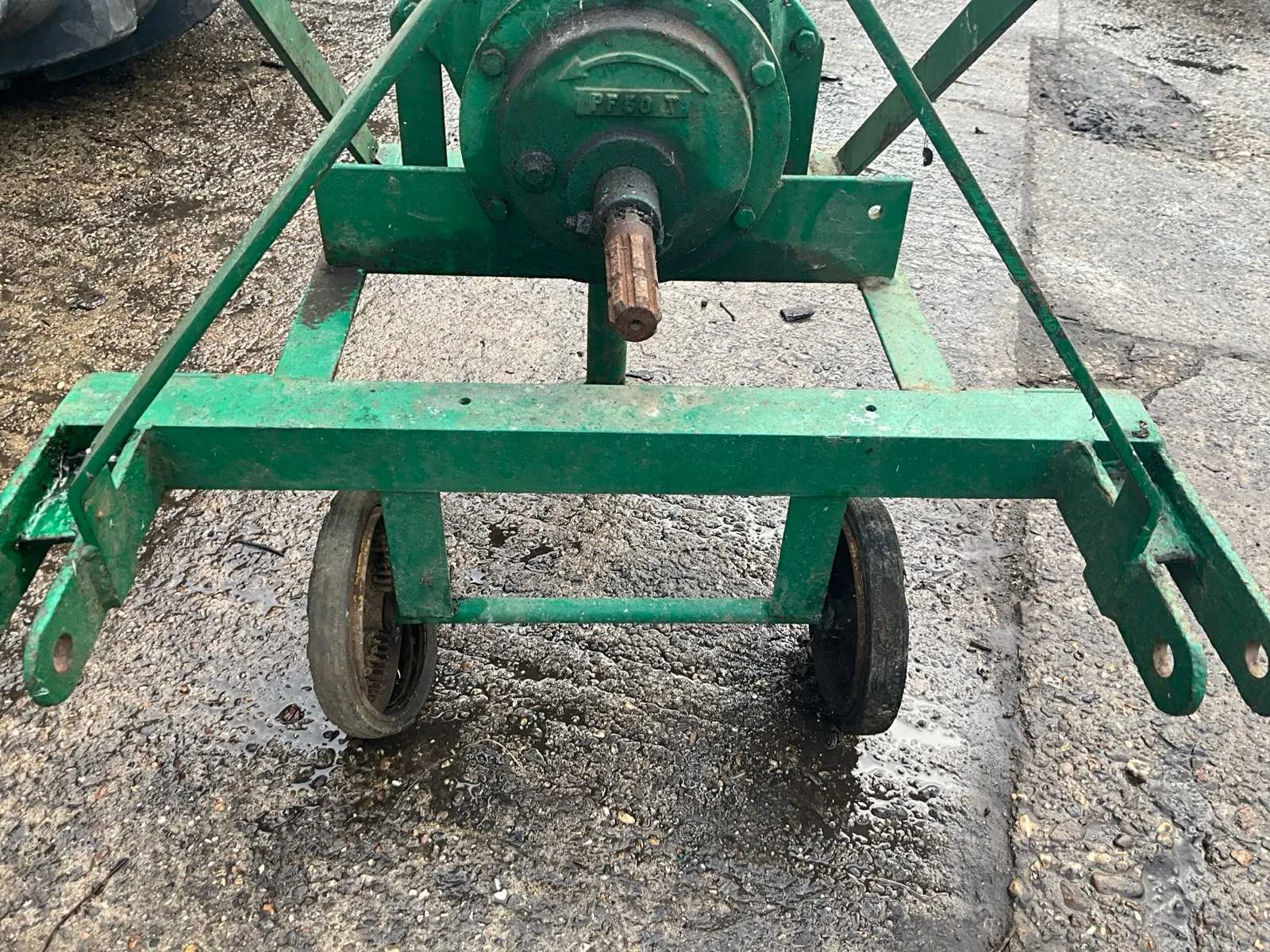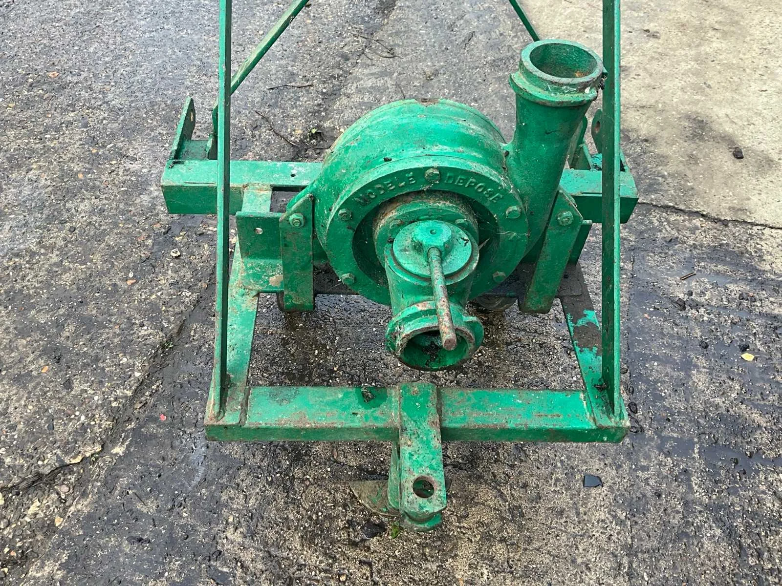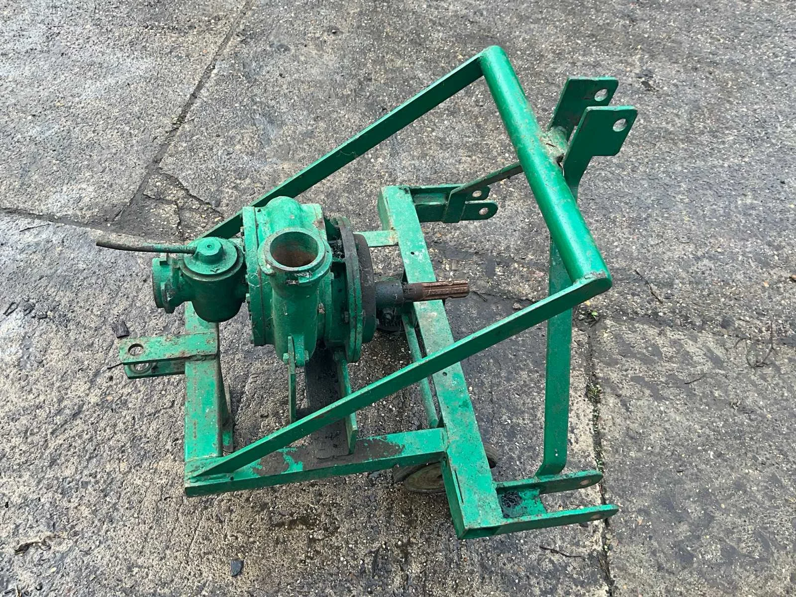 Degelijke waterpomp / irrigatiepomp op verrijdbaar frame, geschikt voor aandrijving via de aftakas (PTO) van een tractor. Gemaakt van gietijzer en staal, zeer robuust uitgevoerd – typisch voor landbouw- en drainagewerk - Inlaatdiameter: ca. Ø 75–100 mm (3–4 inch) Uitlaatdiameter: ca. Ø 75–100 mm (3–4 inch) - 1 wiel met schade Nee