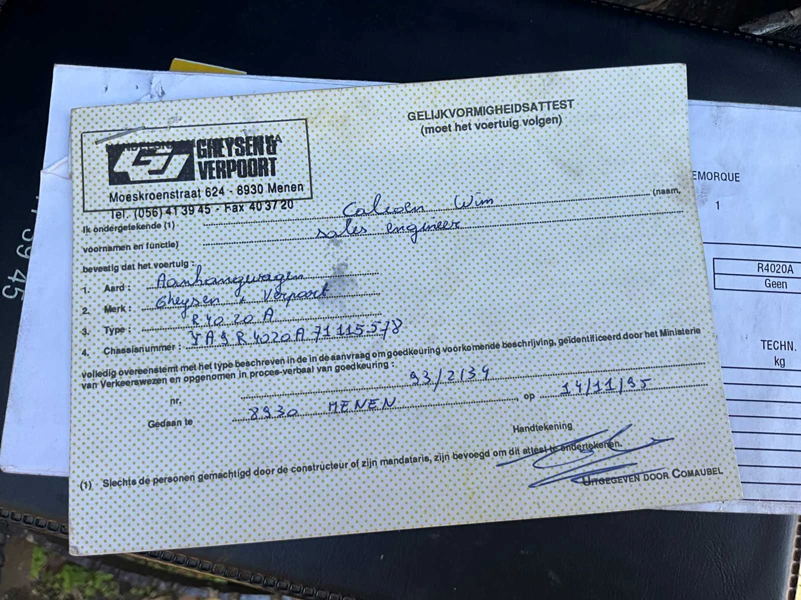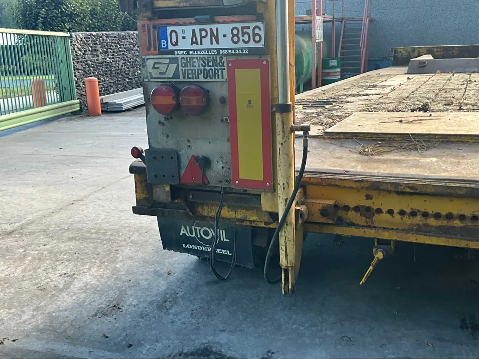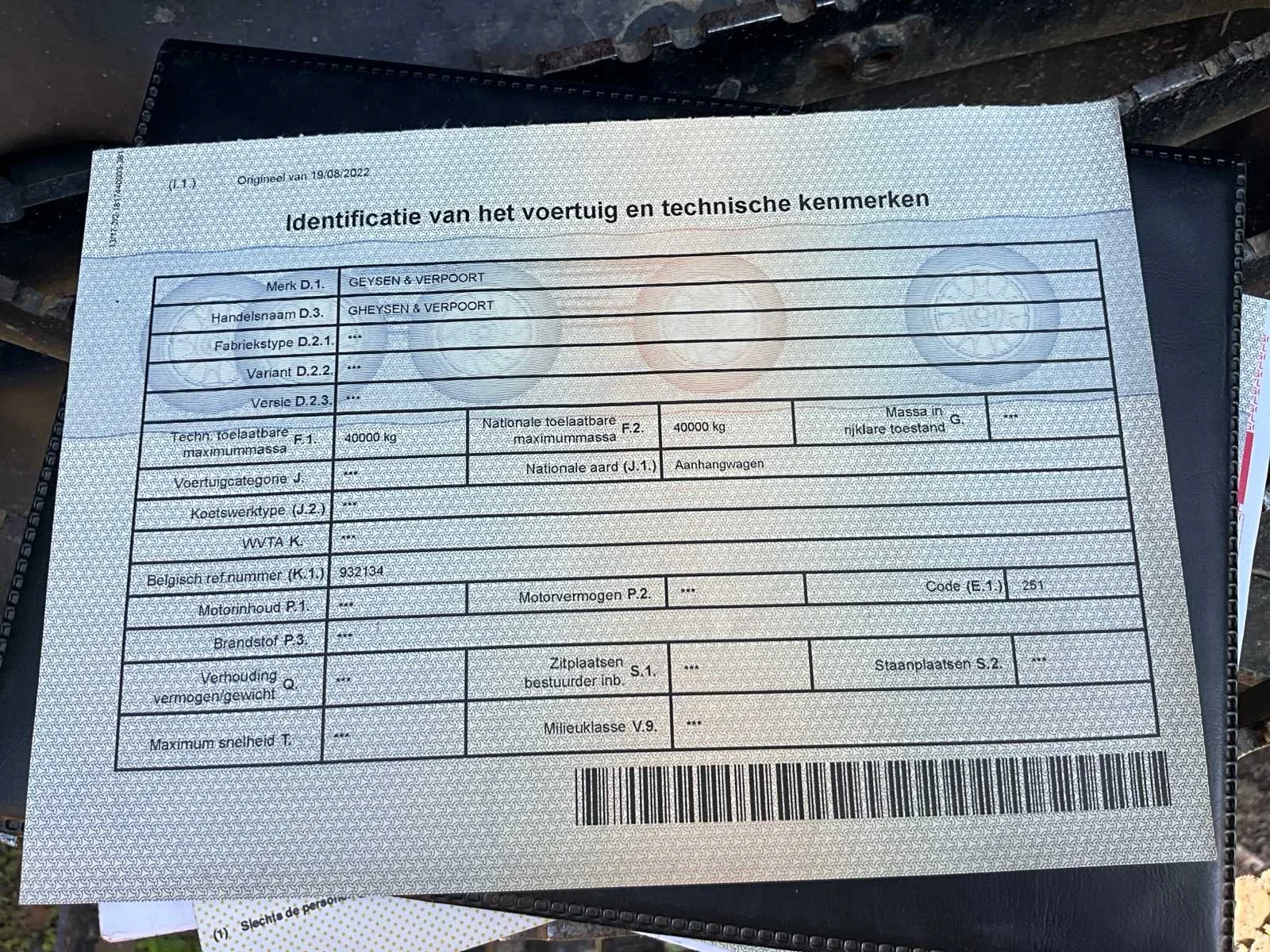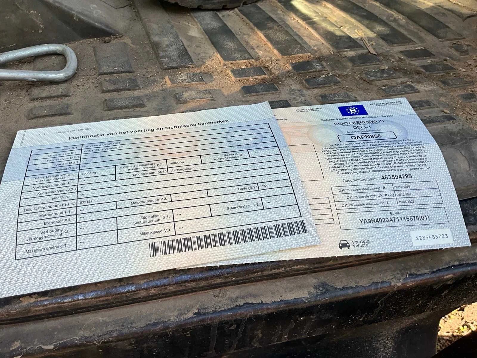 Algemene info dieplader Merk: Gheyssens & Verpoort Type: R 4020 A Model: Dieplader / oplegger Kenteken: QAPN856 Bouwjaar / datum eerste inschrijving: 06/12/1995 Chassisnummer (VIN): YA9R4020A71115578 Type aanhangwagencarrosserie: Dieplader (platte oplegger met oprijrampen) Aantal assen: 3 assen Kleur: Geel Technisch Eigen gewicht (massa in rijklare toestand): niet vermeld, maar geschat ± 9.000 – 10.000 kg Toelaatbaar totaalgewicht (MTM): 40.000 kg Laadvermogen: ± 30.000 – 31.000 kg (afhankelijk van leeggewicht) Aslasten (volgens plaatje): As 1: 10.000 kg As 2: 10.000 kg As 3: 20.000 kg Afmetingen (geschat, gezien de foto’s): Lengte: ± 12,00 m Breedte: ± 2,50 m Hoogte: ± 1,20 m (vloerhoogte, zonder lading) Specifiek APK vervaldatum: n.v.t. (België heeft geen APK-plicht voor opleggers, tenzij NL export). Zelf rijdend exporteren: Nee (oplegger, moet getrokken worden). Hydraulische laadklep: Nee, maar hydraulische oprijrampen aanwezig. Koeltrailer: Nee. Product type: Dieplader oplegger. GS Code (douane): 87163990 (andere aanhangwagens/opleggers voor goederenvervoer). Leveringsvoorwaarden: afhankelijk van verkoop (meestal ex-works). Belangrijk uit papieren Technisch toelaatbare maximummassa: 40.000 kg Nationaal toegelaten maximummassa: 40.000 kg Belgisch refnummer: 932134 Proces-verbaal van goedkeuring: 93/2134 Datum laatste inschrijving: 19/08/2022 Nee Merk: Gheyssens & Verpoort Type: R 4020 A Model: Dieplader / oplegger Bouwjaar: 1995 Chassisnummer: YA9R4020A71115578 Aantal assen: 3 Kleur: Geel Datum eerste toelating: 06/12/1995 GS Code: 87163990
