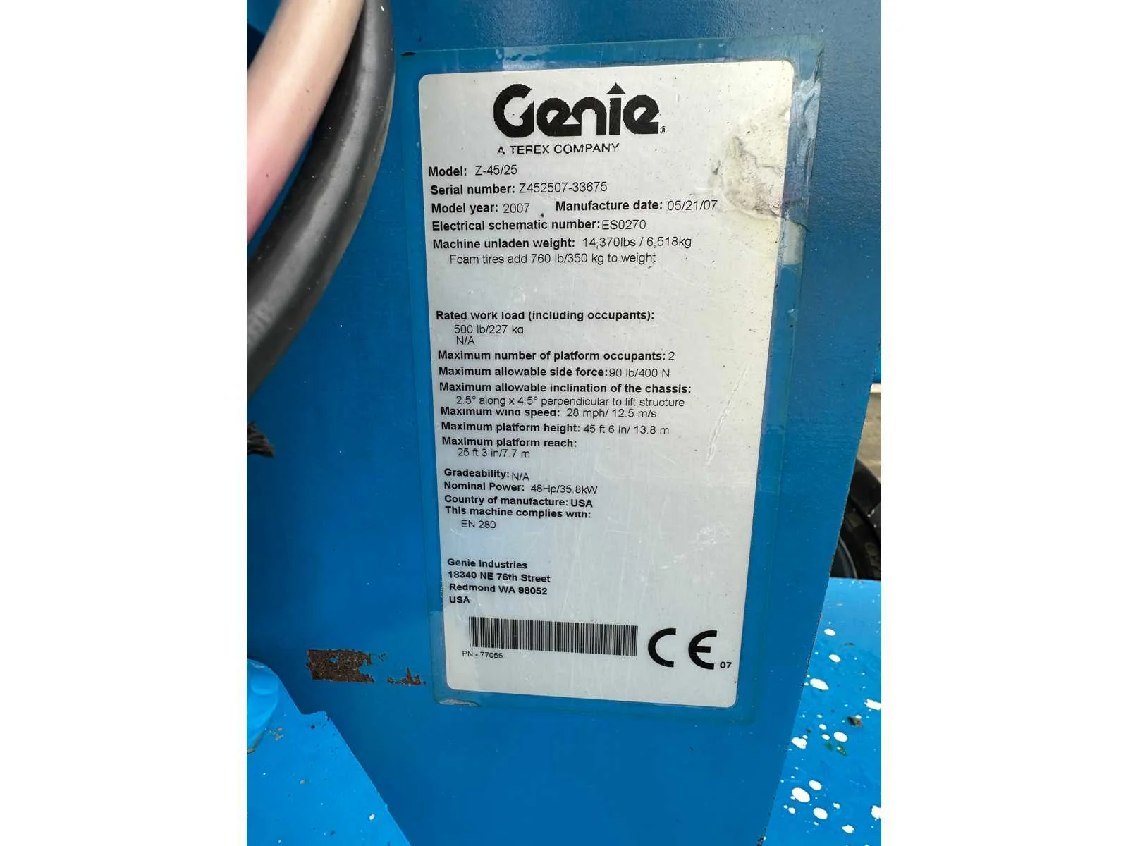 Geen documenten Nee Merk: Genie Type: Z45/25 Bouwjaar: 2007 Serienummer: Z452507-333657 Diesel: true Motorvermogen (kW): 35.8kW Knikarm hoogwerker: true Werkhoogte: 13800mm Plateau afm. l: 1800mm Plateau afm. b: 750mm Platform capaciteit: 227kg Afgelezen urenstand: 971 Eigen gewicht: 6518kg Totale afmeting L: 5600mm Totale afmeting Breedte: 1800mm Totale afmeting Hoogte: 2000mm