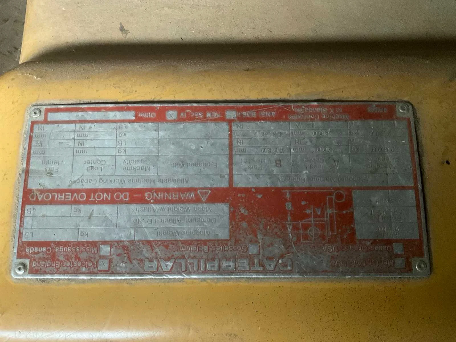 Merk: Caterpillar Model: V50C Capaciteit: ca. 2.250 kg (5.000 lbs) hefvermogen Hefhoogte: standaard ± 3,0 m (verschilt per mastuitvoering) Eigen gewicht: ± 3.500 – 4.000 kg Specificaties Caterpillar V50C Nominaal hefvermogen: 5.000 lbs (≈ 2,27 ton) Load center: 24 inch (600 mm) Motoropties: Benzine/LPG: Mazda/Toyota industriemotoren Dieseloptie mogelijk (Perkins of Isuzu afhankelijk van bouwjaar) Transmissie: Powershift automatische transmissie Besturing: hydraulisch bekrachtigd Mastopties: 2-delige of 3-delige mast (hefhoogtes 3,0 m – 4,5 m) Banden: luchtbanden (ook massieve banden leverbaar) Hydrauliek: bediening via hendels naast de bestuurder Veiligheid: Overhead guard (ROPS) Nee Merk: Caterpillar Type: V50C Afgelezen urenstand: 5268 Ruw terrein: true