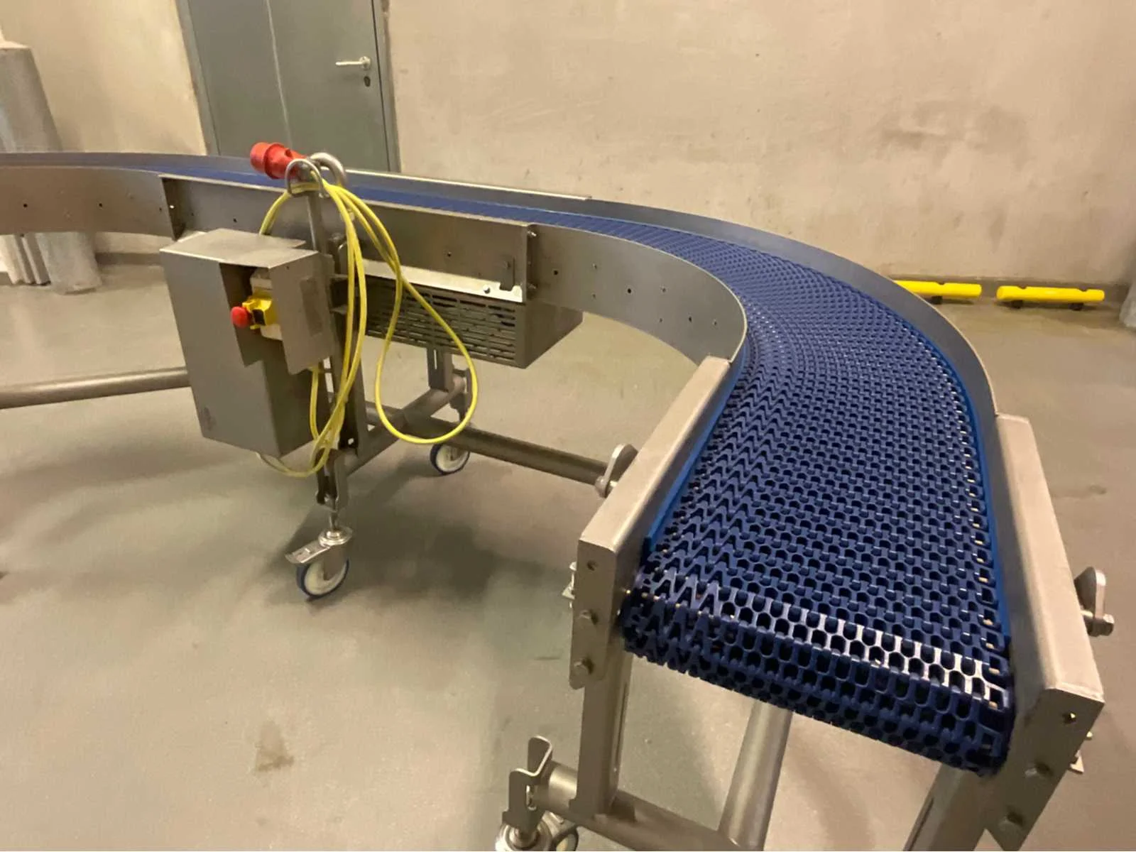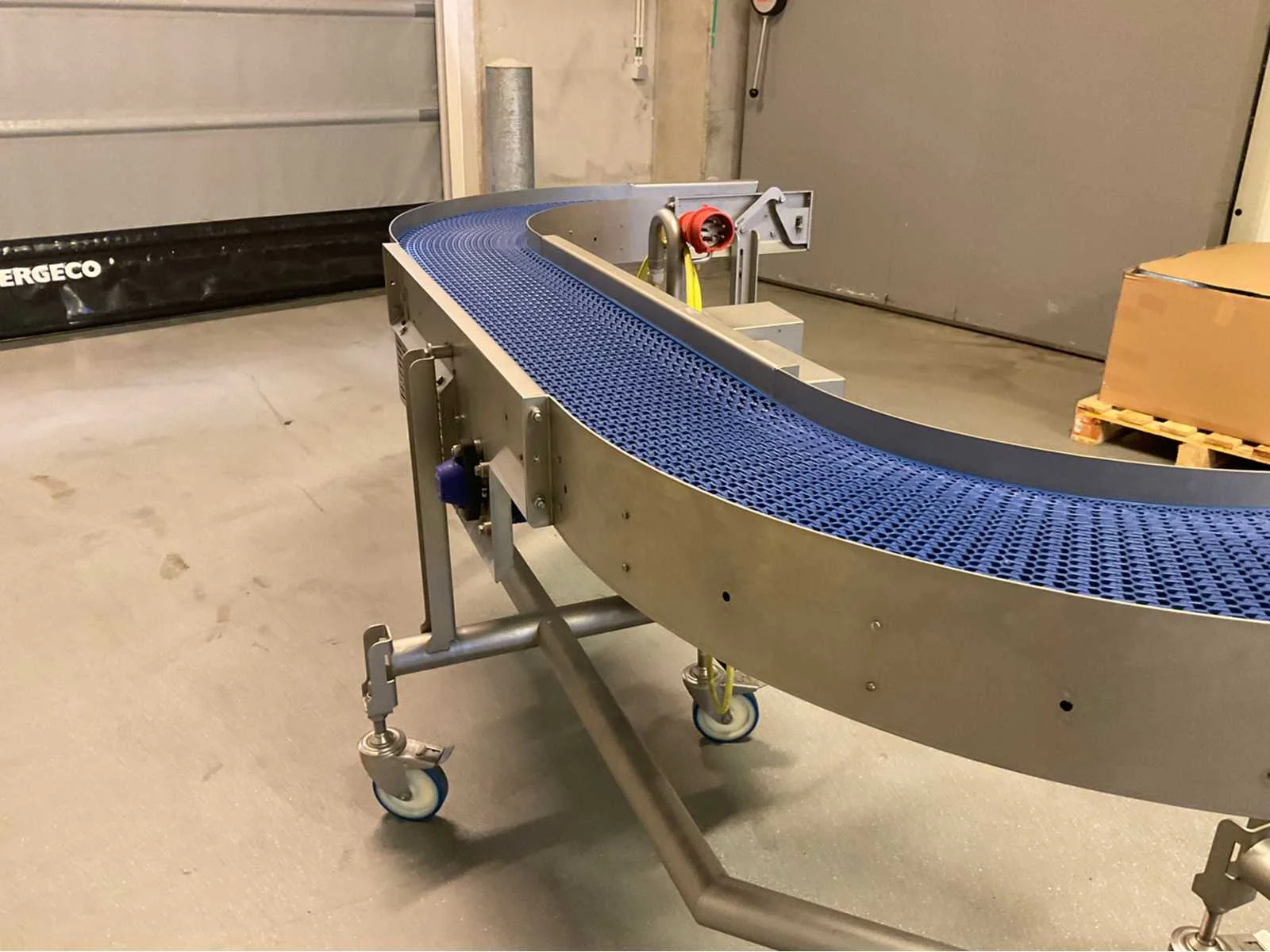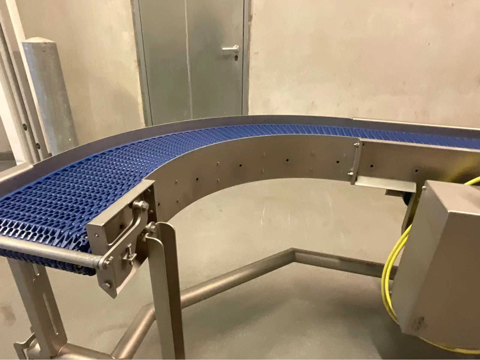 Modular Curved (U) bandtransporteur van Marvu, ontworpen voor het transport van producten in hygiënische omgevingen zoals de voedings-, farmaceutische of logistieke industrie. Volledig roestvrijstalen structuur, met blauwe kunststof modulaire strip en geïntegreerde motorisering. Gemonteerd op zwenkwielen met rem voor eenvoudige verplaatsing en installatieflexibiliteit. In zeer goede algehele staat. Merk: Marvu Materiaal: Roestvrij staal Band: Blauwe plastic modulair Vorm: 90° curve Bruikbare bandbreedte: ca. 350–400 mm Buigradius: ca. 1.000 mm Hoogte: ca. 850 mm Motorisering: Elektrisch, geïntegreerd onder roestvrijstalen behuizing Besturing: RVS behuizing met noodstop Voeding: 400 V driefasig (rode stekker 16A) Montage: Op verrijdbaar frame met zwenkwielen met rem Non Merk: Marvu Bouwjaar: 2018 Band afm. b: 300mm Totale afmeting L: 900mm