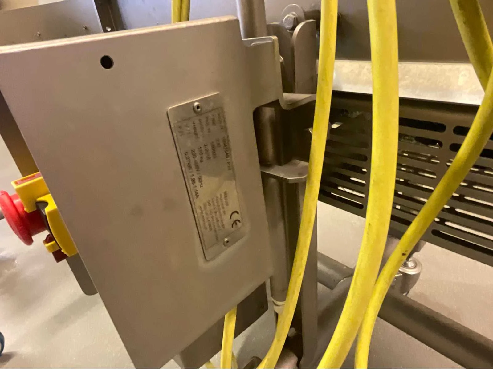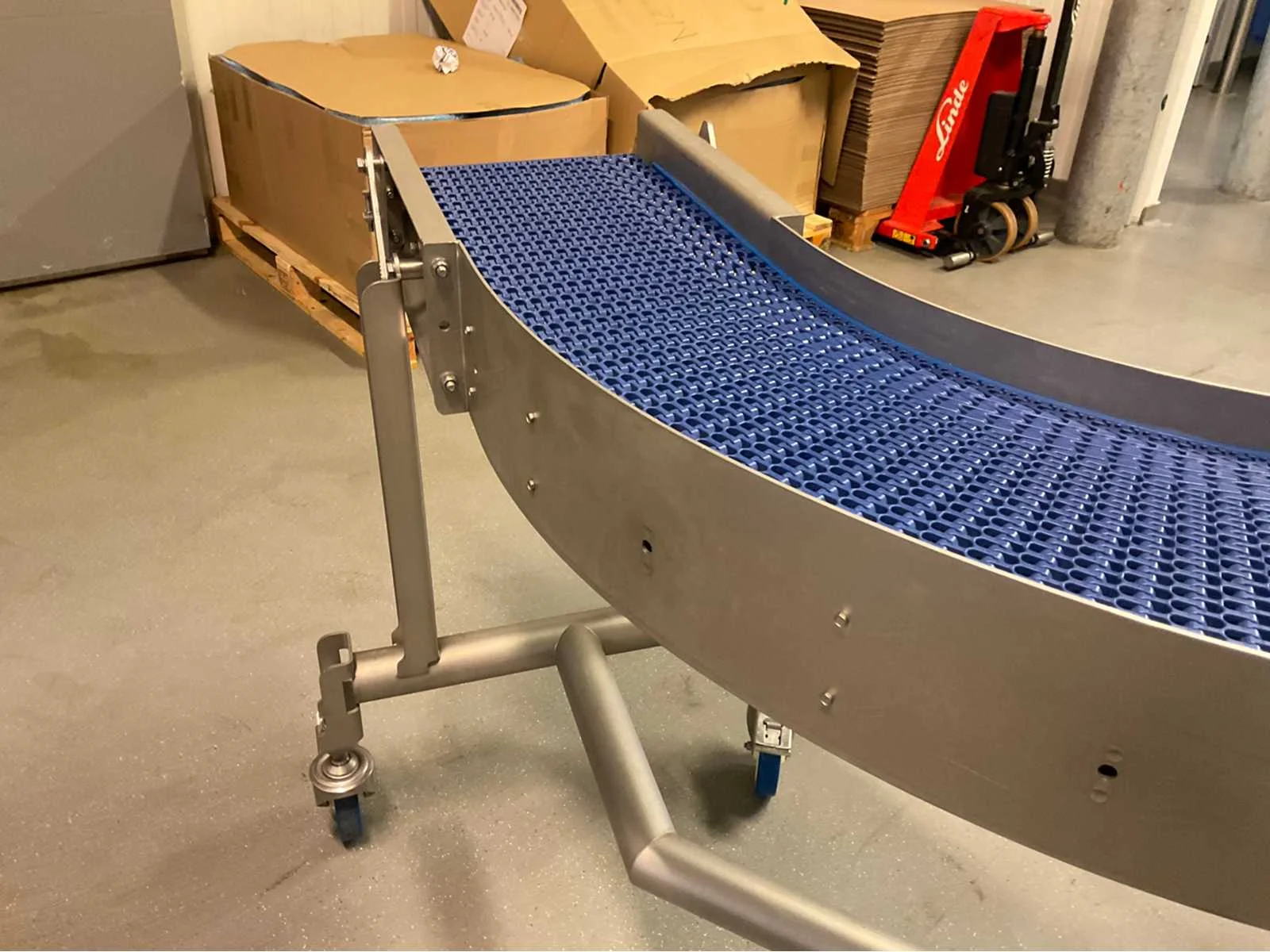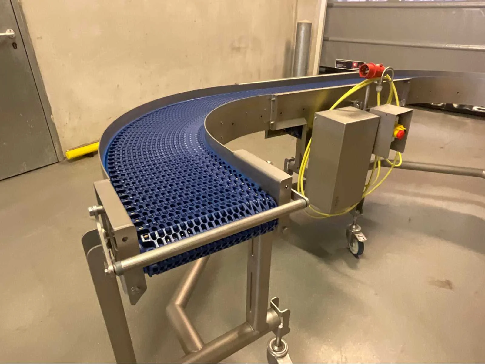 Modular Curved (U) bandtransporteur van Marvu, ontworpen voor het transport van producten in hygiënische omgevingen zoals de voedings-, farmaceutische of logistieke industrie. Volledig roestvrijstalen structuur, met blauwe kunststof modulaire strip en geïntegreerde motorisering. Gemonteerd op zwenkwielen met rem voor eenvoudige verplaatsing en installatieflexibiliteit. In zeer goede algehele staat. Merk: Marvu Materiaal: Roestvrij staal Band: Blauwe plastic modulair Vorm: 90° curve Bruikbare bandbreedte: ca. 350–400 mm Buigradius: ca. 1.000 mm Hoogte: ca. 850 mm Motorisering: Elektrisch, geïntegreerd onder roestvrijstalen behuizing Besturing: RVS behuizing met noodstop Voeding: 400 V driefasig (rode stekker 16A) Montage: Op verrijdbaar frame met zwenkwielen met rem Non Merk: Marvu Bouwjaar: 2018 Band afm. b: 300mm Totale afmeting L: 900mm