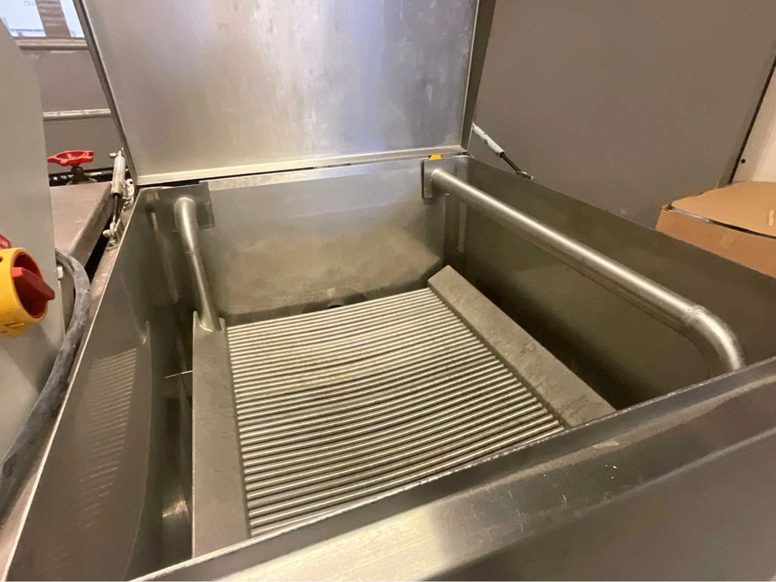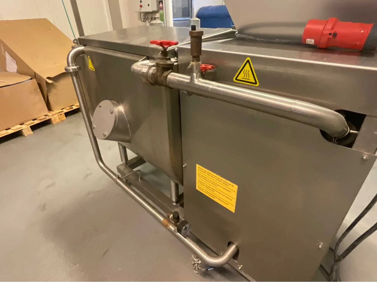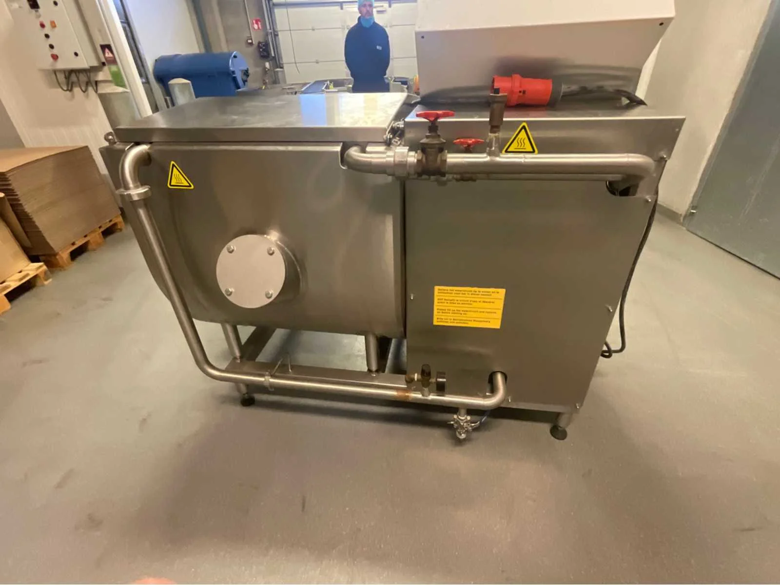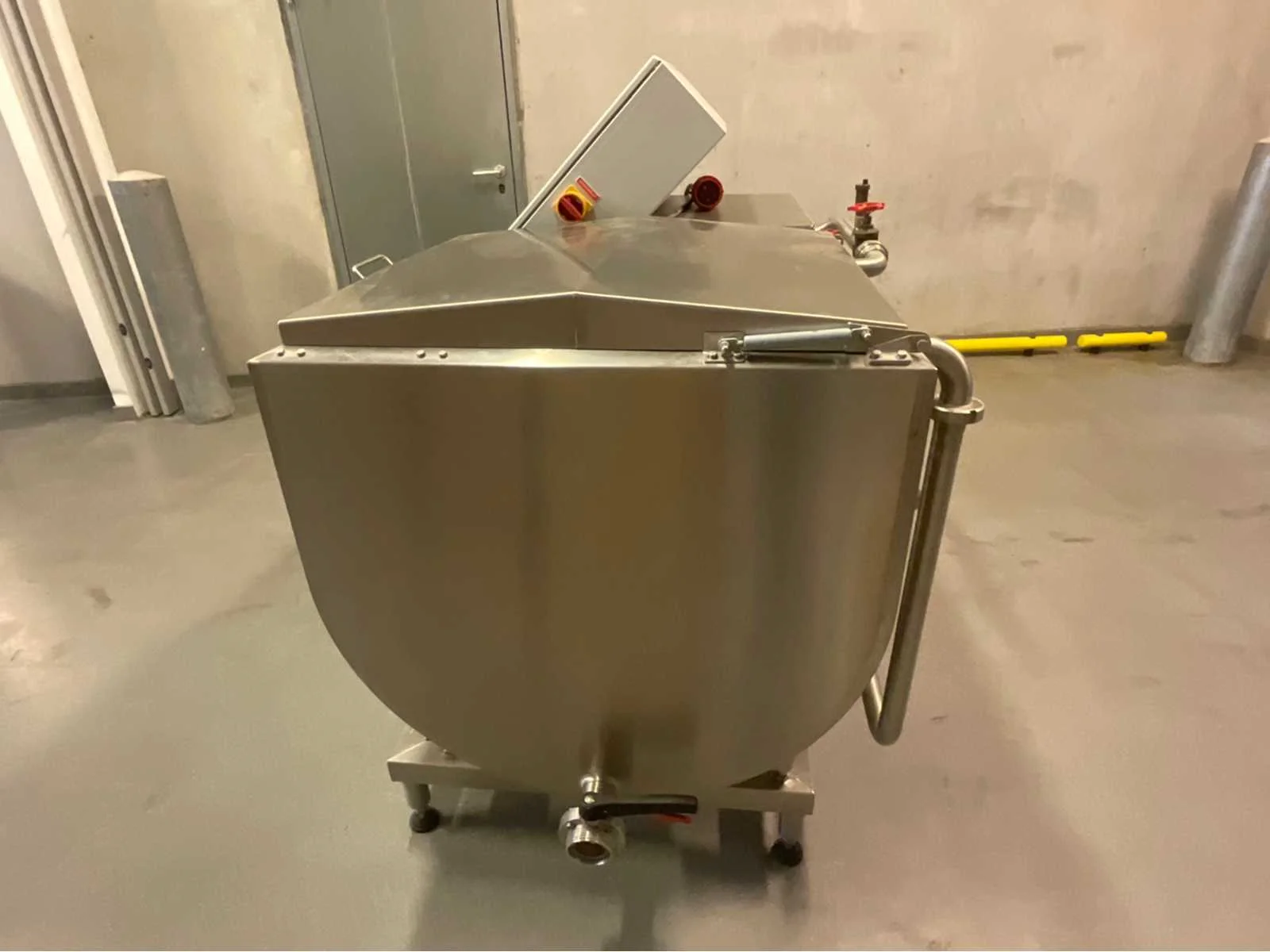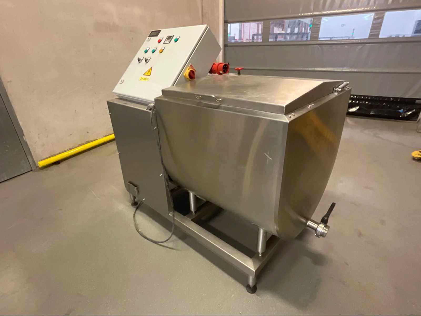 Packo 300 liter RVS smelttank, uitgerust met een elektrisch verwarmingssysteem, een complete schakelkast en een sanitaire klep. In zeer goede staat, ideaal voor boter, margarine of spijsvetten. Inhoud: 300 liter Type: Boter smelttank Constructie: roestvrij staal van voedingskwaliteit Verwarming: Elektrisch – ingebouwde en dubbelwandige weerstand Voedingsspanning: 3 × 400 V + PE Stuurspanning: 230 V Stroomsterkte: 49,1 A – Imax 50 A Bediening: Bedieningspaneel met digitale thermostaat, aan/uit-knoppen, indicatielampjes Type verwarming: Waterbad met interne circulatie Afvoer: RVS kogelkraan met transparant mangat Voeten: Verstelbaar voor nivellering Deksel: Dubbele vleugel met roestvrijstalen handvat Geschatte afmetingen: ca. 160 × 80 × 120 cm (L × B × H) Geschat gewicht: ca. 250–300 kg Werkt perfect Non Merk: Packo Type: Smelt Unit 300 L Bouwjaar: 2011 Serienummer: 175159