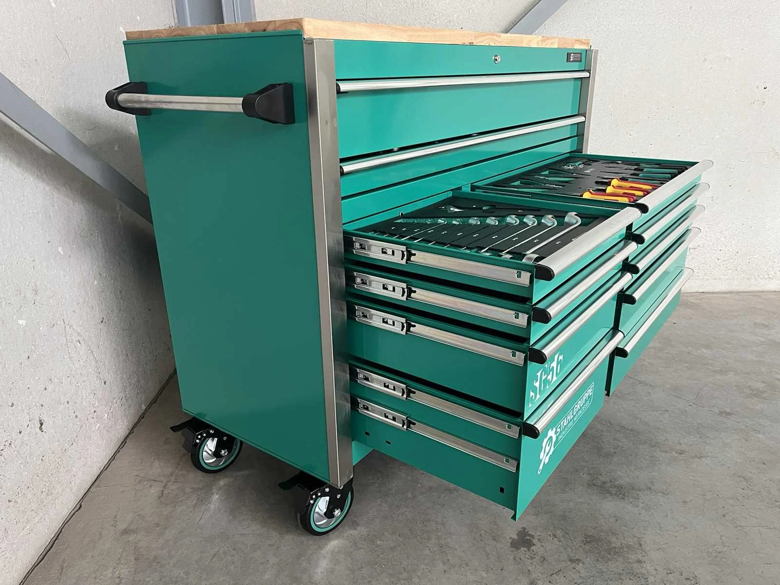 <li><b>Heavy Duty gereedschapswagen</b></li> <li><b>gebruik:</b> voor professionals</li> <li><b>aantal laden:</b> 11 laden</li> <li><b>aantal gevulde laden:</b> 9 gevulde laden</li> <li><b>gereedschap:</b> chroom-vanadium gereedschap</li> <li><b>inhoud:</b> <ul> <li>29-delige ring-steeksleutel set (6 mm - 50 mm)</li> <li>3 ratelsleutel sets met doppen & bitsen (1/4”, 3/8” & 1/2”)</li> <li>11-delige ring-ringsleutel set (6*7 mm - 30*32 mm)</li> <li>verstelbare moersleutel</li> <li>12-delige tangen set</li> <li>2 hamers & 4 vijlen</li> <li>puntslag en beitel set</li> <li>12 schroevendraaiers</li> <li>inbussleutels, Torxsleutels, precisiegereedschap</li> <li>21-delige T-sleutelset</li> <li>34-delige krachtdoppen set (12 mm - 50 mm) + Torx & inbus doppen & ratelsleutel 3/4,”</li> <li>LED-lamp, zaag, schaar, mes, meetgereedschappen</li> <li>enzovoort...</li> </ul> </li> <li><b>staat:</b> ongebruikt, in de originele verpakking</li> <li><b>afmetingen:</b> L 140 x B 60 x H 110 cm</li> Nee Merk: Stahlgruppe Type: SG56